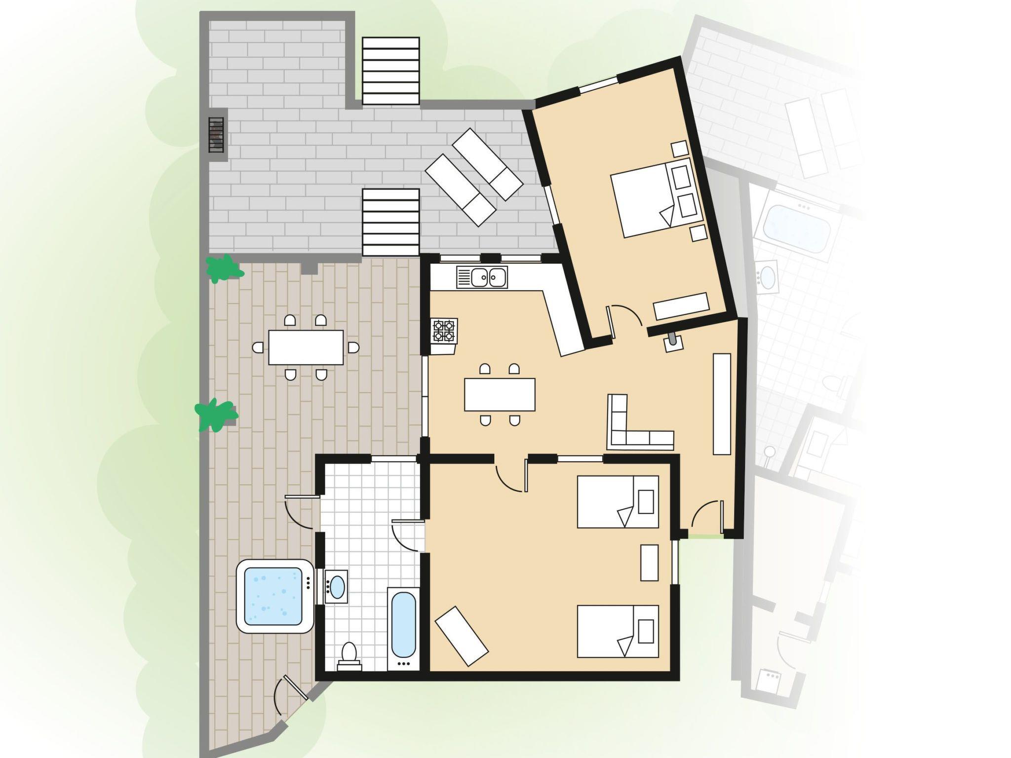 A 40 m² L-shaped covered veranda, which is out of sight, allows you to sit outside in almost any weather. This house is an ideal starting point for hikers.