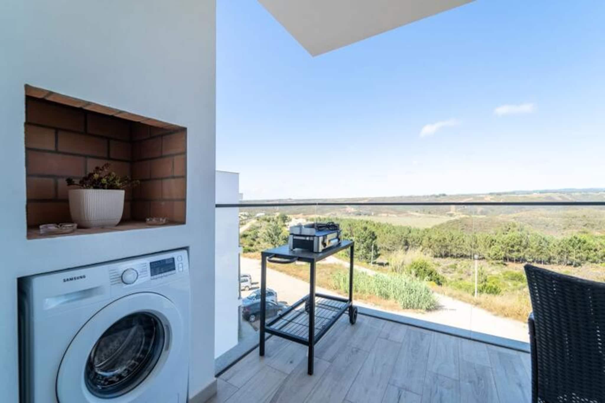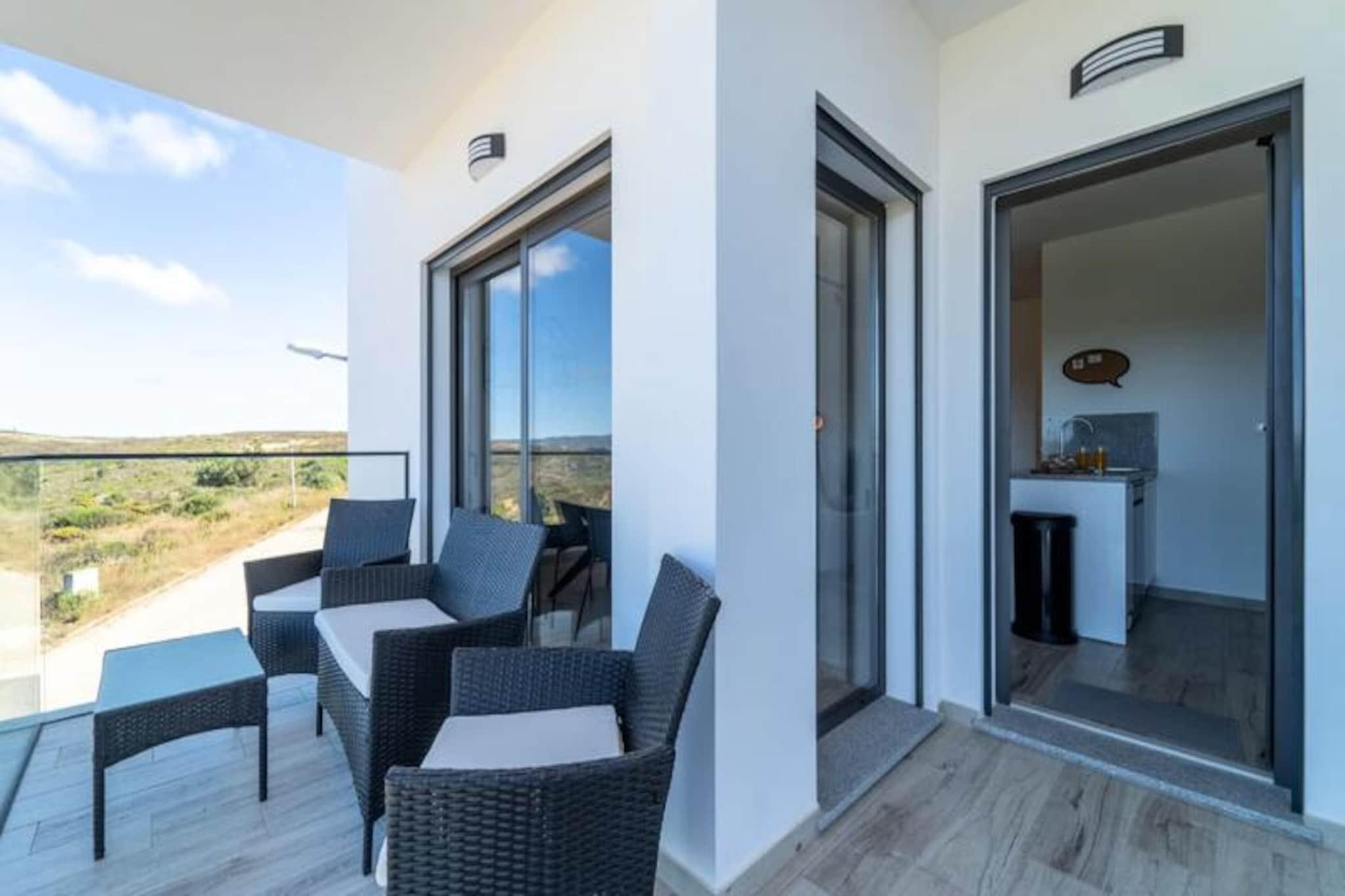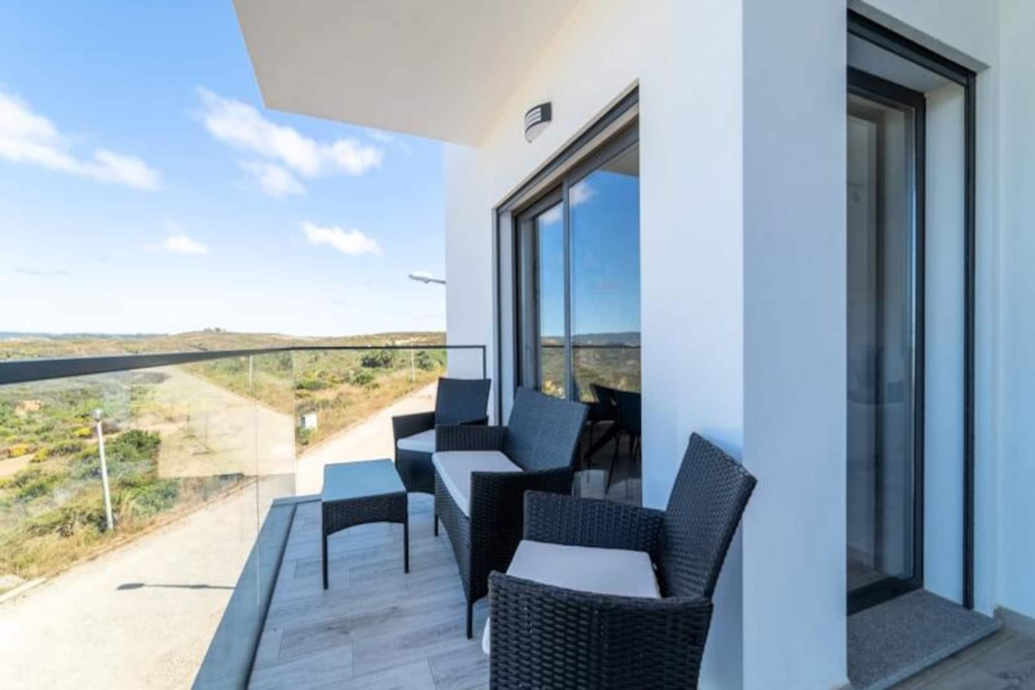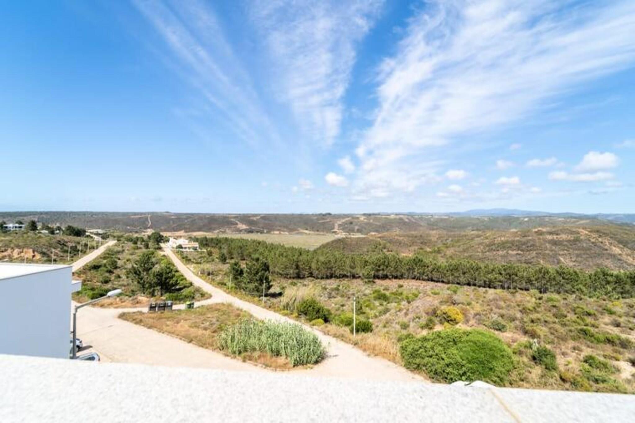 Væk dine sanser i denne fredfyldte lejlighed med 2 soveværelser og 2 badeværelser, der ligger i udkanten af ??Portugals betagende naturpark Costa Vicentina. Med panoramaudsigt over Amoreira-floden og vådområderne tilbyder dette tilflugtssted en perfekt blanding af ro og naturlig skønhed. Kun en kort gåtur fra den Blå Flag-belønnede Monte Clérigo-strand og den uberørte Amoreira-strand, vil du finde dig selv fordybet i den uspolerede charme på Algarves vestkyst. Uanset om det er den gyldne glød fra solopgangen eller de brændende nuancer fra solnedgangen, giver de to terrasser en plads på forreste række til naturens daglige skue. \n\nIndenfor er lejligheden omhyggeligt designet til komfort og stil. Soveværelset har et en-suite badeværelse med badekar og bidet, mens begge soveværelser er udsmykket med queensize-senge, luksuriøst portugisisk sengetøj og originale kunstværker af en lokal kunstner. Stuen indbyder til afslapning med sin bløde sovesofa og 50\
