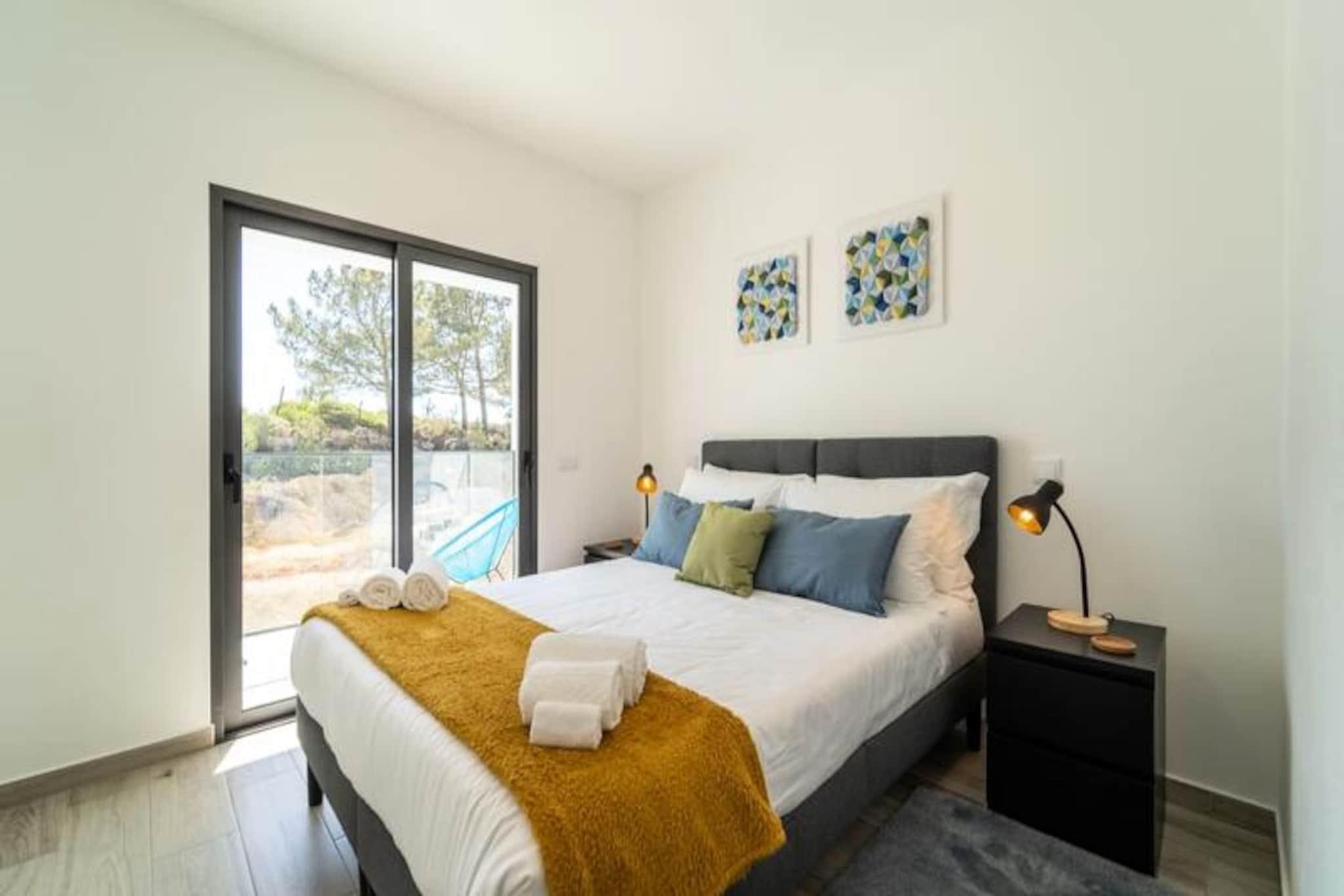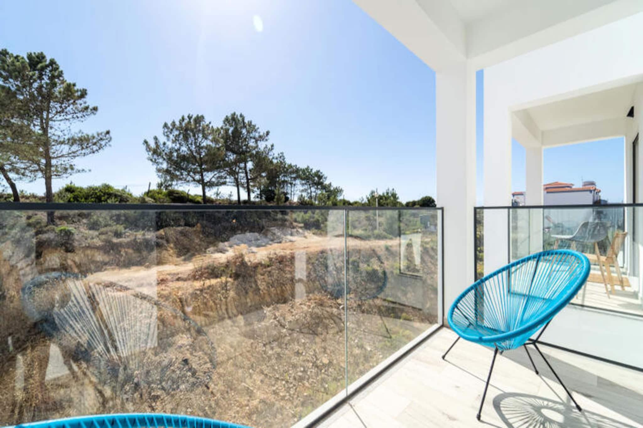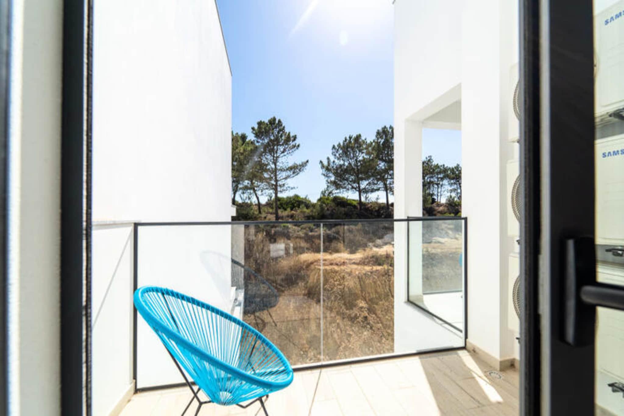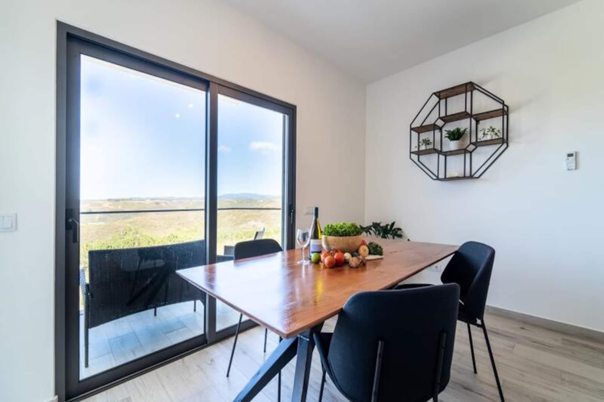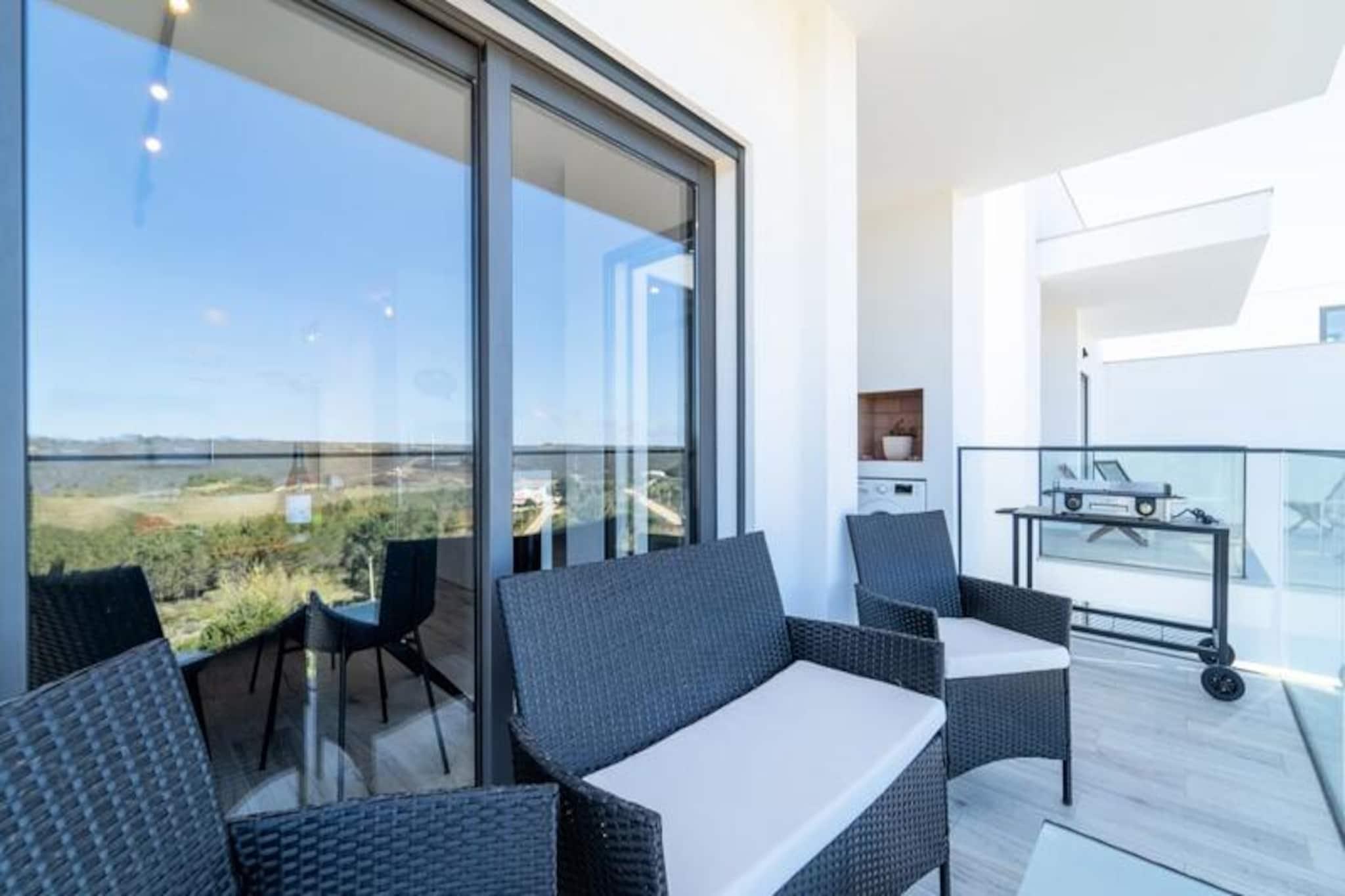 Væk dine sanser i denne fredfyldte lejlighed med 2 soveværelser og 2 badeværelser, der ligger i udkanten af ??Portugals betagende naturpark Costa Vicentina. Med panoramaudsigt over Amoreira-floden og vådområderne tilbyder dette tilflugtssted en perfekt blanding af ro og naturlig skønhed. Kun en kort gåtur fra den Blå Flag-belønnede Monte Clérigo-strand og den uberørte Amoreira-strand, vil du finde dig selv fordybet i den uspolerede charme på Algarves vestkyst. Uanset om det er den gyldne glød fra solopgangen eller de brændende nuancer fra solnedgangen, giver de to terrasser en plads på forreste række til naturens daglige skue. \n\nIndenfor er lejligheden omhyggeligt designet til komfort og stil. Soveværelset har et en-suite badeværelse med badekar og bidet, mens begge soveværelser er udsmykket med queensize-senge, luksuriøst portugisisk sengetøj og originale kunstværker af en lokal kunstner. Stuen indbyder til afslapning med sin bløde sovesofa og 50\