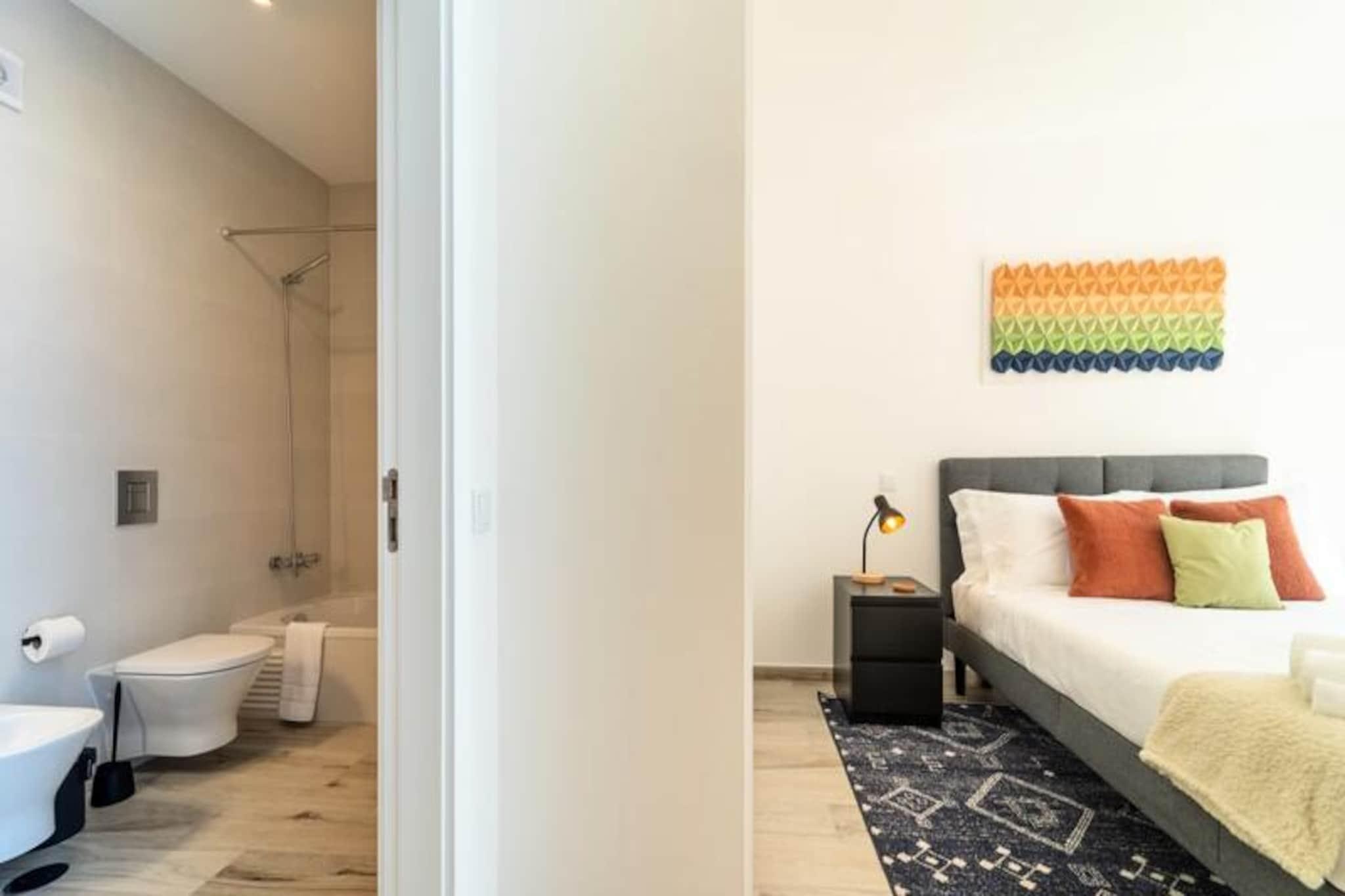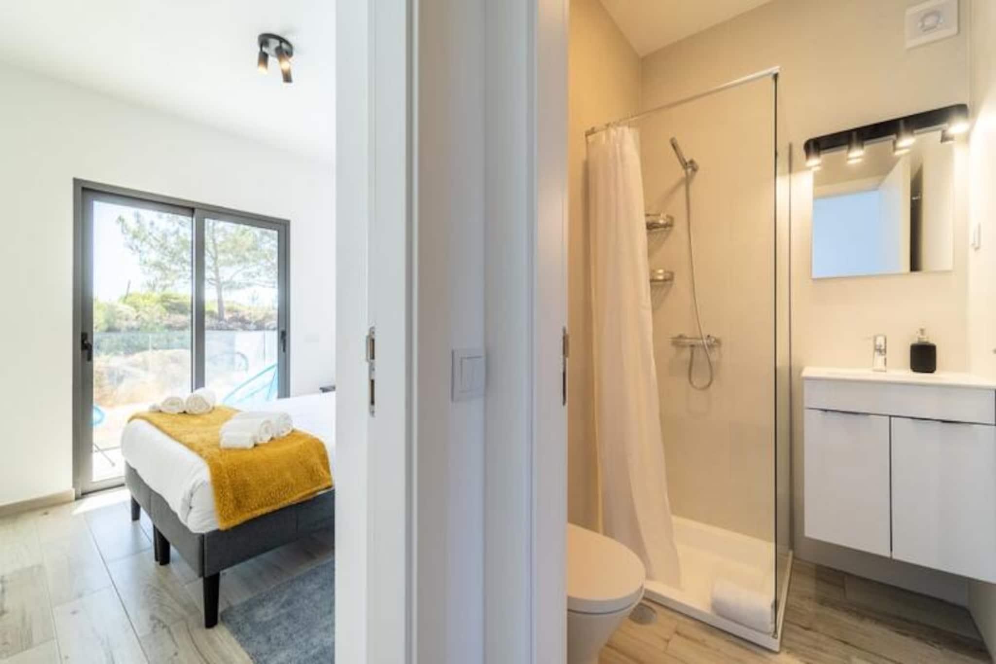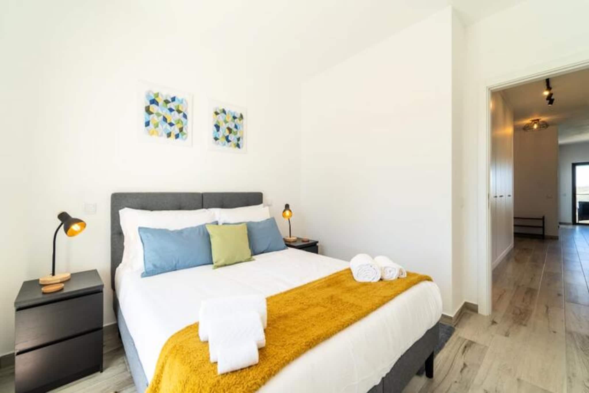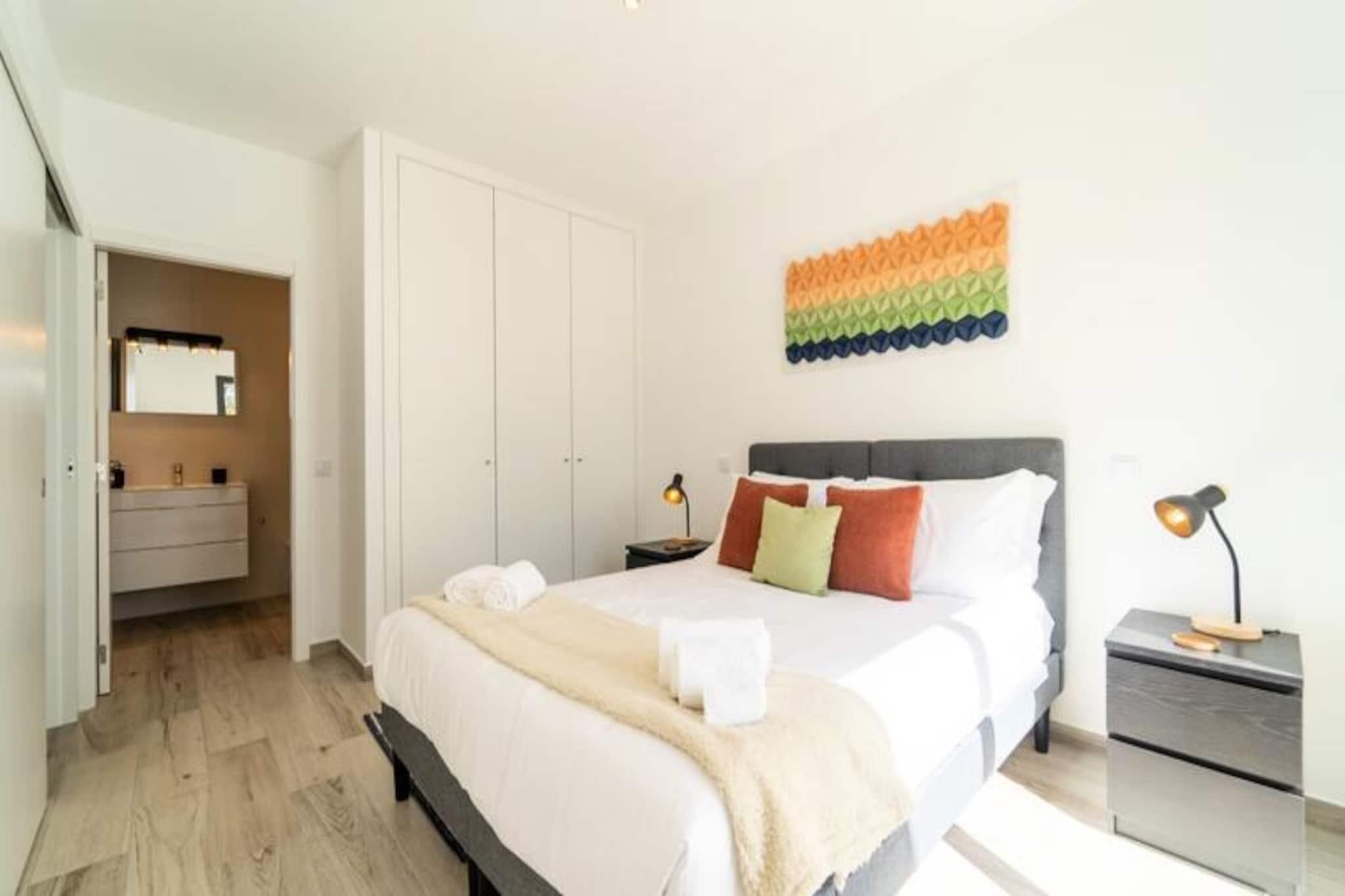 Væk dine sanser i denne fredfyldte lejlighed med 2 soveværelser og 2 badeværelser, der ligger i udkanten af ??Portugals betagende naturpark Costa Vicentina. Med panoramaudsigt over Amoreira-floden og vådområderne tilbyder dette tilflugtssted en perfekt blanding af ro og naturlig skønhed. Kun en kort gåtur fra den Blå Flag-belønnede Monte Clérigo-strand og den uberørte Amoreira-strand, vil du finde dig selv fordybet i den uspolerede charme på Algarves vestkyst. Uanset om det er den gyldne glød fra solopgangen eller de brændende nuancer fra solnedgangen, giver de to terrasser en plads på forreste række til naturens daglige skue. \n\nIndenfor er lejligheden omhyggeligt designet til komfort og stil. Soveværelset har et en-suite badeværelse med badekar og bidet, mens begge soveværelser er udsmykket med queensize-senge, luksuriøst portugisisk sengetøj og originale kunstværker af en lokal kunstner. Stuen indbyder til afslapning med sin bløde sovesofa og 50\