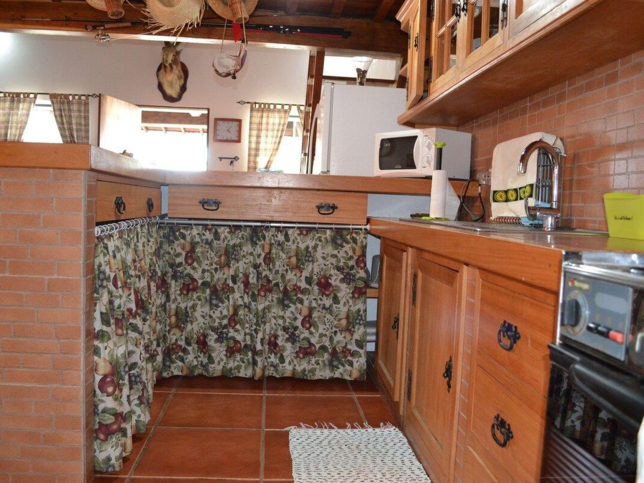 This rustic T2 house has a bedroom with plasma TV and a kitchenette complete with fridge, microwave, toaster, coffee maker, tea and other kitchen utensils.