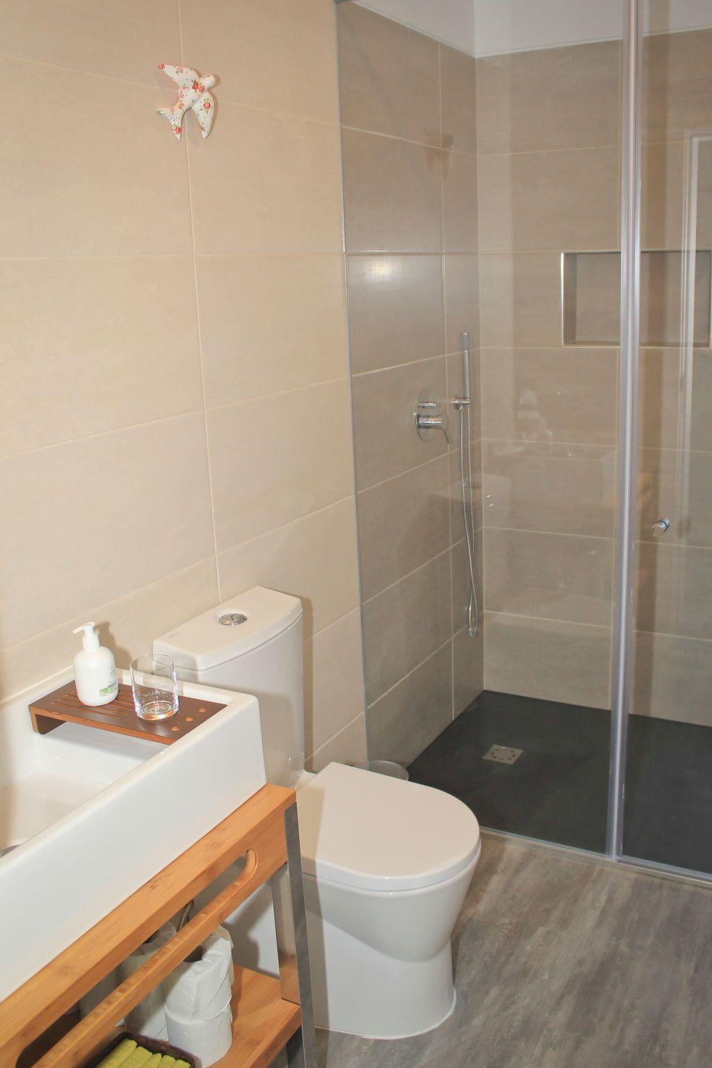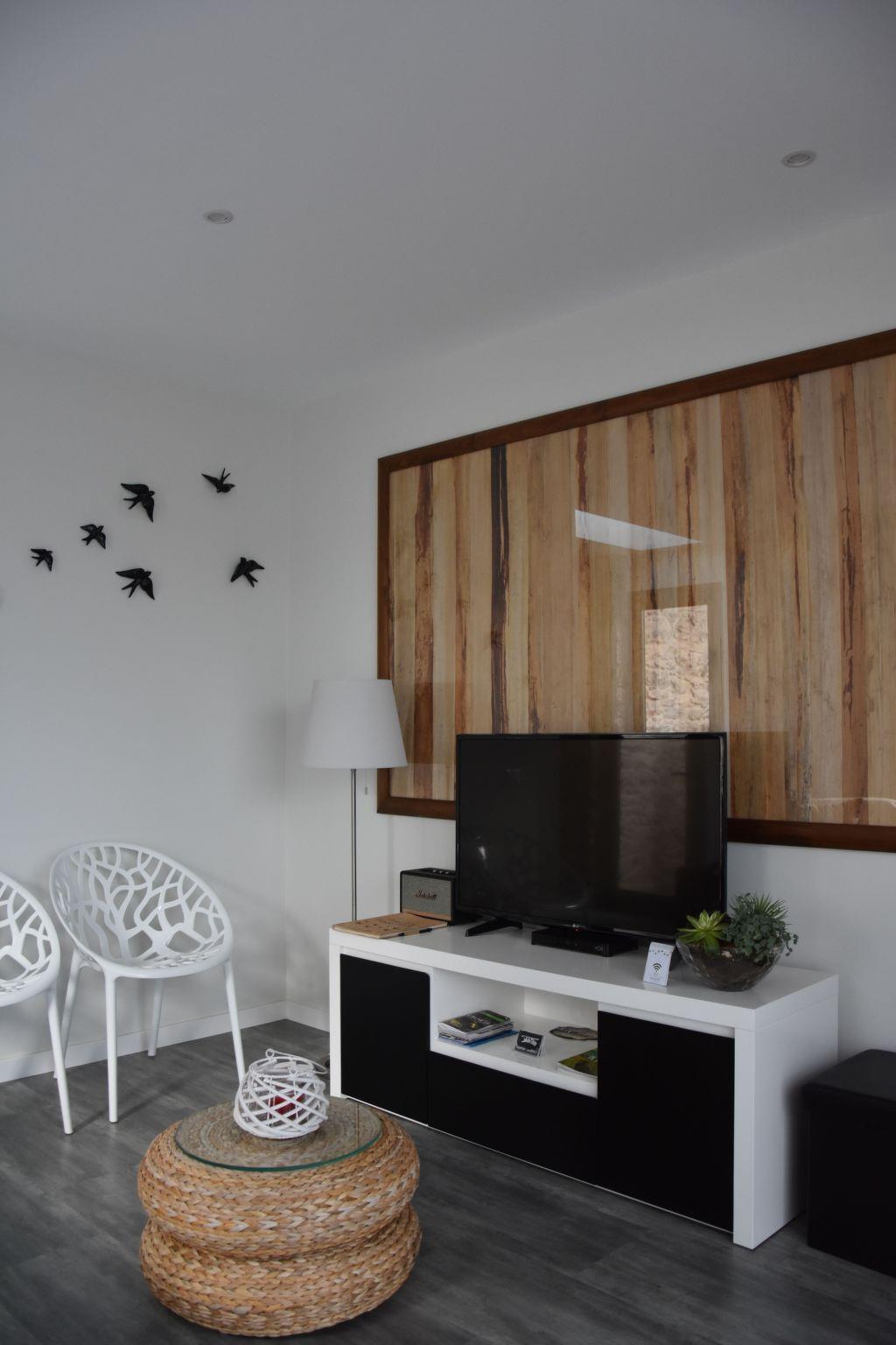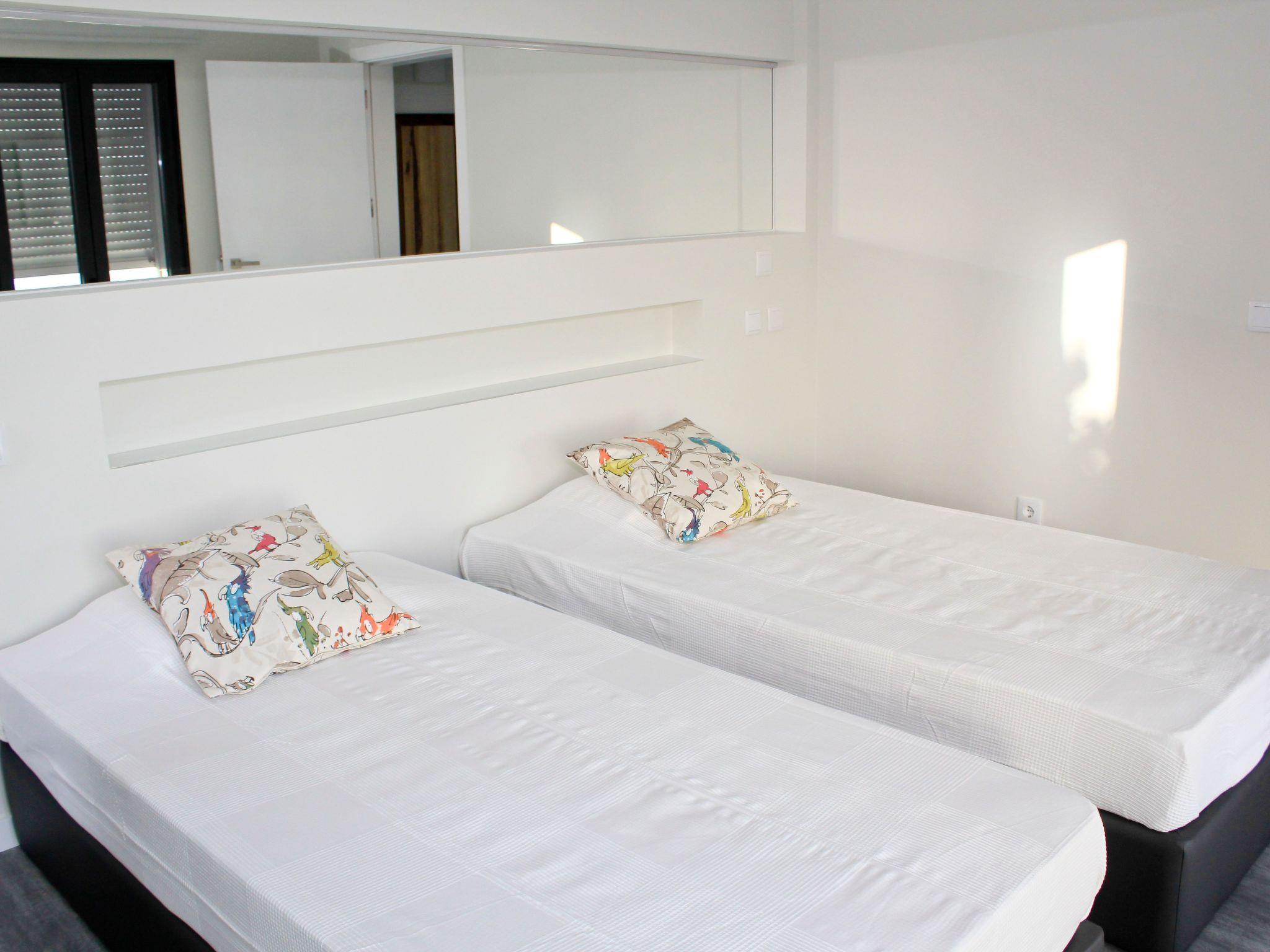 The two-storey villa has two bedrooms and can accommodate four persons. The ground floor is about 70 m² in size and comprises of the following rooms: A living room with a black leather sofa, large flatscreen TV and a dining area. Next to it there is a bedroom with two 90 x 200 cm single beds that you can push together to make a double bed. Plus there is a trendy, fully-equipped red Hi Gloss kitchen complete with Ceran cooktop and stainless steel extractor hood, oven, microwave, fridge with freezer compartment and coffee machine. There also is an adjoining bathroom with a walk in rain shower, wash basin and toilet.