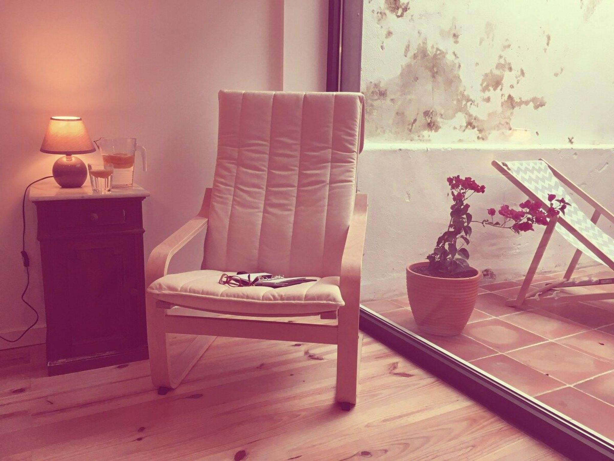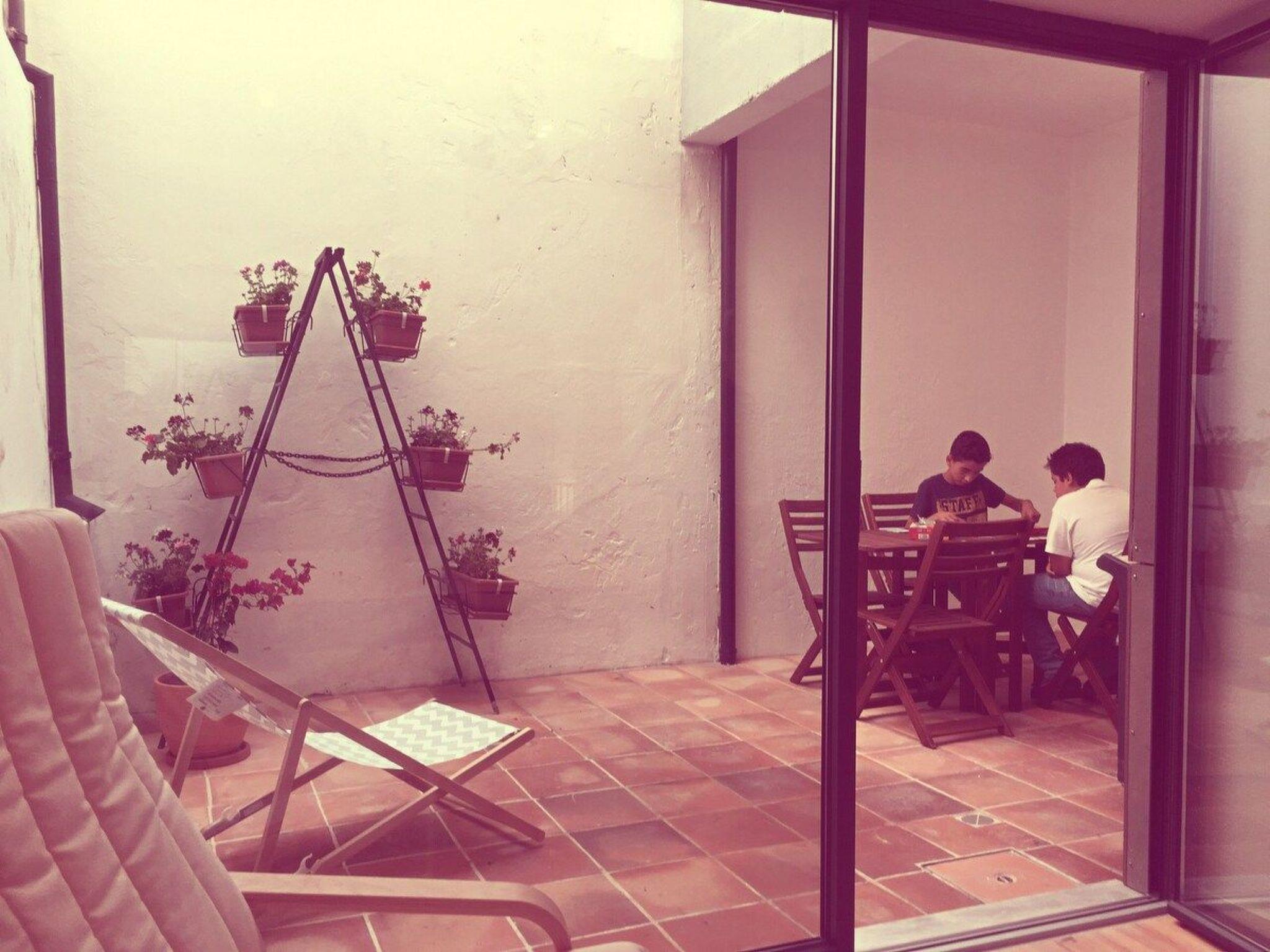 On the upper level, there is a generous patio, the bedroom (with a double bed), the bathroom and the bathroom and office (with double sofa bed). On the lower level, you'll find the kitchen and a large, open space that houses the library, dining area and living room.