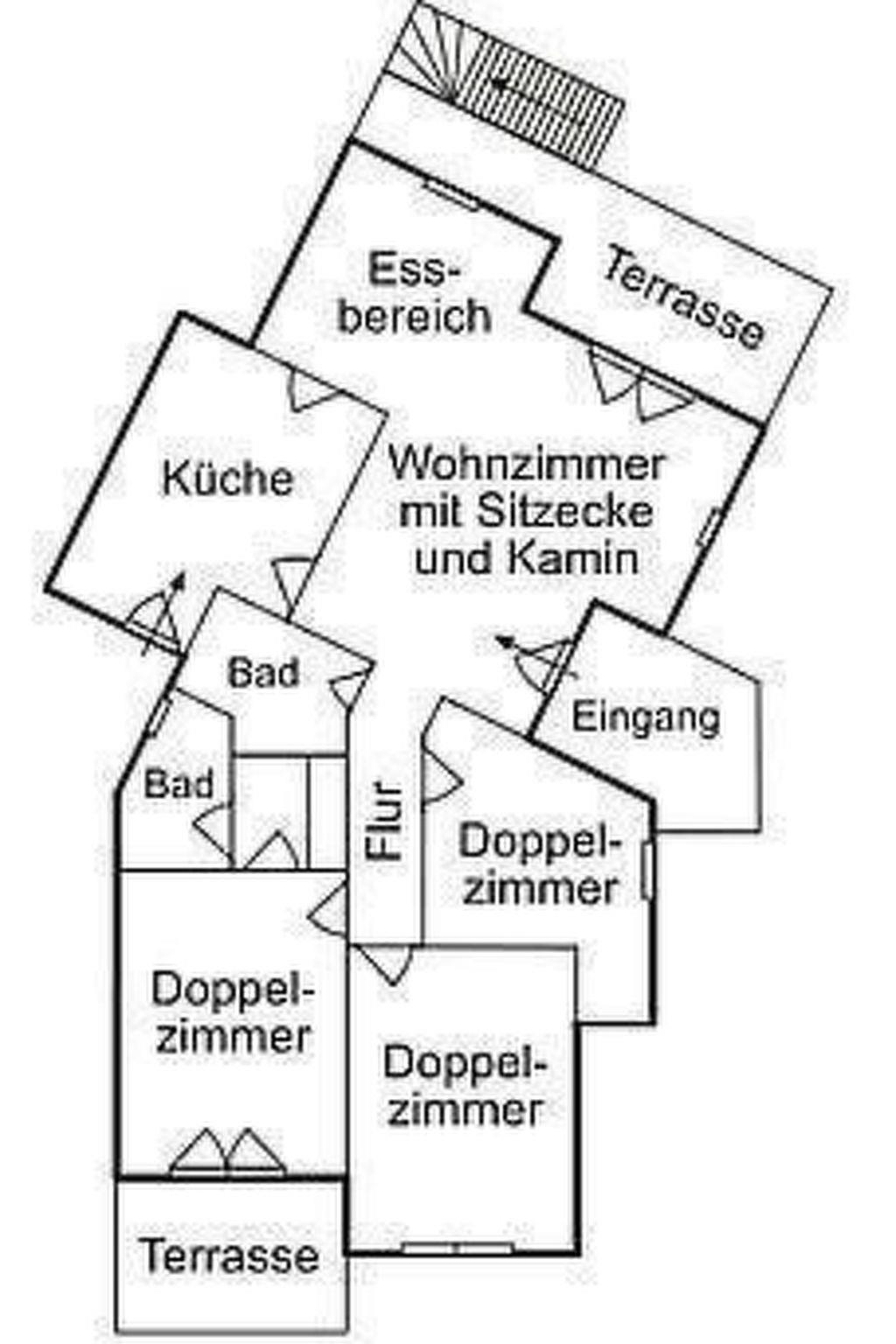 The Algarve-style villa for six people has a living area of approximately 100 m². It consists of three comfortably furnished bedrooms, two with double beds and one with two single beds. The largest bedroom has its own terrace and en suite bathroom, while another bathroom with bathtub is accessed via the hallway. The modern kitchen is very well equipped (dishwasher, washing machine, microwave, large fridge with freezer, cooker and espresso machine). The kitchen is connected to the spacious living-dining room with a sitting area by the fireplace. From the living room there is access to the covered south-facing terrace, ideal for al fresco dining. All rooms are on the same floor, plus there is a roof terrace with sea views on the roof of the house.