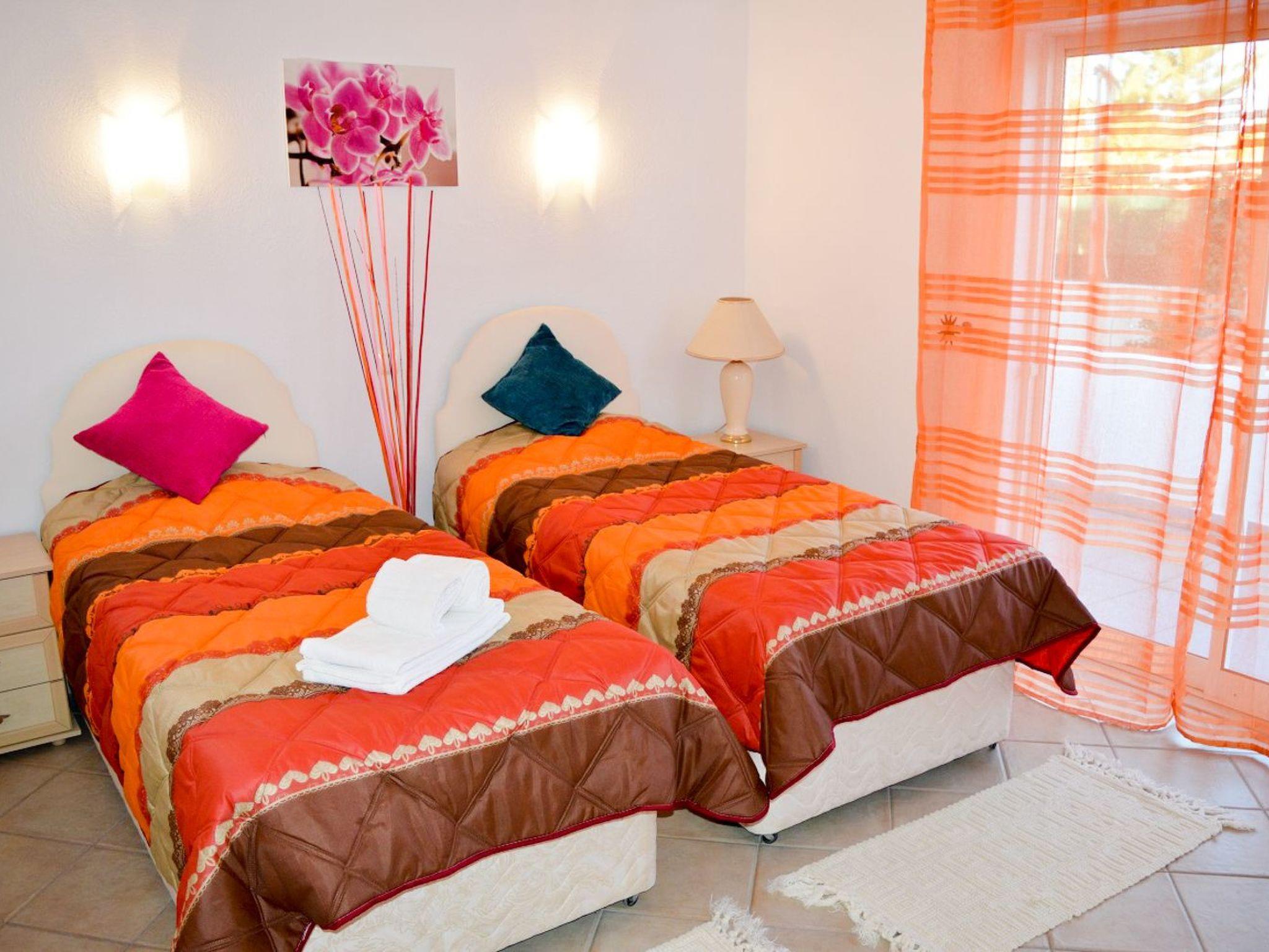 Your holiday apartment is on the second floor of the villa. It has only recently been completely renovated when it was equipped with all the modern conveniences you might need for a comfortable stay. Thanks to its own separate entrance your privacy is guaranteed during your stay. The apartment offers a living-/dining area, a separate modern fully fitted kitchen, two bedrooms and two bathrooms. The bright and airy living area is furnished with one three- and one two- seater cream colour leather sofa, digital flat screen satellite television, DVD and CD player and a dining table with four chairs. A wood fired oven provides a homely atmosphere and cosy warmth on cool evenings. The modern kitchen is complete with a Ceran cooktop and stylish stainless steel extractor hood, oven, fridge with freezer compartment, microwace, toaster, electric kettle and even a coffee machine. The master bedrooom is furnished with a 140 cm x 190 cm double bed, in the second bedroom you will find two 90 cm x 190 cm single beds that you can push together to make a double bed, both bedrooms have bedside tables with reading lamps and spacious chest of drawers providing plenty of storage space for your clothes and luggage. The two bathrooms has a big shower , both bathrooms offer a wash basin and wall mirror, hairdryer and a toilet. A bed for a baby and highchair are also available. Bed linen, a washing machine and reliable WLAN internet access is offered in your holiday apartment free of charge. Air conditioning/ heating is available in every room with extra charge.Transfer is possible from/to Faro airport by request with extra charge.