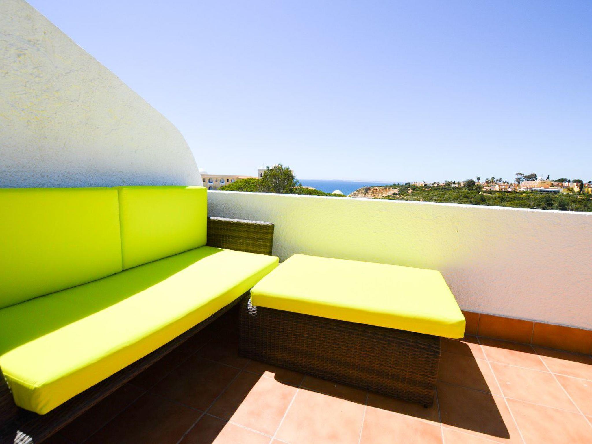 This spacious 85 m² holiday apartment enjoys a unique position within walking distance to the romantic limestone cliff coast of Carvoeiro on the sunny Western Algarve in Portugal, an ideal base to enjoy the clear blue sea, sandy beaches and Mediterranean culture and hospitality.Modern and tastefully furnished newly renovated holiday apartment with a barbecue on the large private panoramic sea view balcony, within walking distance from the sandy beach