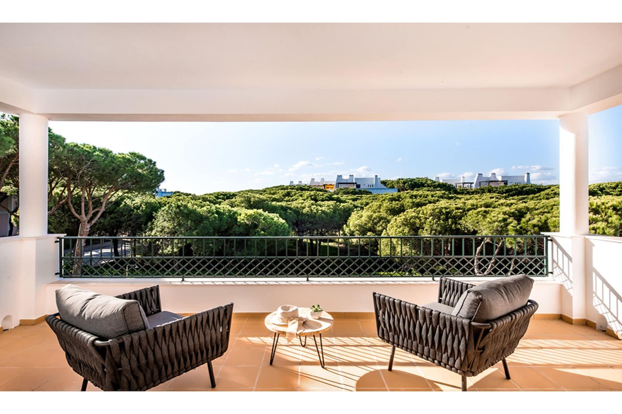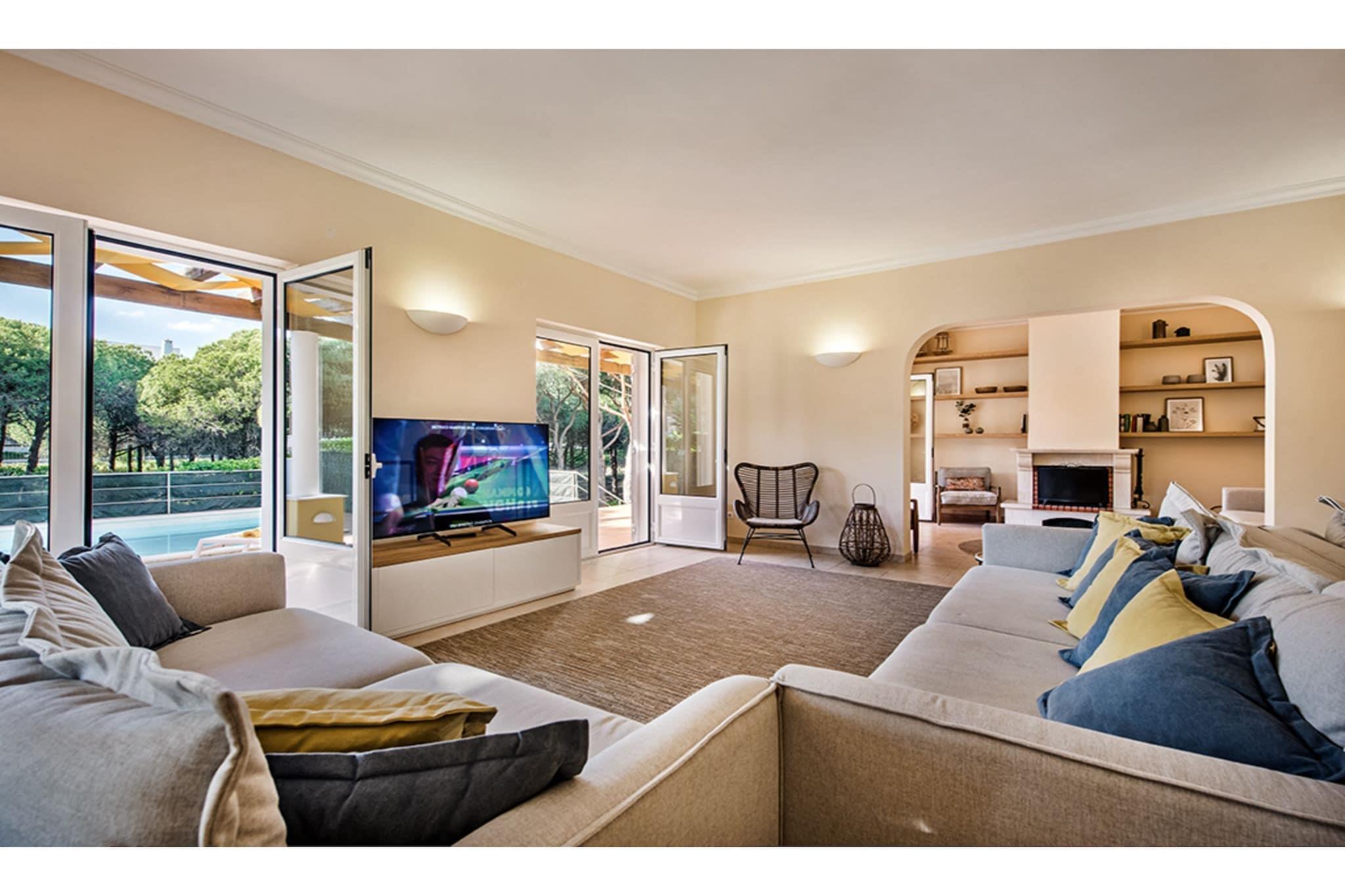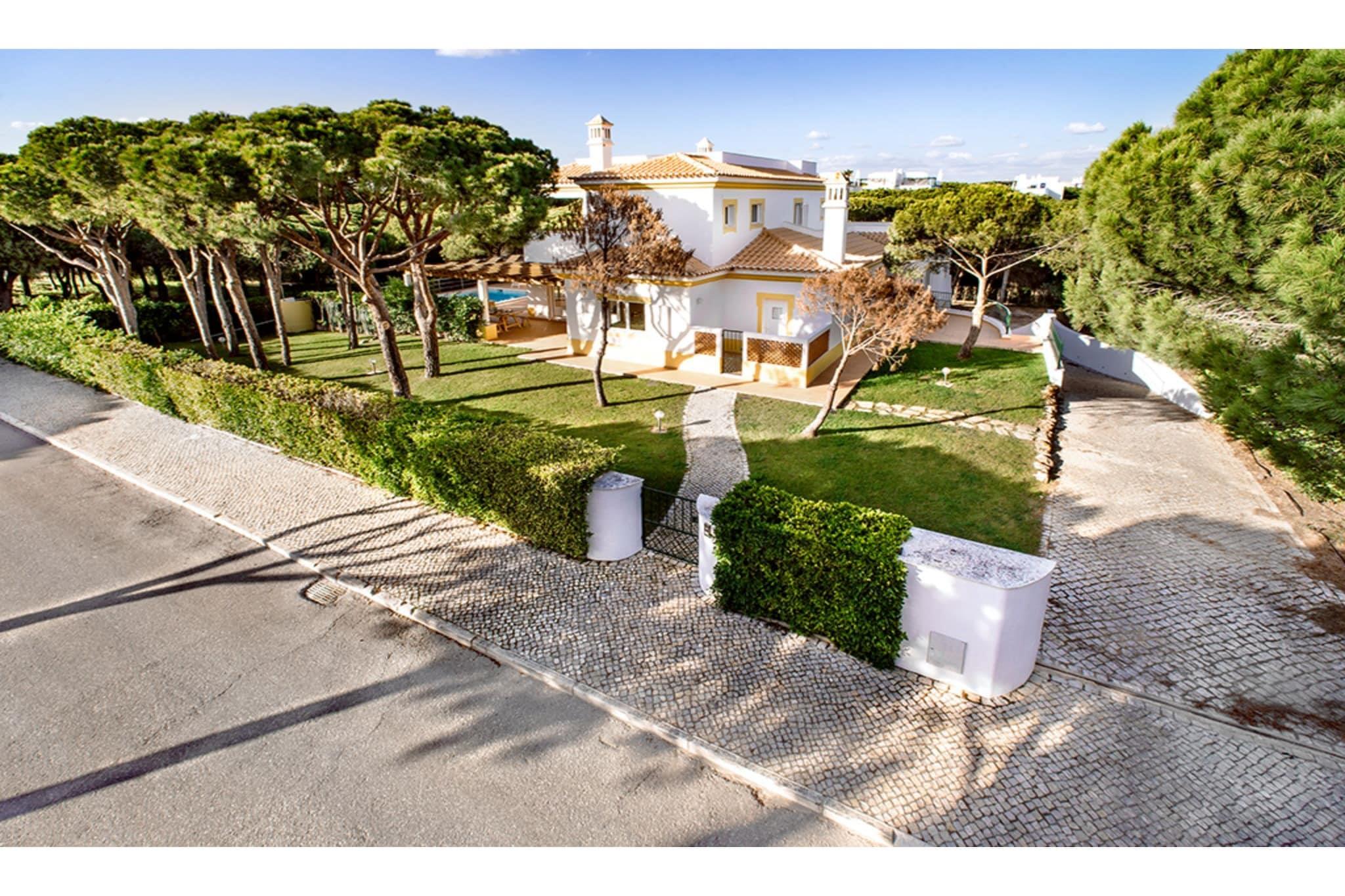 Situated within a mature pine tree forest on the exclusive Praia Verde estate, this beautiful family residence enjoys access to the blue flag beach where you’ll find a variety of bars, restaurants, shops and cafes within a few minutes walking distance. Beautifully appointed with a south facing aspect, this villa is set in a large plot amongst landscaped gardens and enjoys panoramic views from the spacious roof terrace. Access through the front door reveals a hallway with guest bathroom leading to a spacious lounge and separate reception room with fire place, a spacious fully equipped kitchen with American style fridge/freezer and adjacent dining room and three double bedrooms. A staircase leads to the children’s bedroom with two sets of bunkbeds and the large master bedroom with private balcony overlooking the swimming pool. All bedrooms are complete with extensive wardrobe storage, en-suite bathrooms and air-conditioning. This home away from home exudes a Mediterranean ambiance that extends over the ample shaded terraces and illuminated swimming pool allowing a genuine inside/outside living experience. The plot is securely fenced on all sides and access is through the powered gate and large basement garage with direct access to the living area, there is also ample on-plot parking available. In addition, the property benefits from a barbeque area, double glazing and air-conditioning throughout, high speed internet (FIBER) and a modern smart TV with access to international channels and subscriber apps such as Netflix and AppleTV. Golfers will be particularly well accommodated with four renowned golf courses within a short drive, including the Jack Nicklaus signature 18 hole course at the Monte Rei Golf and Country Club, which in addition to world class golf, guests can also enjoy tennis, horse riding, shopping, fine dining and an extensive spa complex. The picturesque and historic towns of Tavira, Monte Gordo, Castro Marim and Vila Real de Santo Antonio (VRSA) are all a short drive away and offer a variety of shopping, nightlife and dining, you can also catch a ferry at the picturesque marina in VRSA for a day trip across the Spanish border to Ayamonte.