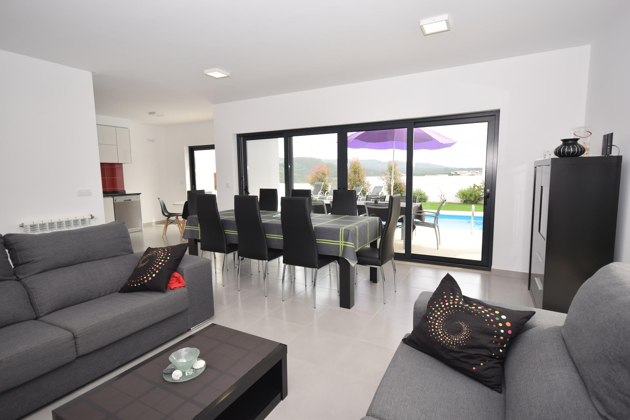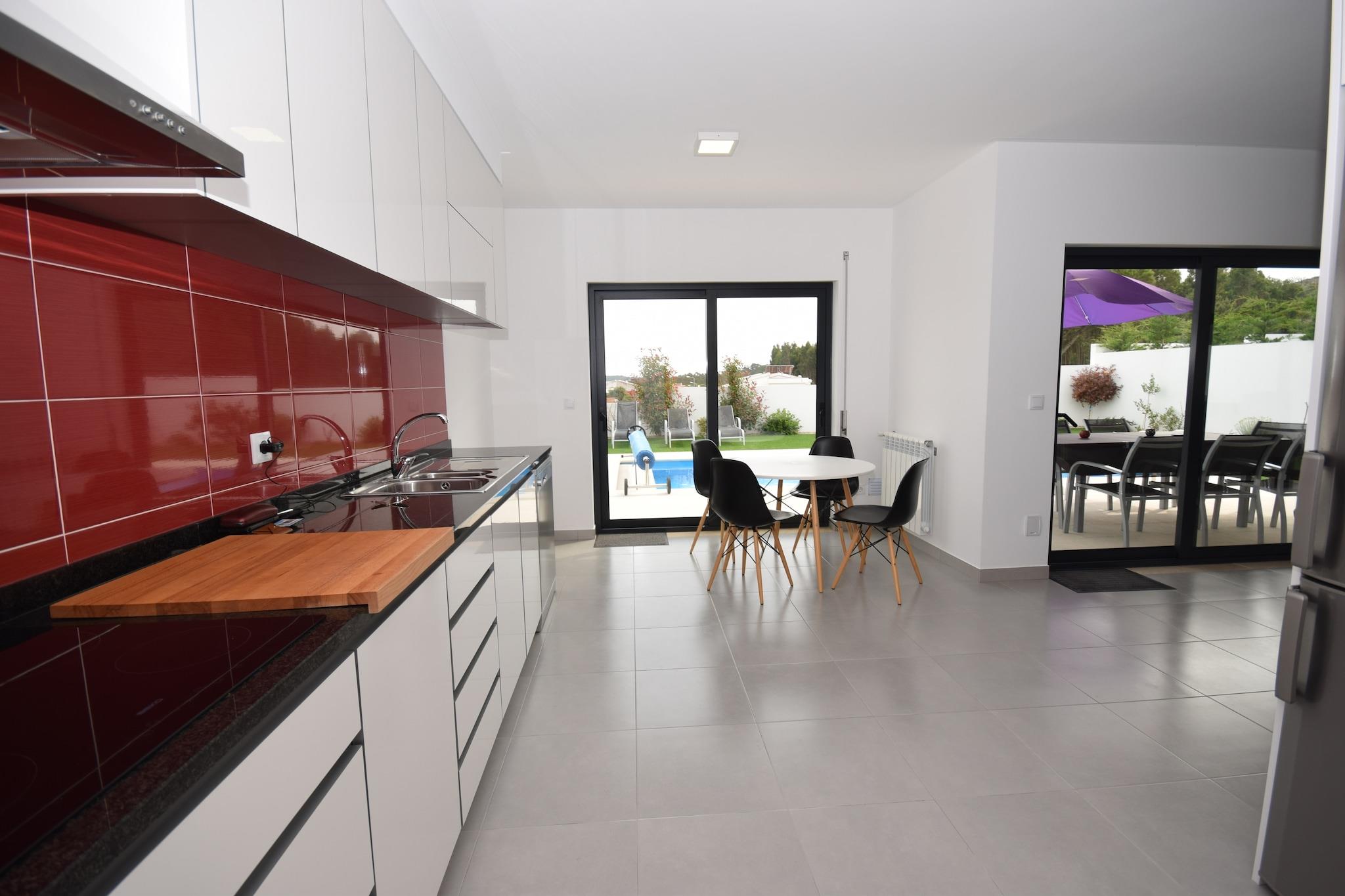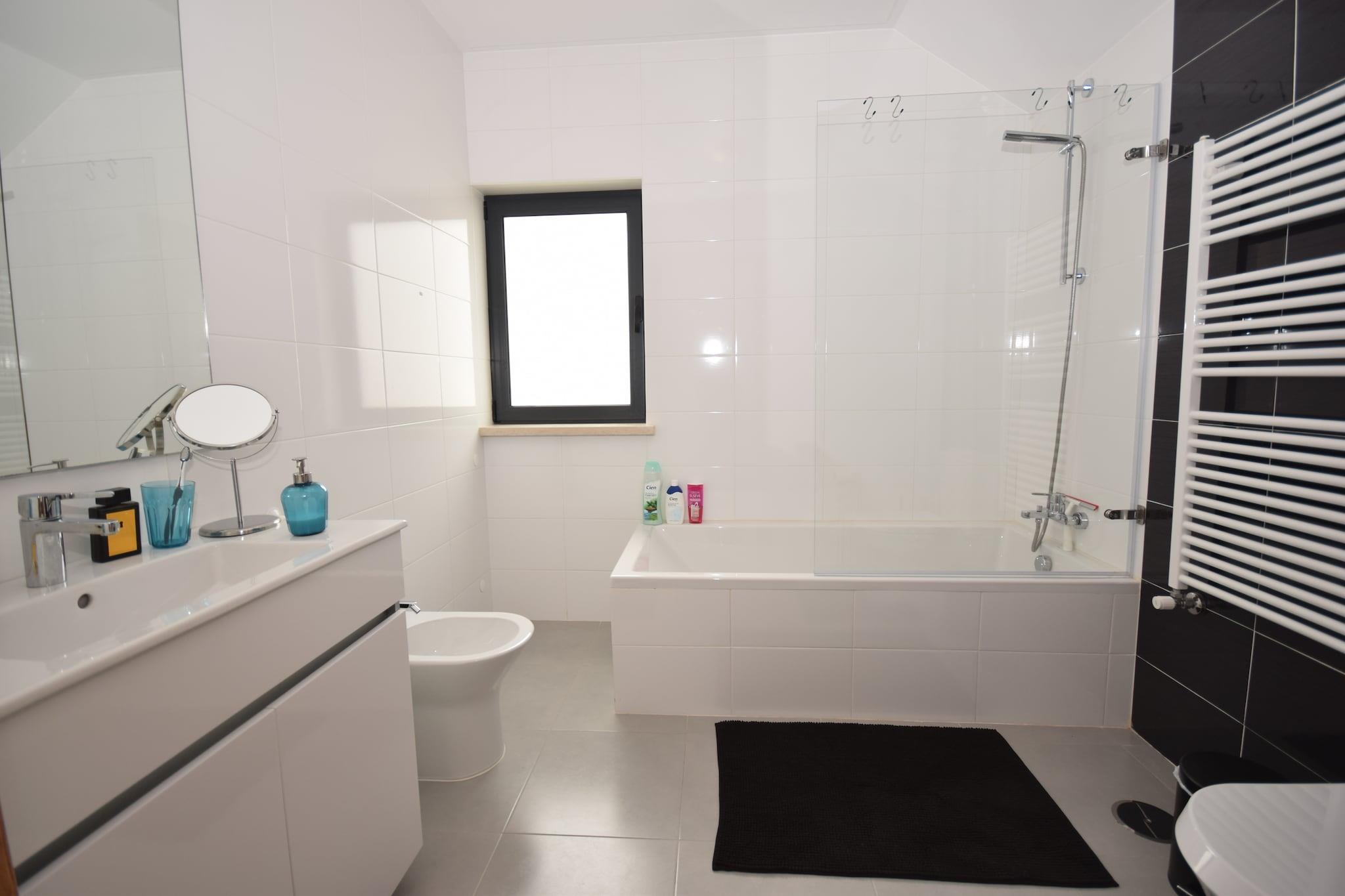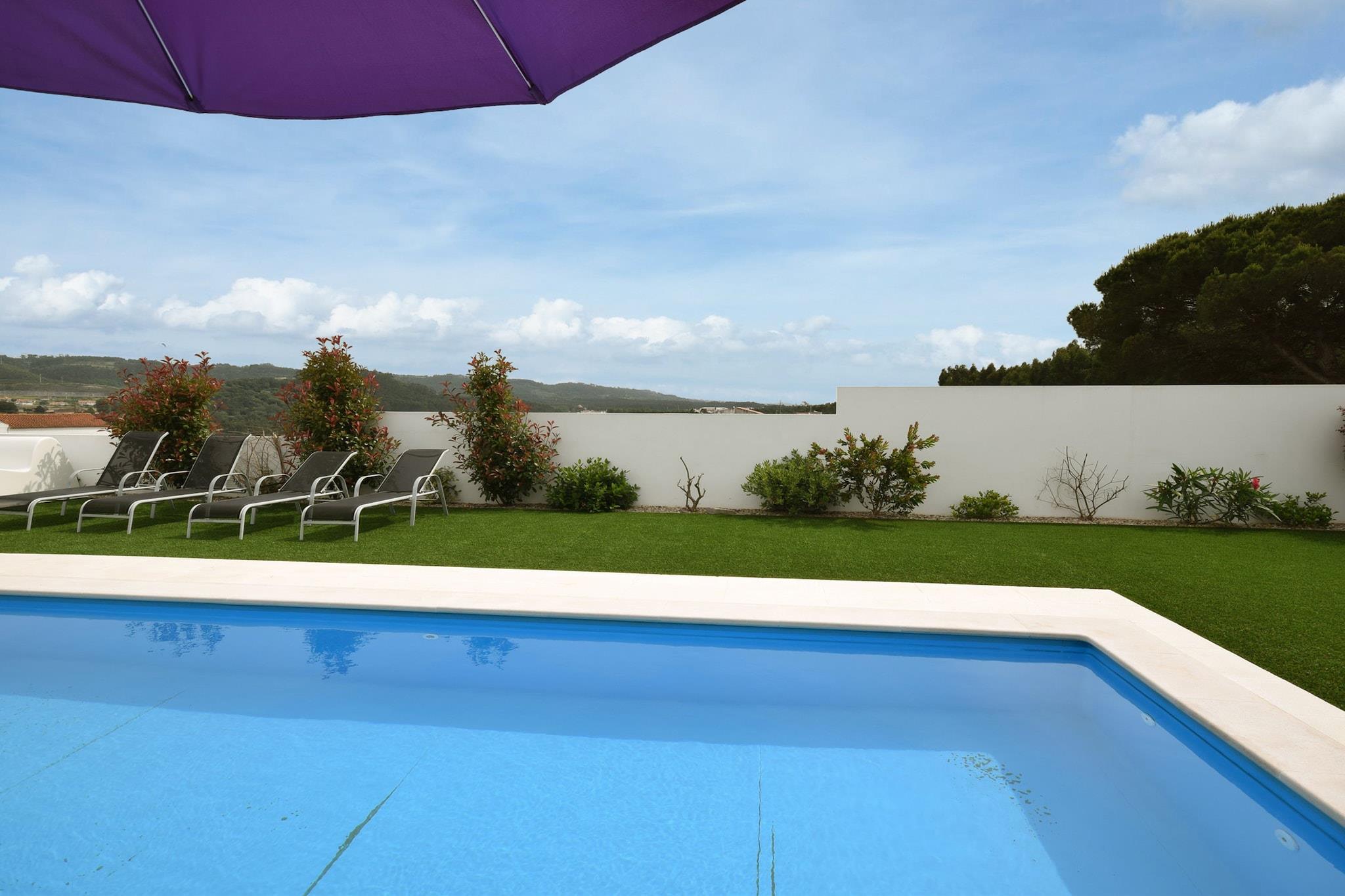 Dette indbydende feriehus i Famalicão er en behagelig base for familier eller grupper, der ønsker at udforske Portugals fantastiske kyst. Slap af ved den private swimmingpool med liggestole eller nyd solrige eftermiddage på den møblerede terrasse, perfekt til grillmad og udendørs måltider. Det åbne køkken og internationale tv-kanaler sikrer bekvemmelighed og underholdning, mens tilvejebringelsen af en børneseng og høj stol gør det familievenligt. Parasoller giver skygge til dovne eftermiddage ved poolen. Beliggende kun 6 km fra Nazarés berømte strand, kendt for sine gigantiske bølger og livlige atmosfære, tilbyder dette hjem hurtig adgang til surfing, gåture på stranden og afslapning ved havet. De maleriske byer São Martinho do Porto og Nazaré ligger i nærheden og byder på smukke havne, butikker og kulturelle steder. Landsbyen Famalicão ligger kun 1,5 km væk med flere lokale faciliteter og restauranter. Udforsk friske fiske- og skaldyrsdelikatesser såsom grillede sardiner og caldeirada på lokale spisesteder i Nazaré og Famalicão. Gå ikke glip af de traditionelle slik som "bolo de noz" (valnøddekage). Endagsture kan omfatte at besøge den charmerende middelalderby Alcobaça eller den travle by Leiria, begge mindre end en time væk. For naturelskere tilbyder en naturskøn køretur langs Atlanterhavskysten en betagende udsigt og fredelige steder til picnic.