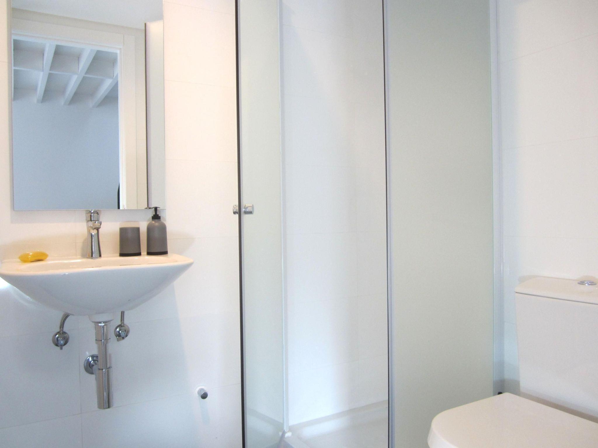 The large sliding glass doors in the living room open up to the private sun terrace, furnished with outdoor furniture, sun loungers, a sun shade and a barbecue. Secure car parking is available just in front of the house.