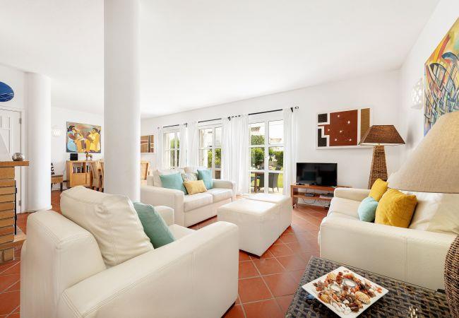 The comfortable and spacious living room has direct access to the garden and the swimming pool, and a dining area.