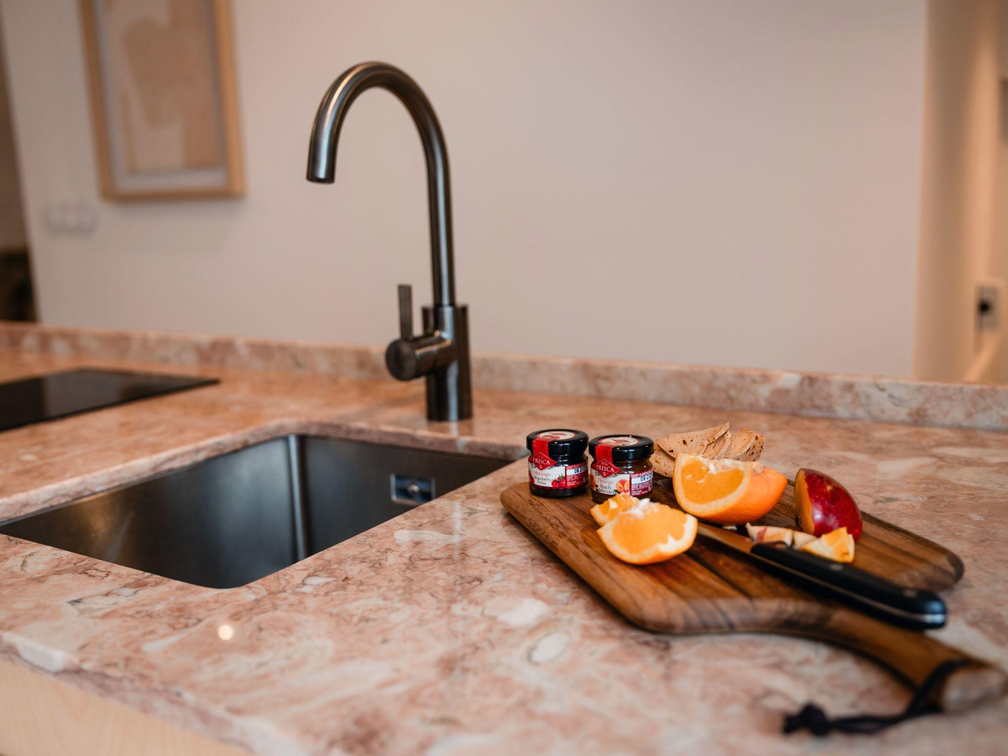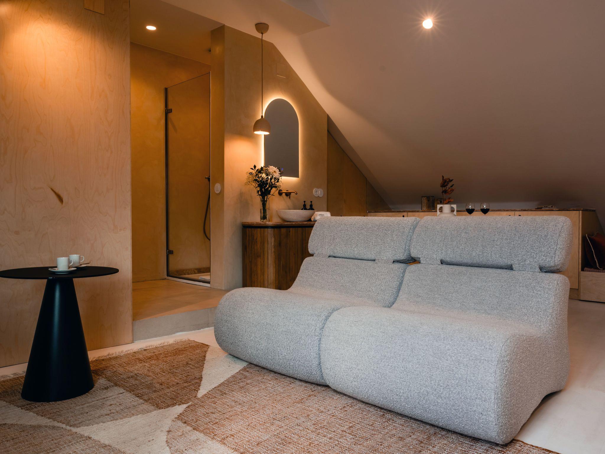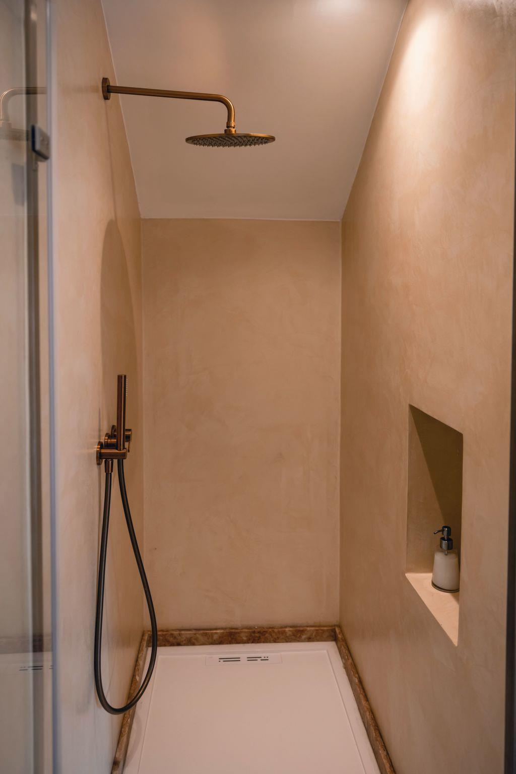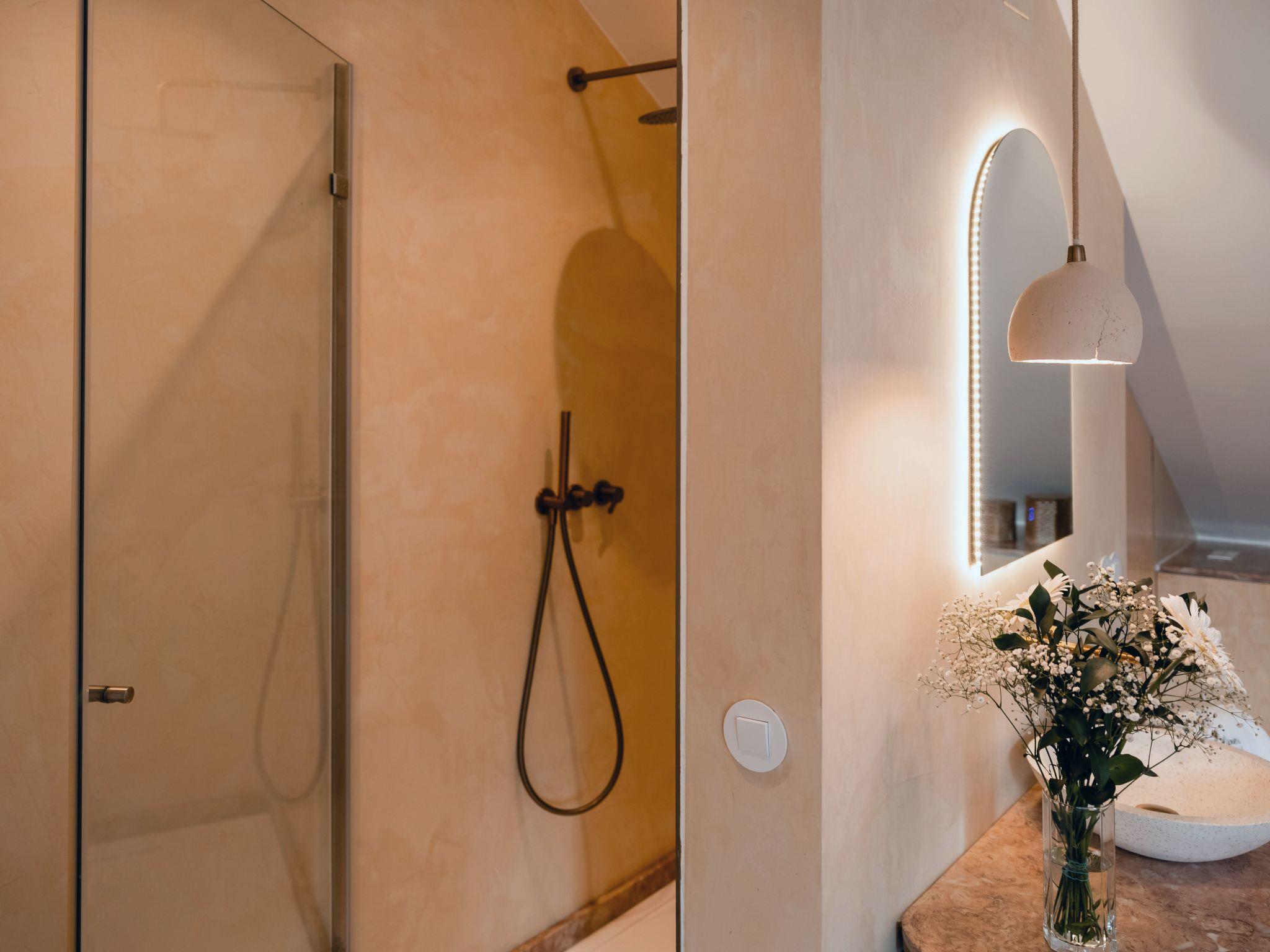 There is 1 bathroom with shower, including high-design bath fixtures. The kitchen is fully equipped and features high-end details?