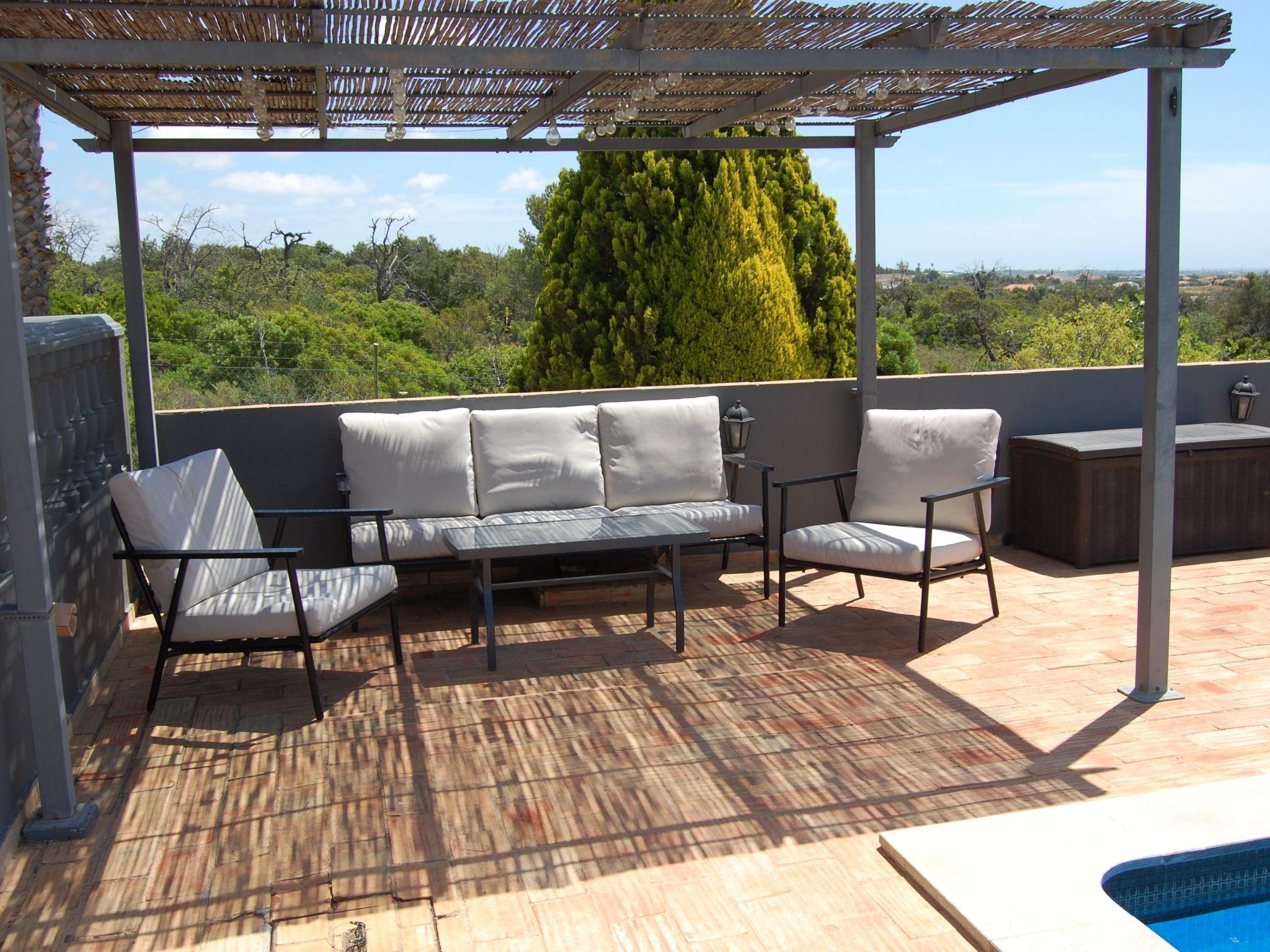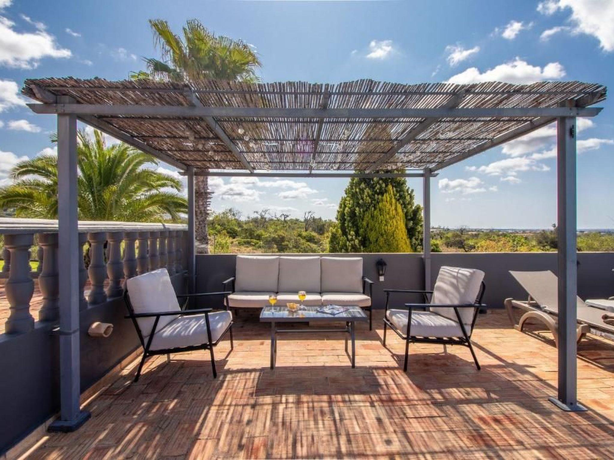 The outdoor area surprises with a wonderful pool, a solar shower and comfortable sun loungers that invite you to relax under the Mediterranean sun. The terrace offers breathtaking sea views and the opportunity to organise unforgettable barbecues on the charcoal or gas barbecue. A charming external staircase leads to the roof terrace, which fascinates with its panoramic views of the sea and Faro. The fenced plot with automatic gate also has space for three cars and guarantees privacy.