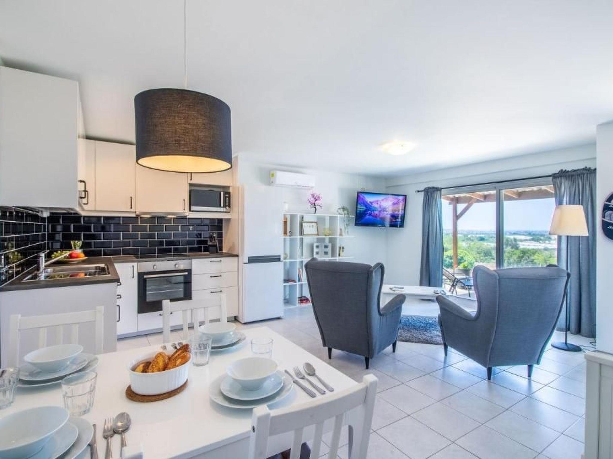 I am also pleased to inform you that there is another flat in the property. This is 50 m² in size and is furnished as an additional holiday flat for four people. I think this is a great option for a happy couple with two lovely children. The flat has a cosy bedroom with a comfortable double bed and a desk and chair, which is ideal for a home office. The lovingly designed eat-in kitchen is furnished with two comfortable armchairs and a cosy sofa bed for two people. A flat-screen TV with international programmes provides entertainment, while a dining table for four people allows for sociable get-togethers. The kitchen is also well equipped with a fridge, ceramic hob, oven and microwave to make your stay as comfortable as possible. The bathroom is equipped with a washbasin, WC and shower to make you feel at home. A large, shaded and covered terrace awaits you in front of the flat, inviting you to linger and offering a marvellous view of the sea. The flat is perfect for two families who want to spend a relaxing holiday together without sacrificing their privacy. The main house can accommodate up to six people, while the flat can accommodate up to four people. To make you feel at home, we ask you to open the flat by prior arrangement.