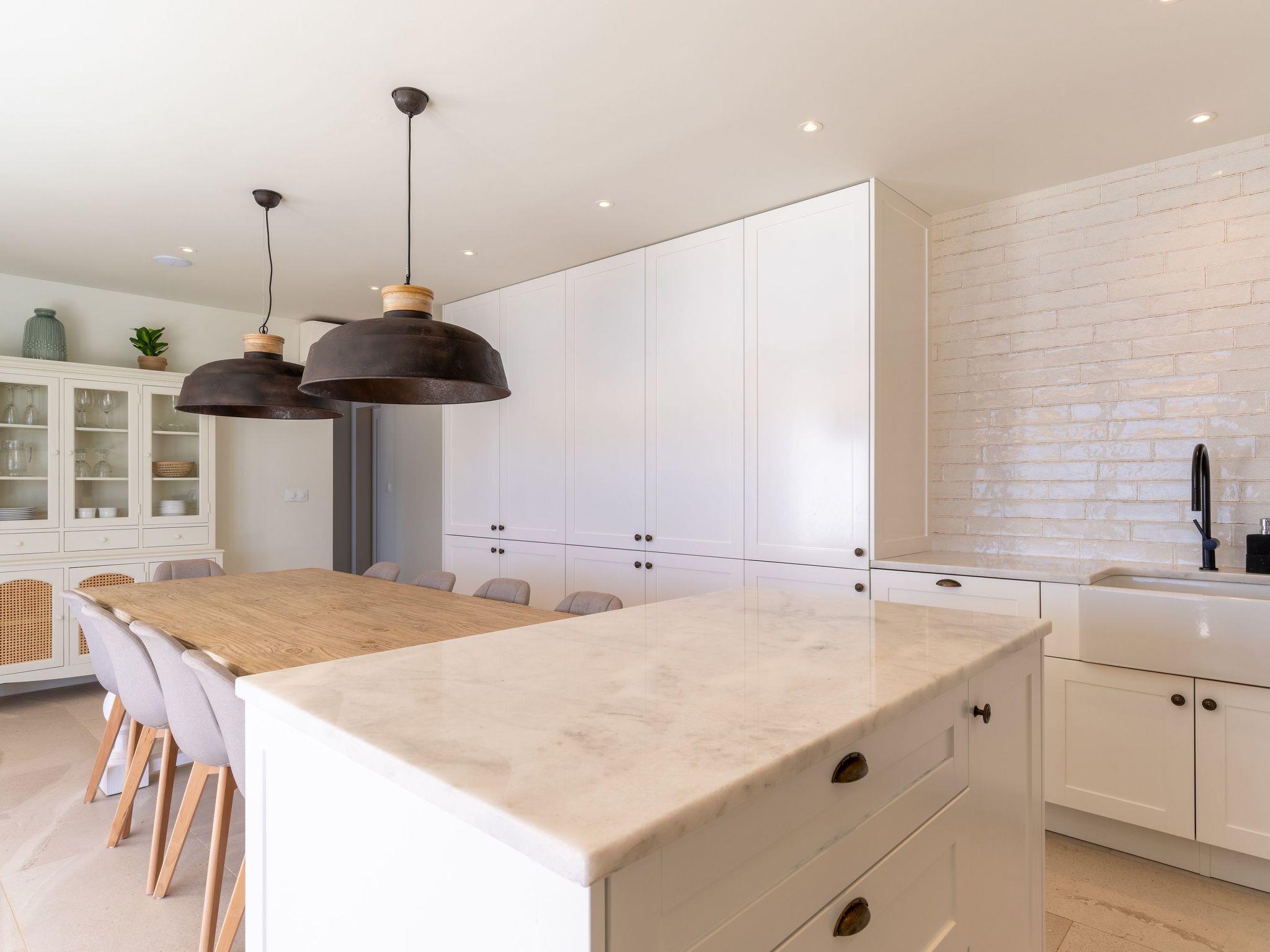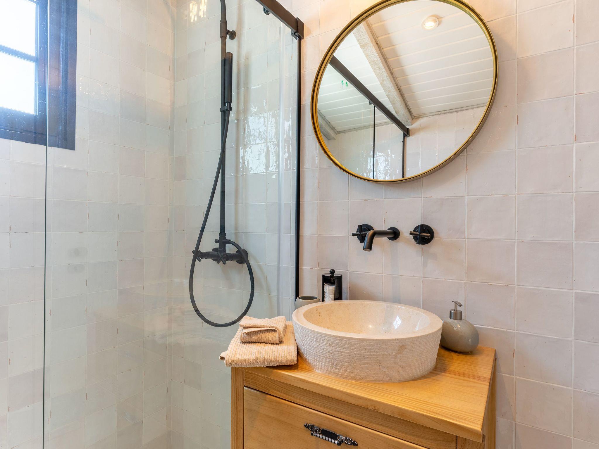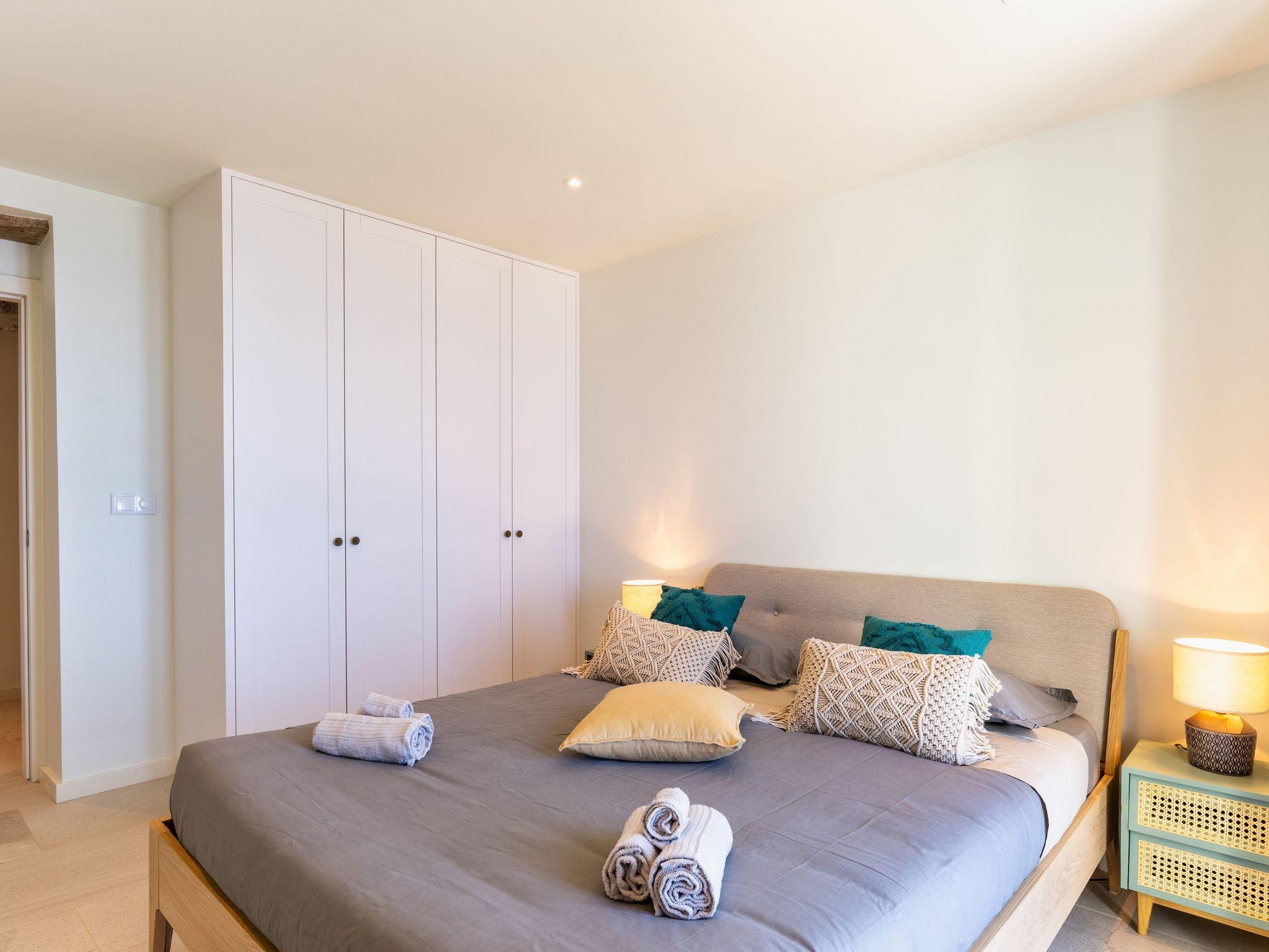 Inside, the villa unfolds over three meticulously designed floors that cater to every need. The ground floor features a cozy living room with a fireplace, a flat-screen TV with cable channels, a stereo system, and a guest toilet, alongside a beautiful dining area. The kitchen is fully equipped with the latest appliances, including an oven, stove, microwave, fridge, washing machine, coffee and capsule coffee machine, dishwasher, and a convenient dining table. The upper floors house the bedrooms, each offering a sea view, with the master bedroom boasting an ensuite bathroom and walk-in closet. For added comfort, there's air conditioning throughout, a gym, and amenities such as a clothes dryer and electric kettle.