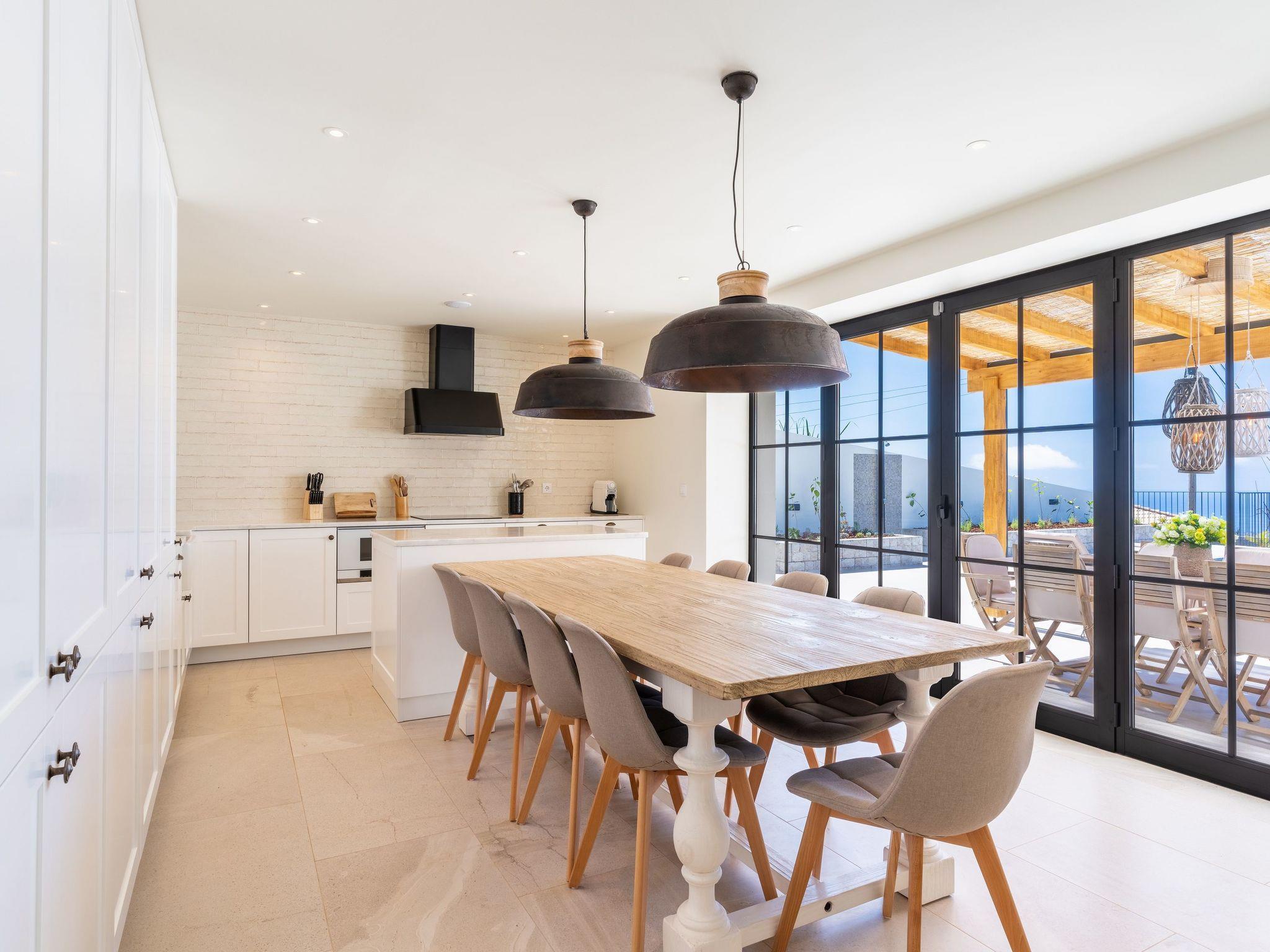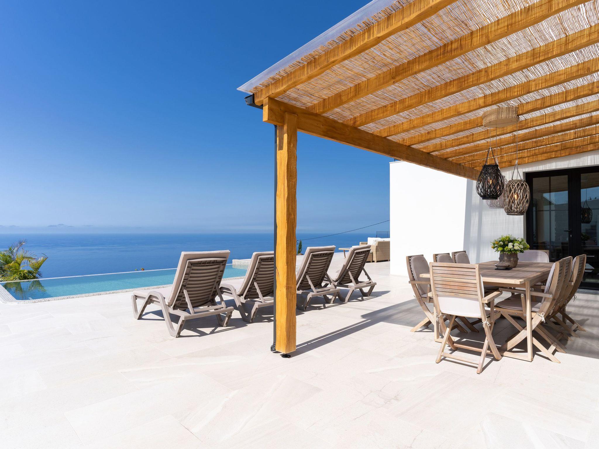 The outdoors complements the luxury of the interior with a heated infinity pool that overlooks the sea, surrounded by sunbeds, and a lounge area equipped with an outdoor sofa, chairs, and table. For those who enjoy al fresco dining, there's a dedicated dining area and a barbecue space with both gas and charcoal BBQs. The private garden and outdoor parking space ensure both convenience and privacy for guests.
