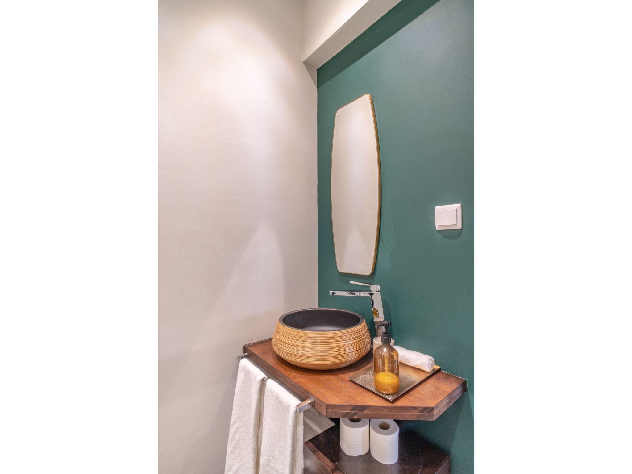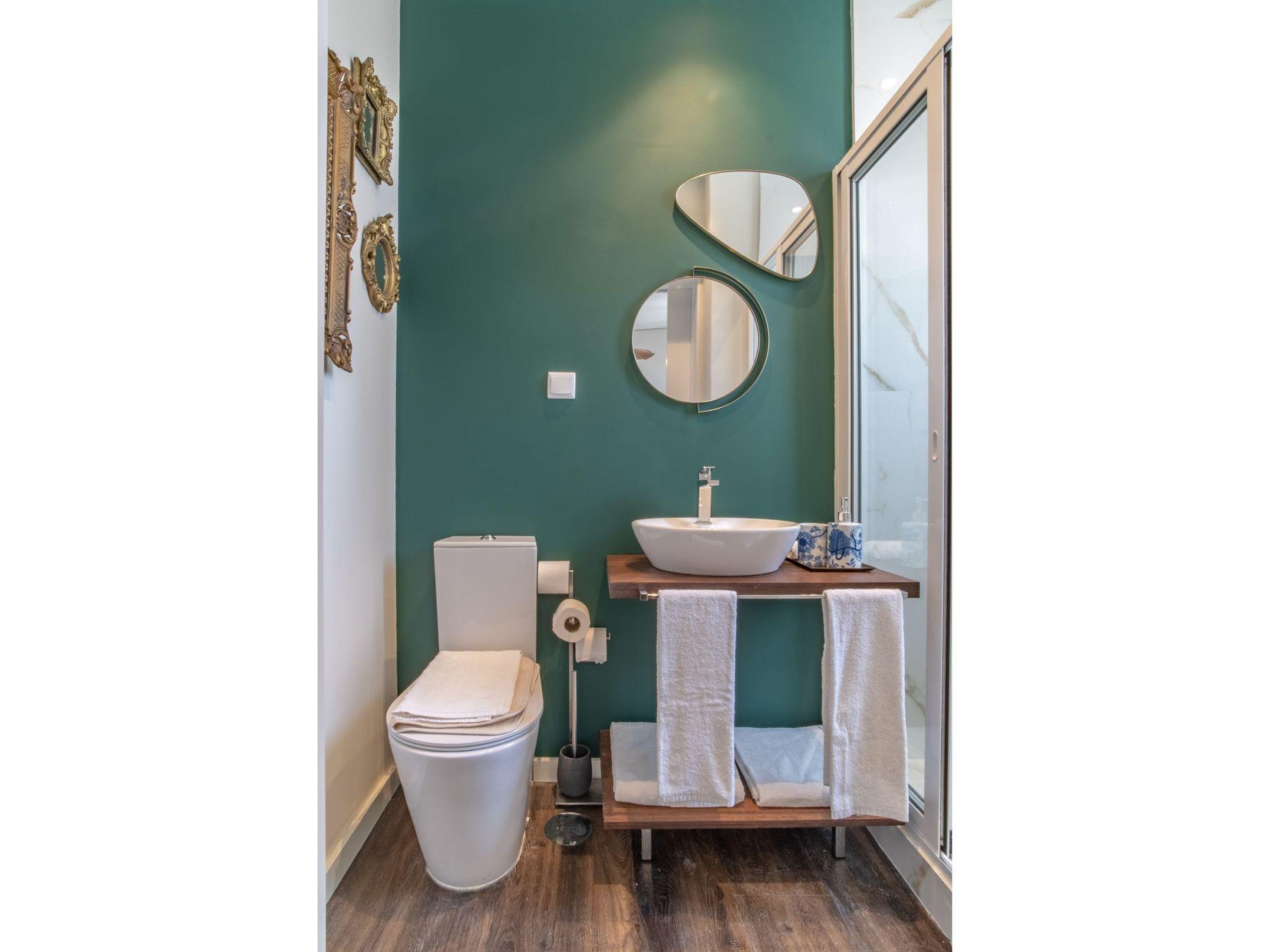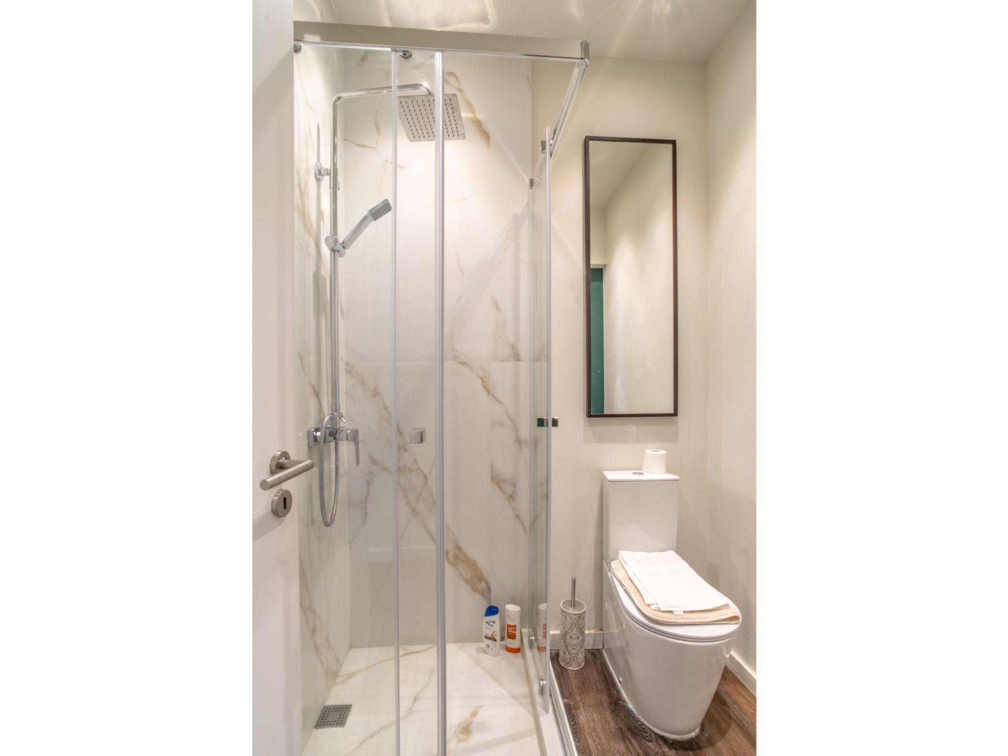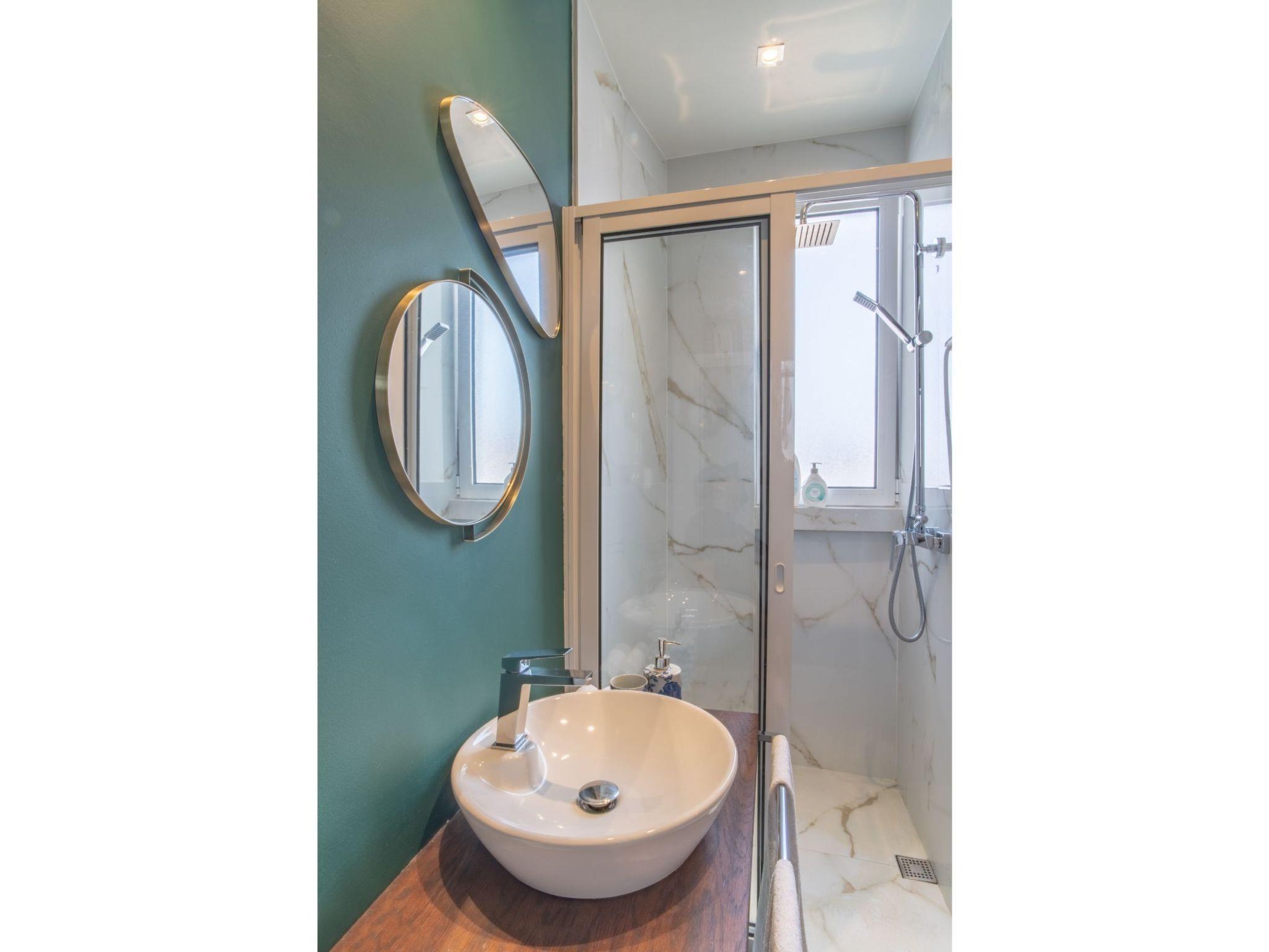 The apartment extends its appeal to the outside, where a balcony presents itself as the perfect nook for quiet contemplation or enjoying a meal against the backdrop of the ocean. Additionally, the garden, for communal use, invites guests to unwind in the lush greenery, offering a slice of nature in the urban setting.