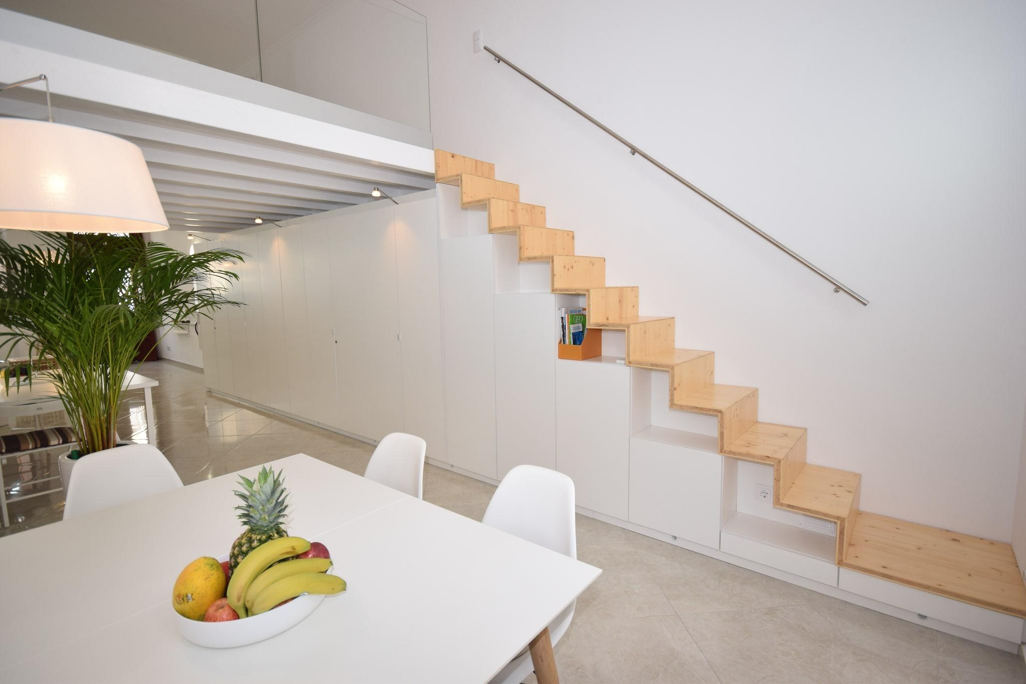 Stueetage: (Stue(dobbeltsovesofa(140 x 200 cm), Fjernsyn(Internationale TV-kanaler), spisebord, klimaanlæg), Køkken(kogeplade(glaskeramisk), elkedel, brødrister, kaffemaskine, ovn, opvaskemaskine , køle-fryseskab, Saftpresser), badeværelse(bruser, håndvask, toilet)) Mellemetage: (soveværelse(dobbeltseng(180 x 200 cm))) vaskemaskine, terrasse, havemøbler, solstole, Parasol, barneseng