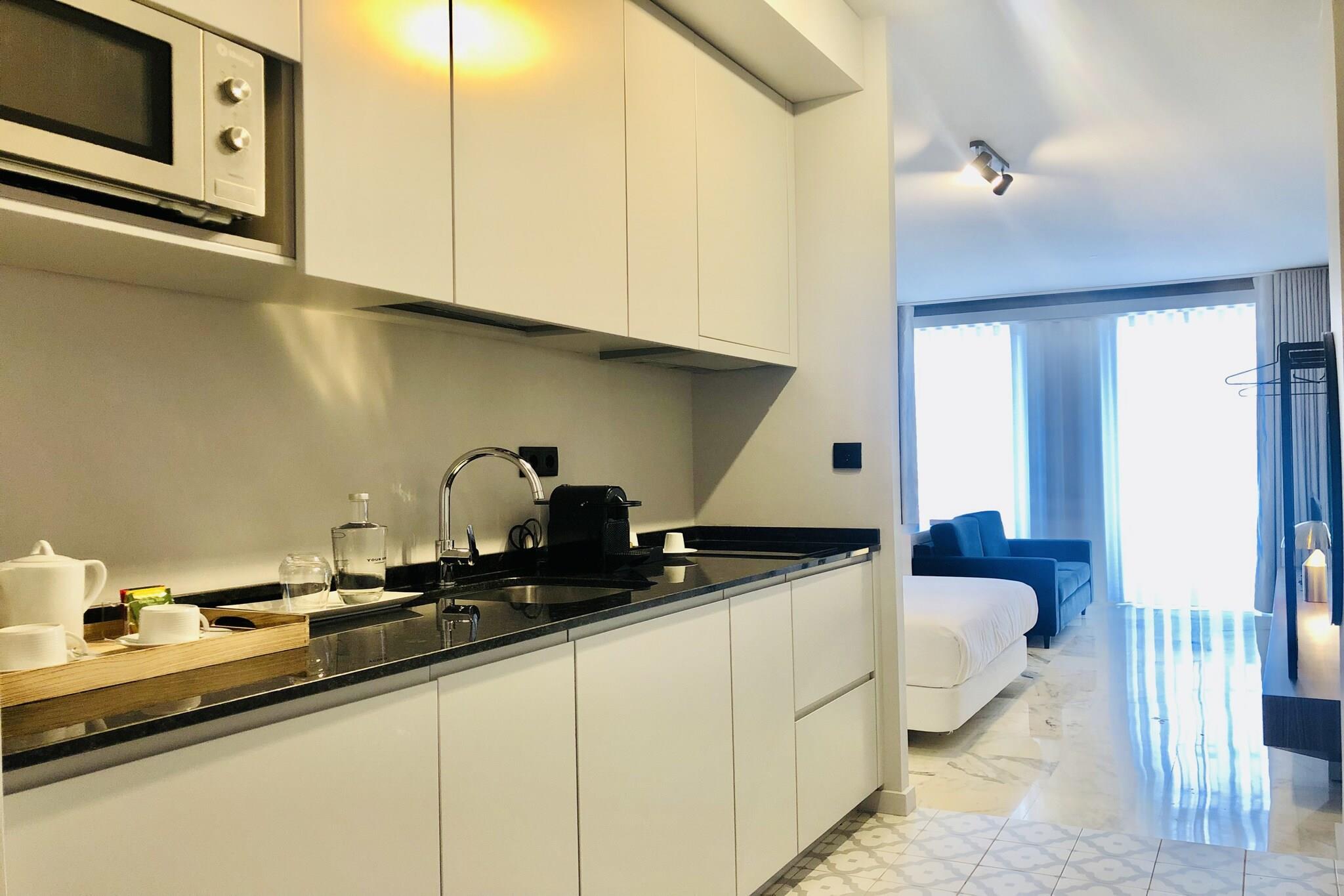 På 2. etage: (Køkken(elkedel, brødrister, kaffemaskine, mikrobølgeovn, køleskab, Saftpresser, , ), Stue/soveværelse(dobbeltseng, Fjernsyn, sofahjørne), badeværelse(bruser, håndvask, toilet, føntørrer), Internetadgang) , tørretumbler, vaskemaskine, klimaanlæg, strygejern