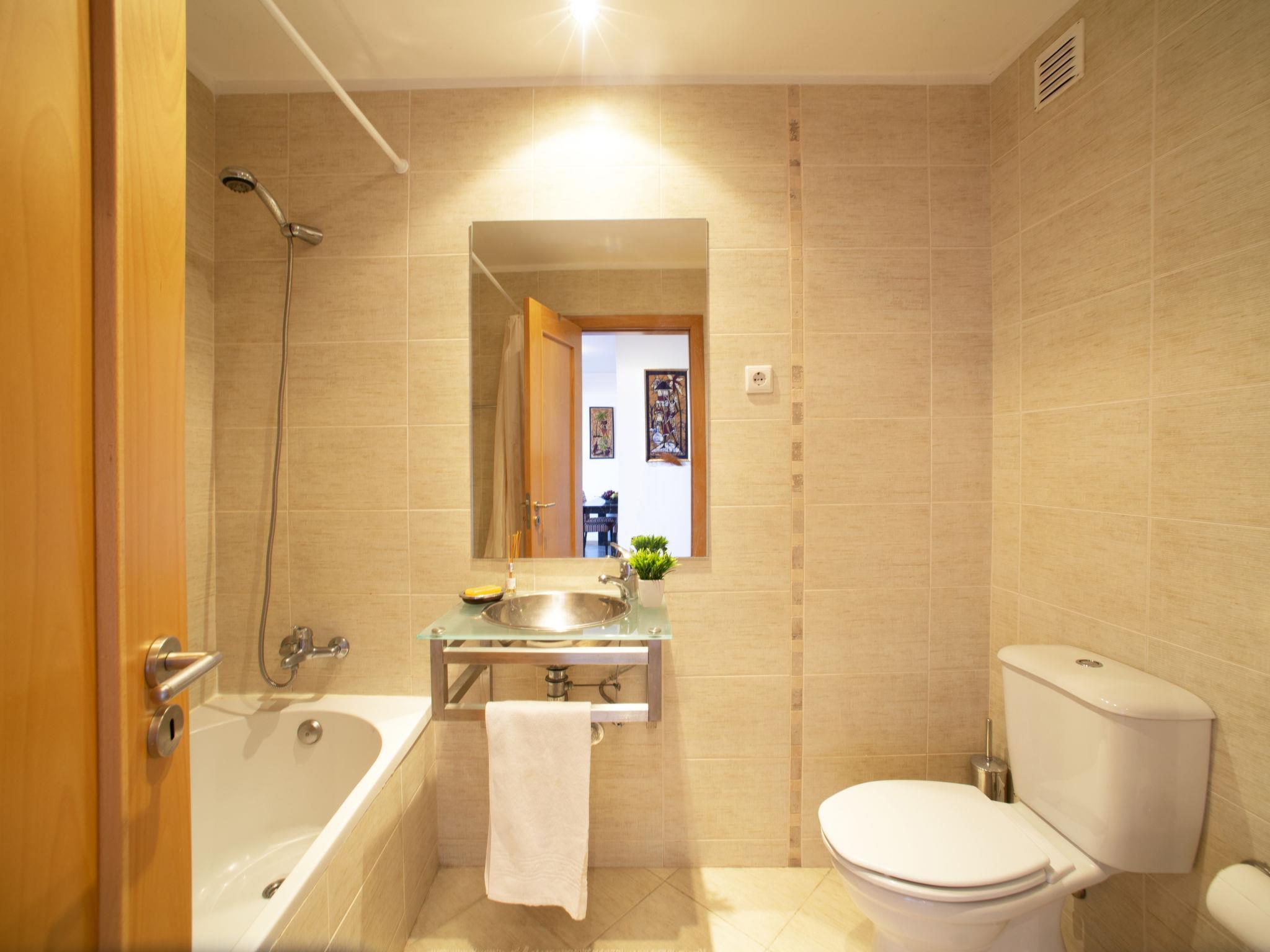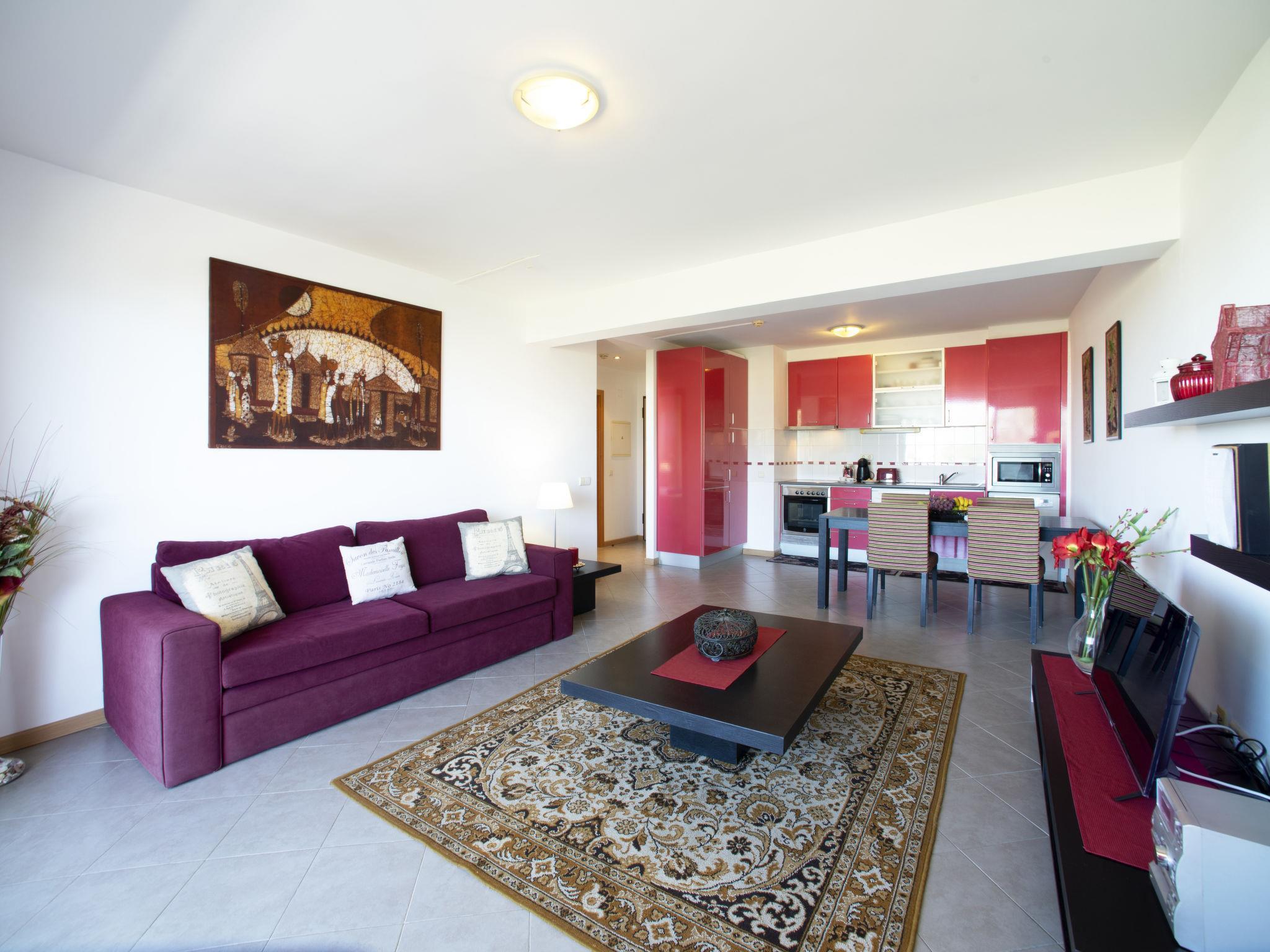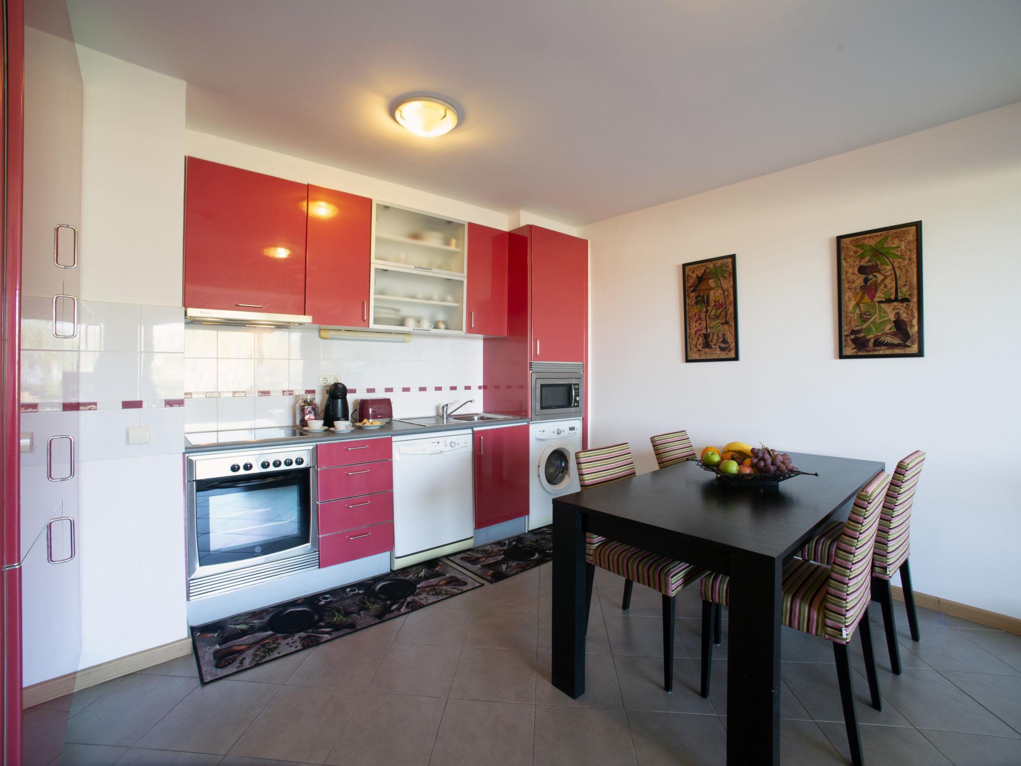 "Full moon", 2-room apartment 59 m2 on 2nd floor. Comfortable furnishings: open living/dining room with 1 double sofabed (2 x 80 cm, length 200 cm), cable TV, air conditioning and forced-air heating. Exit to the balcony. 1 room with 1 french bed (2 x 90 cm, length 200 cm), air conditioning and forced-air heating. Exit to the terrace. Kitchen-/living room (oven, dishwasher, 4 ceramic glass hob hotplates, toaster, kettle, microwave, electric coffee machine, Capsules for coffee machine (Dolce Gusto (not inc)) with dining table. Bath/bidet/WC. Heating not available in all rooms. Large terrace 17 m2. Partial view of the sea and the town. Facilities: washing machine, iron, children's high chair, baby cot, hair dryer. Internet (WiFi, free). Parking space n 104 (roofed). 1600