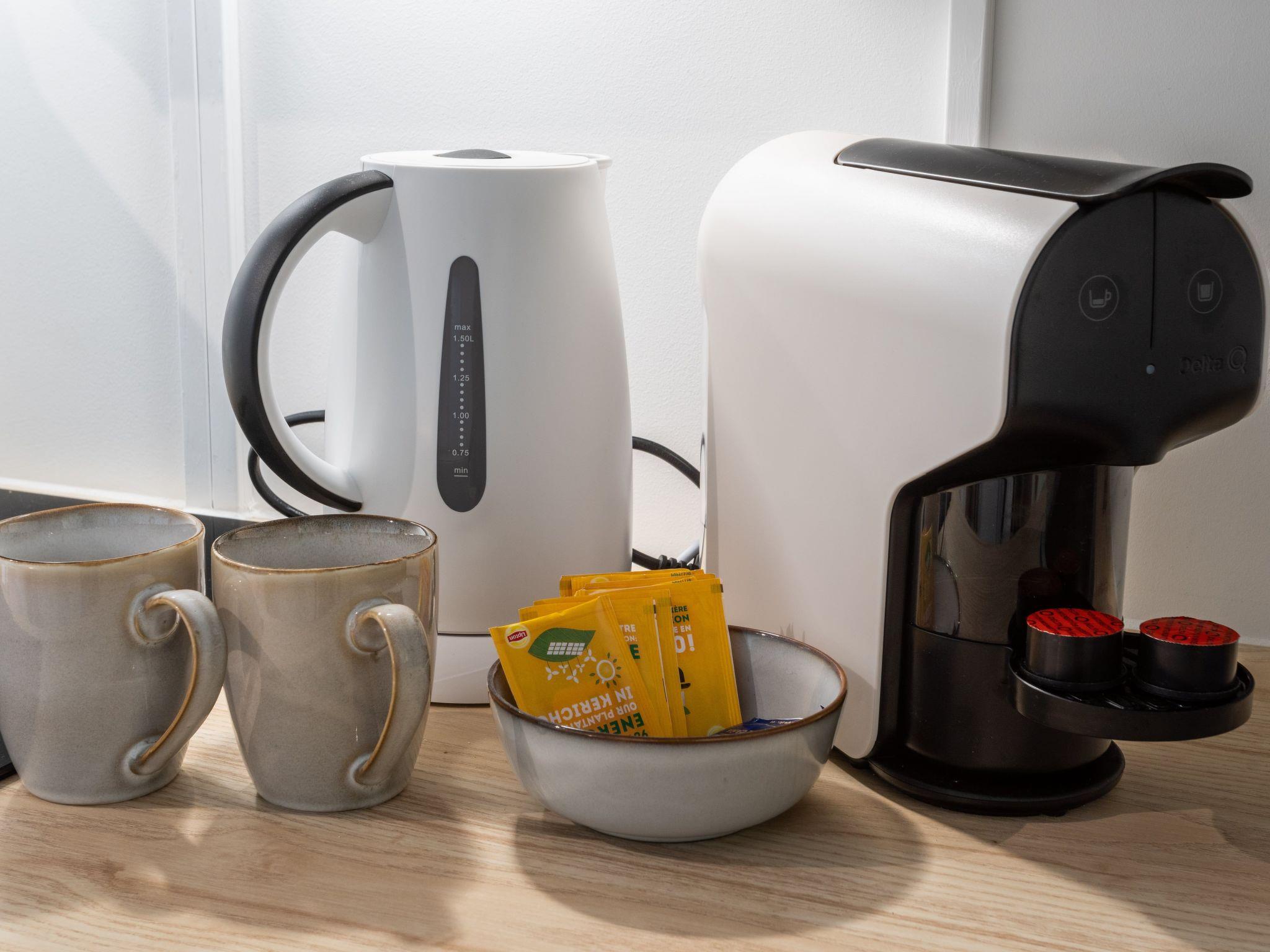 The spacious kitchen has essential appliances, including a stove, an oven, a microwave oven, a fridge, a water kettle, a coffee machine, etc.