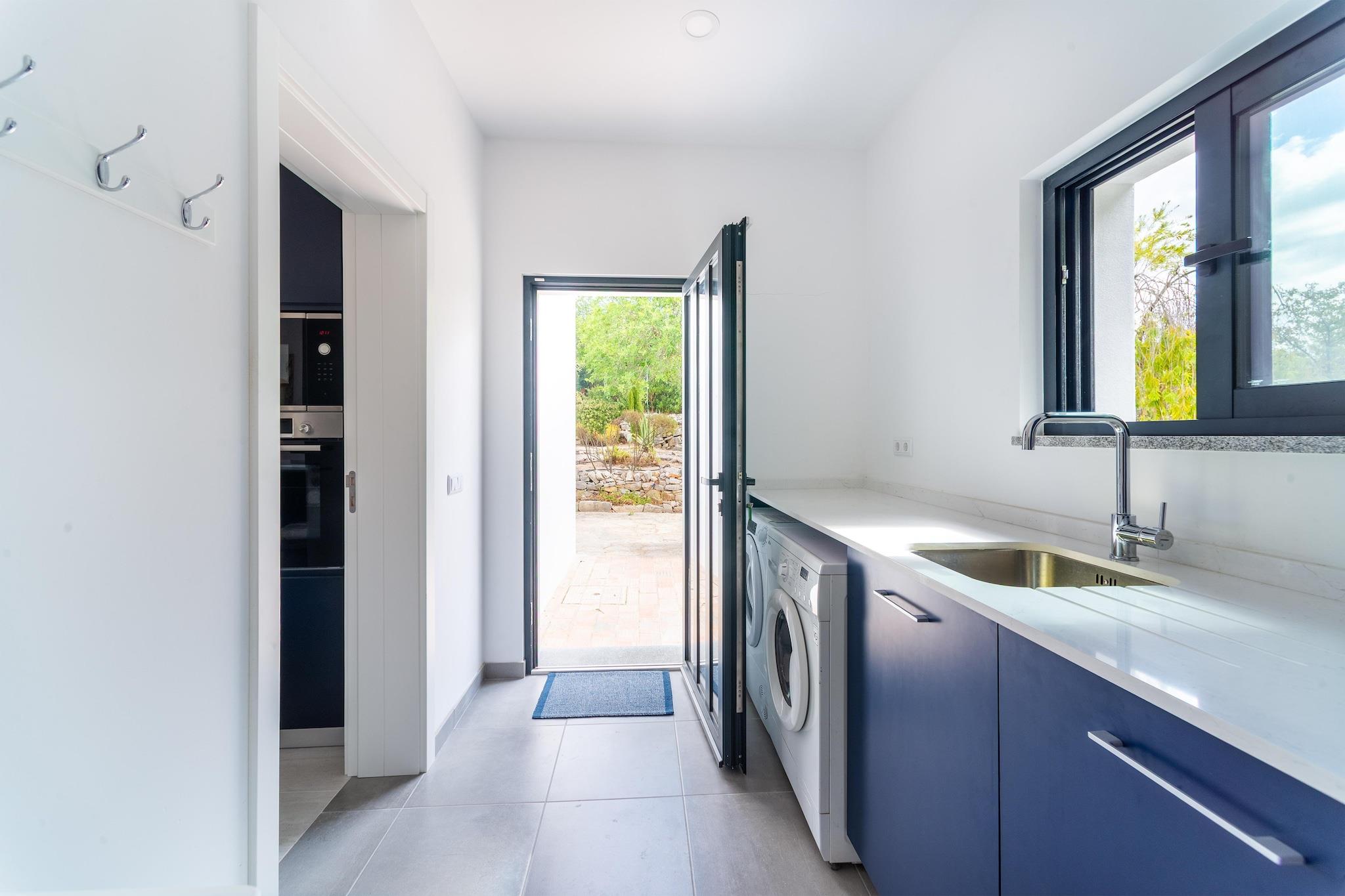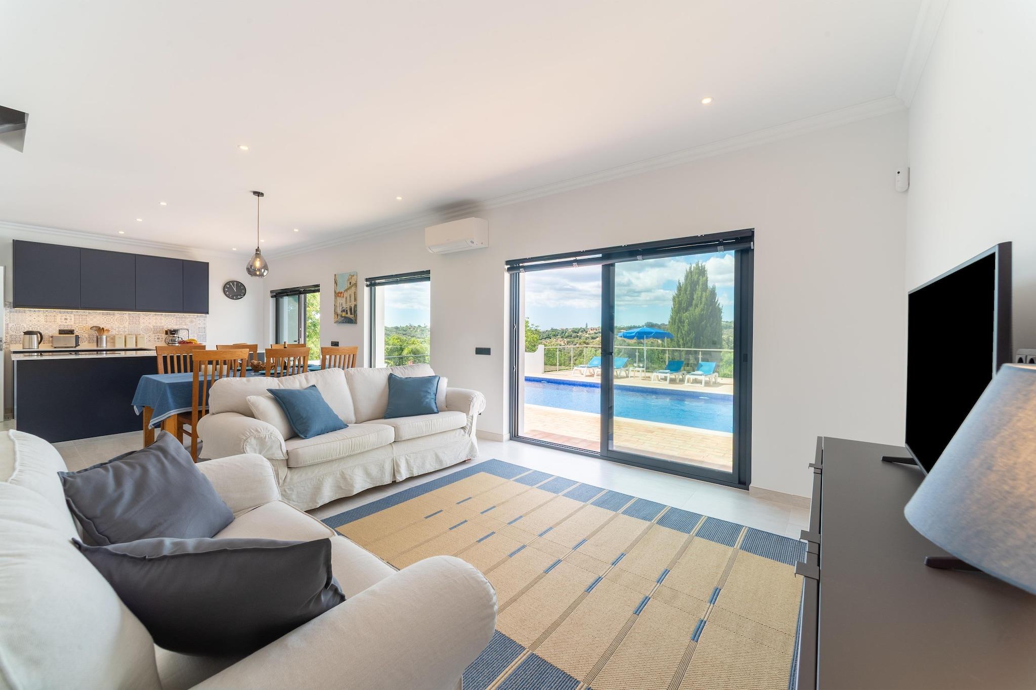 Bo i denne villa, kun 15 minutters kørsel fra Faro lufthavn. Med smukke haver og udsigt over de omkringliggende bakker er dette et virkelig fredeligt sted. To komfortable soveværelser, det ene med eget badeværelse, og et yderligere badeværelse, alle beliggende i stueetagen, kan rumme op til 4 personer, perfekt til to par eller en familie. Der er en åben stue med køkken, spiseplads og opholdsstue med smart-tv og dvd. Der er også wi-fi. Det nye, fuldt udstyrede køkken har indbygget ovn, induktionskomfur, mikroovn, opvaskemaskine og et amerikansk køleskab/fryser med vanddispenser og ismaskine. Der er også kedel, brødrister og kaffemaskine. Der er et separat vaskerum med vaskemaskine og tørretumbler. Alle værelser har aircondition til både køling og opvarmning. Udearealet har en 10 m x 5 m privat pool beliggende på en sydvestvendt terrasse. Der er fire liggestole med poolhåndklæder, to parasoller og en spiseplads. Den overdækkede terrasse har komfortable møbler til afslapning. Nogle af de smukkeste strande og golfbaner i Algarve ligger kun 15 km væk. I den øverste del af ejendommen er der et privat og aflukket område, der tilhører ejeren og er adskilt fra resten af huset. Dette område vil aldrig blive benyttet af ejeren, mens der er gæster til stede.