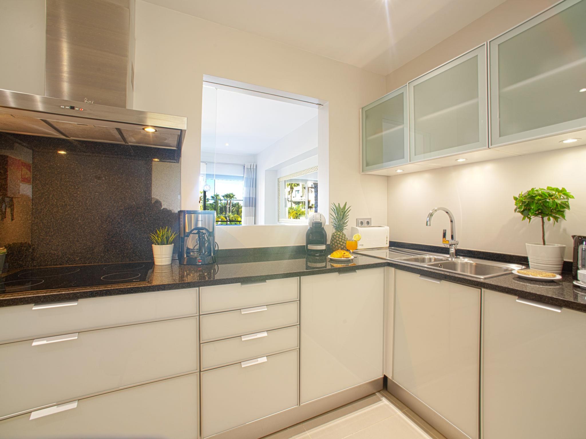 "Pine Hills Esmeralda", 3-room apartment 114 m2 on 1st floor. Modern and cosy furnishings: living/dining room with 1 sofabed (140 cm, length 190 cm), dining table, TV, international TV channels, flat screen, air conditioning and forced-air heating. Exit to the terrace. 1 room with 2 beds (90 cm, length 195 cm), shower/WC, air conditioning and forced-air heating. 1 room with 1 french bed (180 cm, length 195 cm), bath/WC, double hand-basin, air conditioning and forced-air heating. Exit to the terrace. Kitchen (oven, dishwasher, 4 ceramic glass hob hotplates, microwave, freezer, electric coffee machine, Capsules for coffee machine (Dolce Gusto Not Incl)). Sep. WC. Terrace furniture, deck chairs (2). Side view of the swimming pool and the garden. Facilities: washing machine, iron, children's high chair, baby cot for up to 2 year olds, hair dryer. Internet (WiFi, free). Parking space n L57 (roofed), garage. Please note: suitable for families. Non-smokers only. Fire extinguisher. 22794/AL