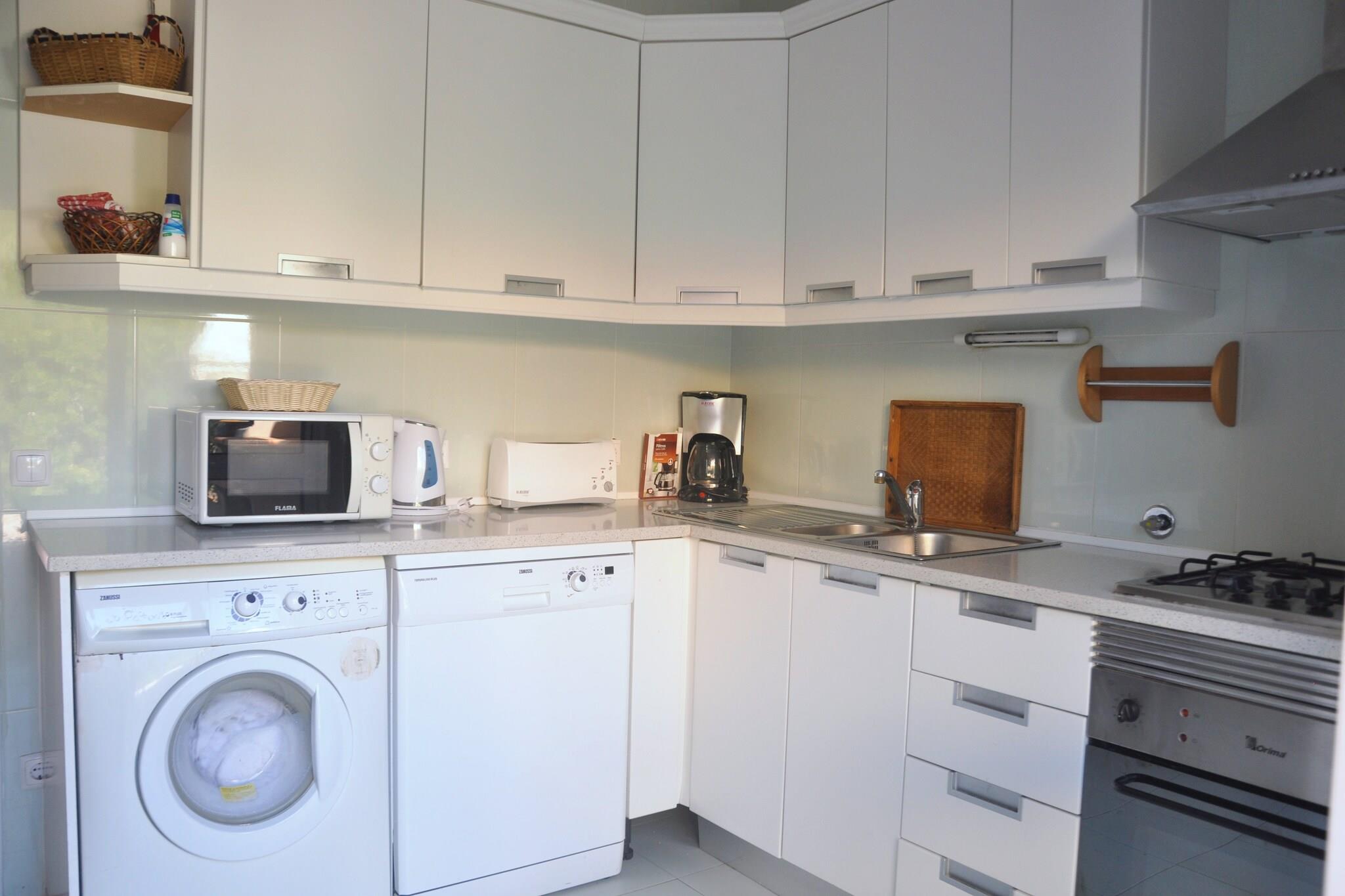 Stueetage: (Køkken(komfur(gas), ovn, mikrobølgeovn, opvaskemaskine , køle-fryseskab, vaskemaskine), stue / spisestue(Fjernsyn(parabol), pejs, DVD-afspiller, stereoanlæg, klimaanlæg), Soveværelse med badeværelse(dobbeltseng, bruser, 2x håndvask, toilet, bidet, klimaanlæg)) På 1. etage: (soveværelse(2x enkeltseng, klimaanlæg), soveværelse(2x enkeltseng, klimaanlæg), badeværelse(badekar med bruser, 2x håndvask, toilet, bidet)) kakkelovn, kaffemaskine, badekar eller bruser, bruser, patio, terrasse(privat), have, havemøbler, solstole, grill(trækul), liggestole, Parasol, swimmingpool(privat, 4 x 3 m.), strygebræt