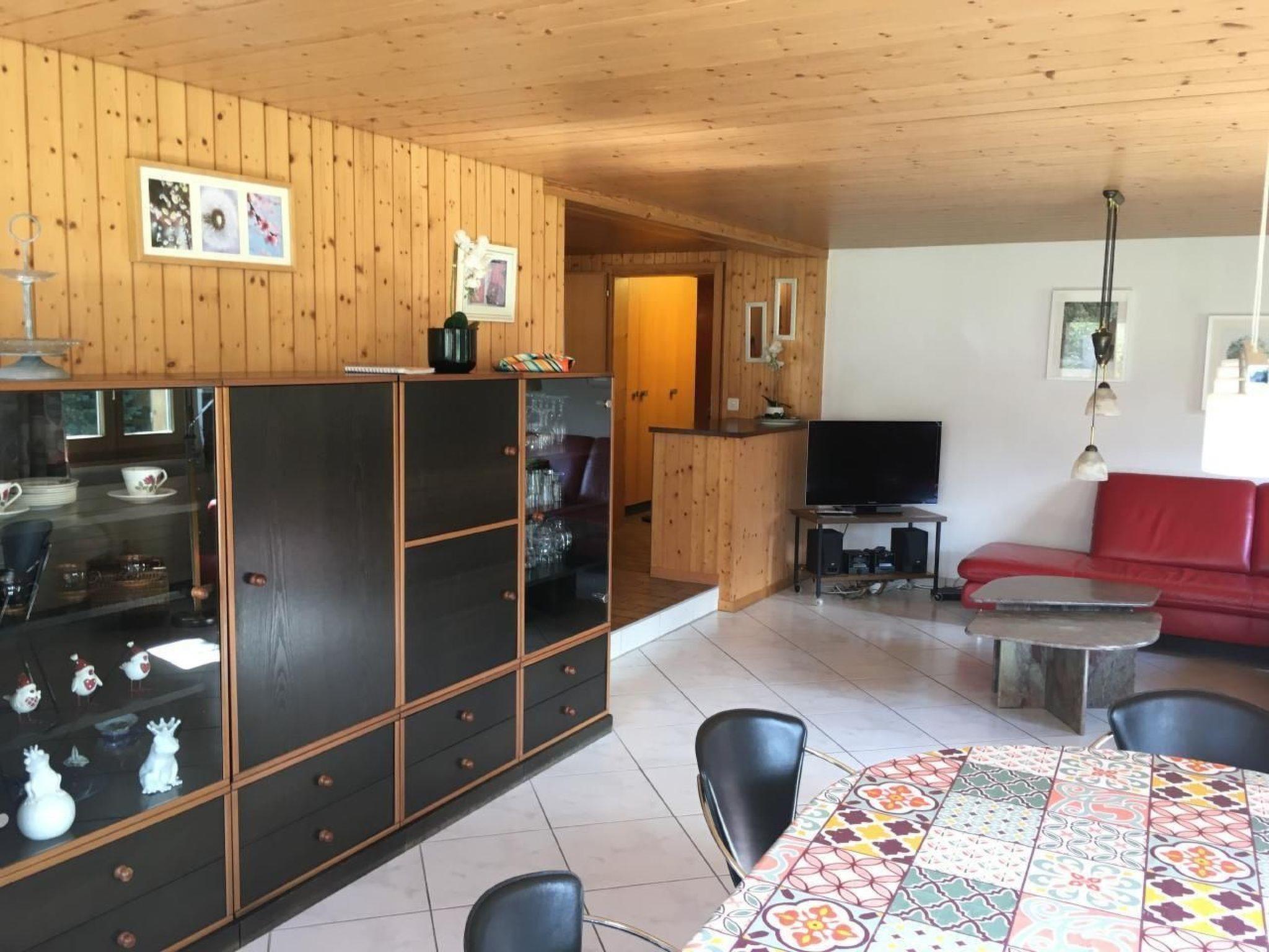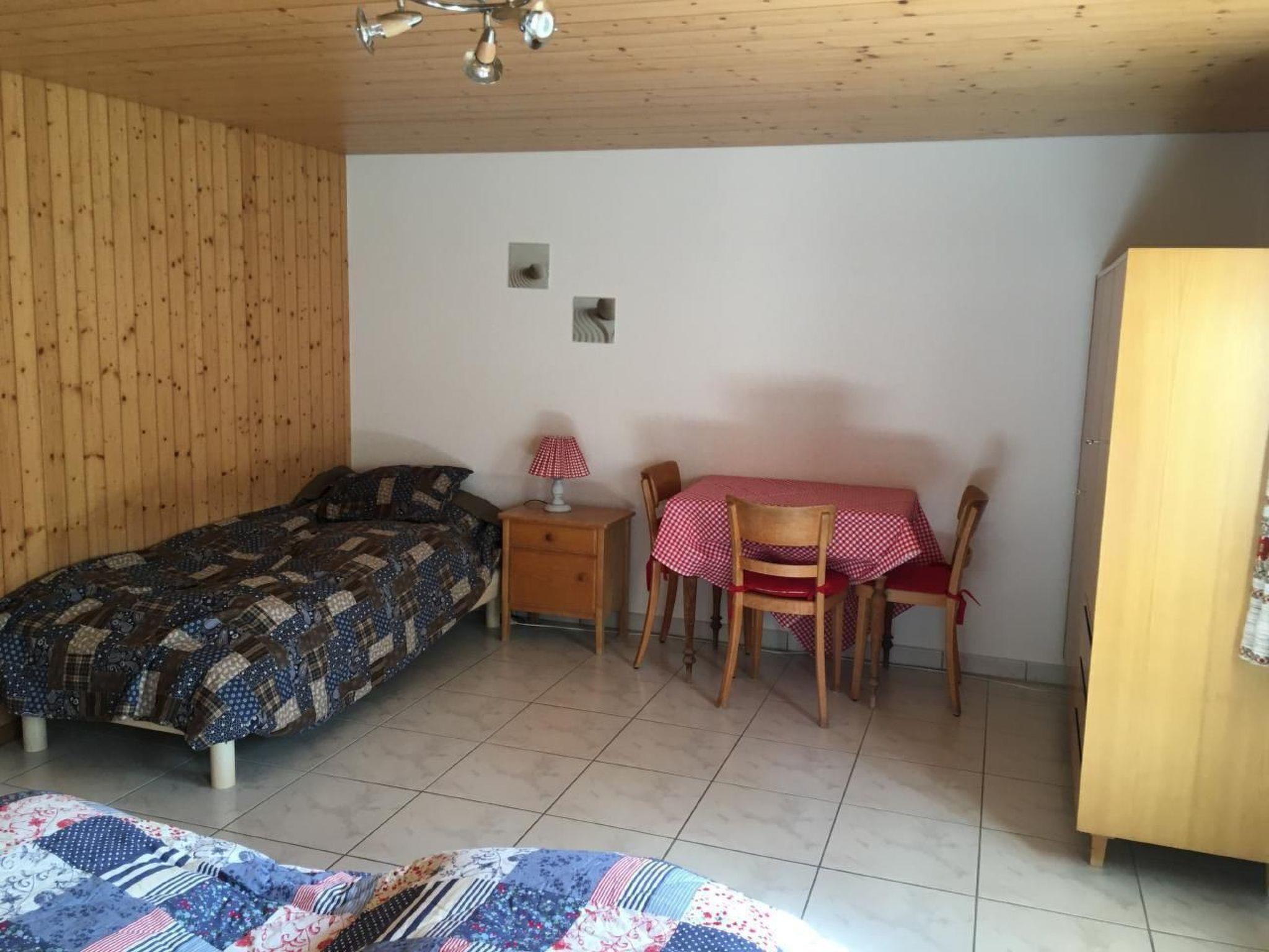 3.5 room flat in the basement of an apartment building. Living space: 93m2. Bath/shower/WC. Bedroom with 2 single beds, bedroom with 3 single beds, a cot can be added if desired. Bed linen is provided. Living/dining kitchen with oven, large refrigerator, dishwasher and extensive cookware; kitchen towels are provided. In the large living room with cable TV, WLAN and radio there is a cosy sitting area and a table with 6 chairs. Directly from the living room you come to a terrace with seating and fireplace. A large parasol can be set up if required.