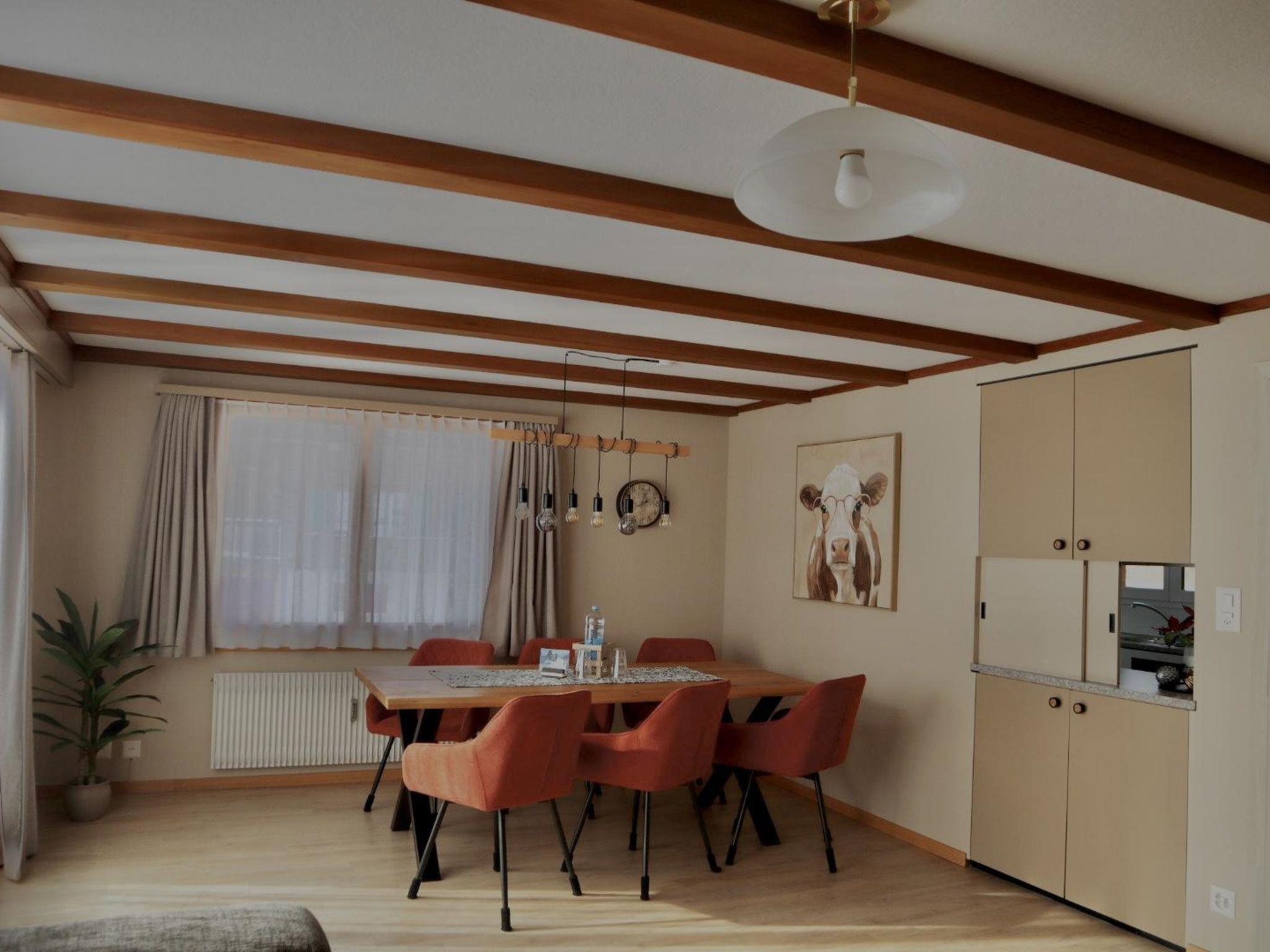 80 m2. More information by the provider: This spacious, sunny 3-room apartment (80 m²) is located on the upper floor of a charming 2-family chalet in Adelboden-Boden and accommodates up to 4 people. The apartment features a large balcony with breathtaking views of the surrounding mountain landscape and the Engstligen waterfall. It includes two cozy bedrooms and an inviting living room with TV, radio and free internet access. The well-equipped kitchen has a practical serving hatch to the living room. A free parking space in the nearby underground garage is available. Unfortunately, pets are not allowed, making this apartment especially attractive for allergy sufferers. This accommodation offers everything you need for a relaxing holiday in the Swiss Alps.