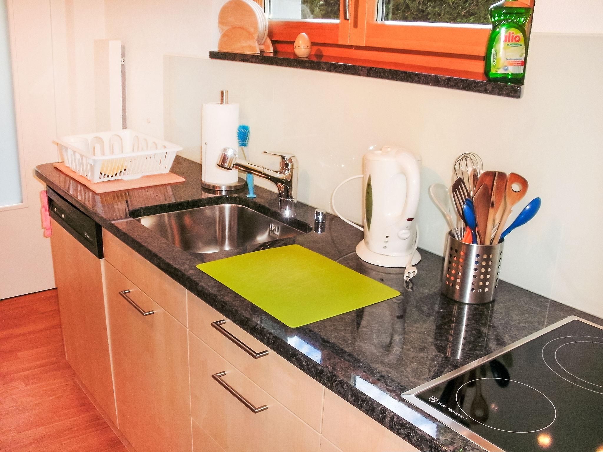"Tanno", 3-room apartment 71 m2, on the ground floor. Practical and cosy furnishings: living/dining room with satellite TV (flat screen), radio. Exit to the patio. 1 double bedroom with hand-basin. Exit to the patio. 1 double bedroom. Kitchen (oven, dishwasher, 4 ceramic glass hob hotplates, toaster, kettle, microwave, freezer) with dining table. Shower, sep. WC. Electric heating, wood heating. Patio 40 m2. Deck chairs (4), box-room. Beautiful view of the mountains, the countryside and the resort. Facilities: Internet (WiFi, free). Please note: non-smokers only. Enjoy the hospitality of the owner. Discounts on Rähtische Bahn tickets and other services can be arranged by the owner for you. Please contact the owner soon enough.