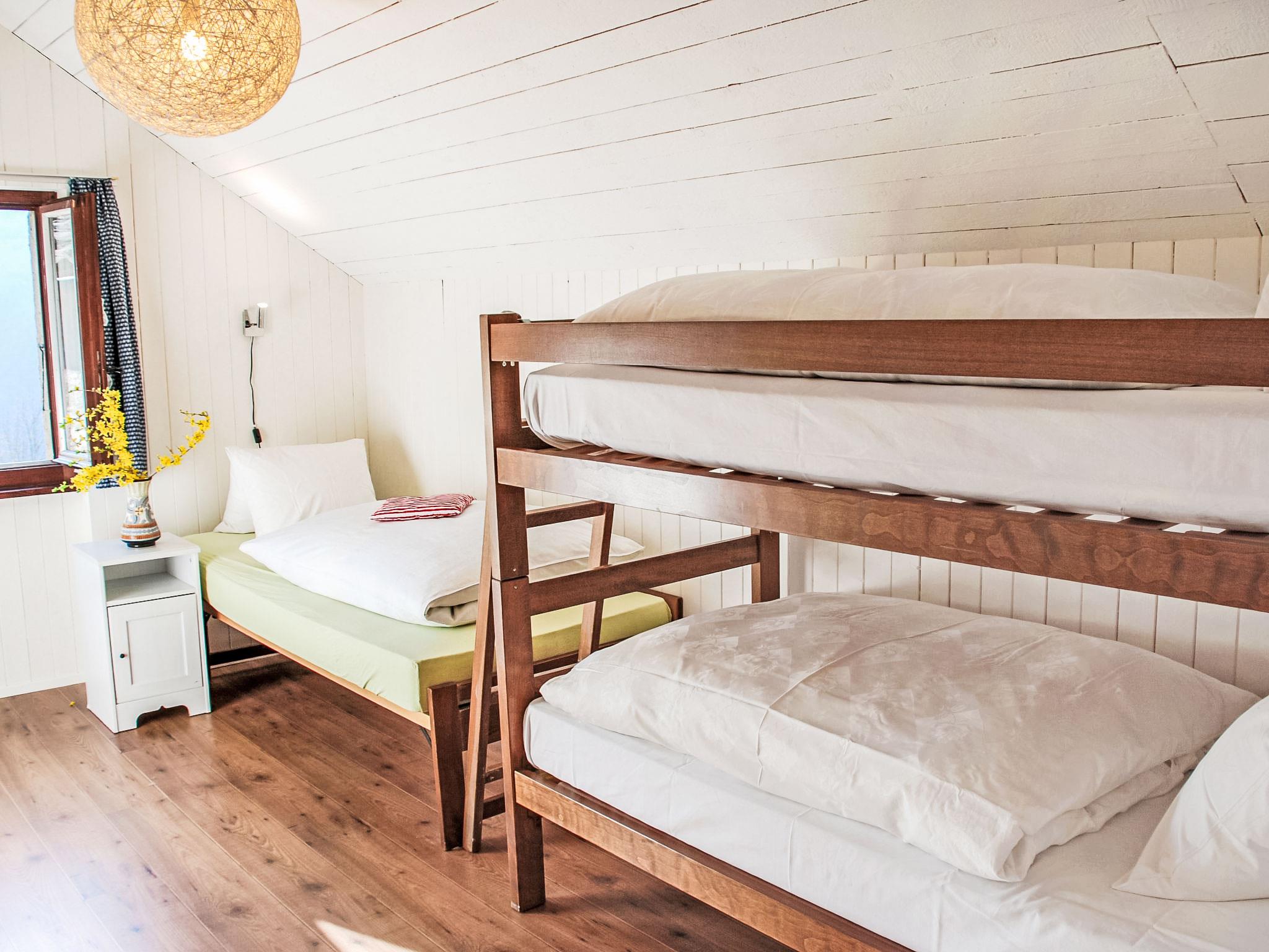 "Marianne Plus", 3-room house 100 m2 on 2 levels, south facing position. Partly with sloping ceilings, partly renovated in 2017, comfortable and cosy furnishings: open living/dining room with 1 sofabed (140 cm, length 190 cm), open-hearth fireplace, satellite TV, flat screen and radio. Exit to the patio. Open kitchen (oven, dishwasher, 4 ceramic glass hob hotplates, electric coffee machine, raclette grill, fondue Set (cheese)). Exit to the terrace. Upper floor: (steep stair), 1 double bedroom with sloping ceilings with 2 beds (90 cm, length 200 cm). 1 room with sloping ceilings with 1 bed (90 cm, length 200 cm), 1 x 2 bunk beds (90 cm, length 200 cm). Shower/WC. Electric heating. Natural stone floors. Small patio 10 m2, partly roofed. Barbecue, sitting area. Partial view of the mountains and the countryside. Facilities: children's high chair, baby cot for up to 3 year olds (extra), hair dryer, logs (extra). Please note: non-smoking house. Maximum 3 pets/ dogs allowed. Idyllic setting in the middle of nature, for nature lovers and long walks with dogs. Very calm ! You just have to relax and enjoy. NL-00003835