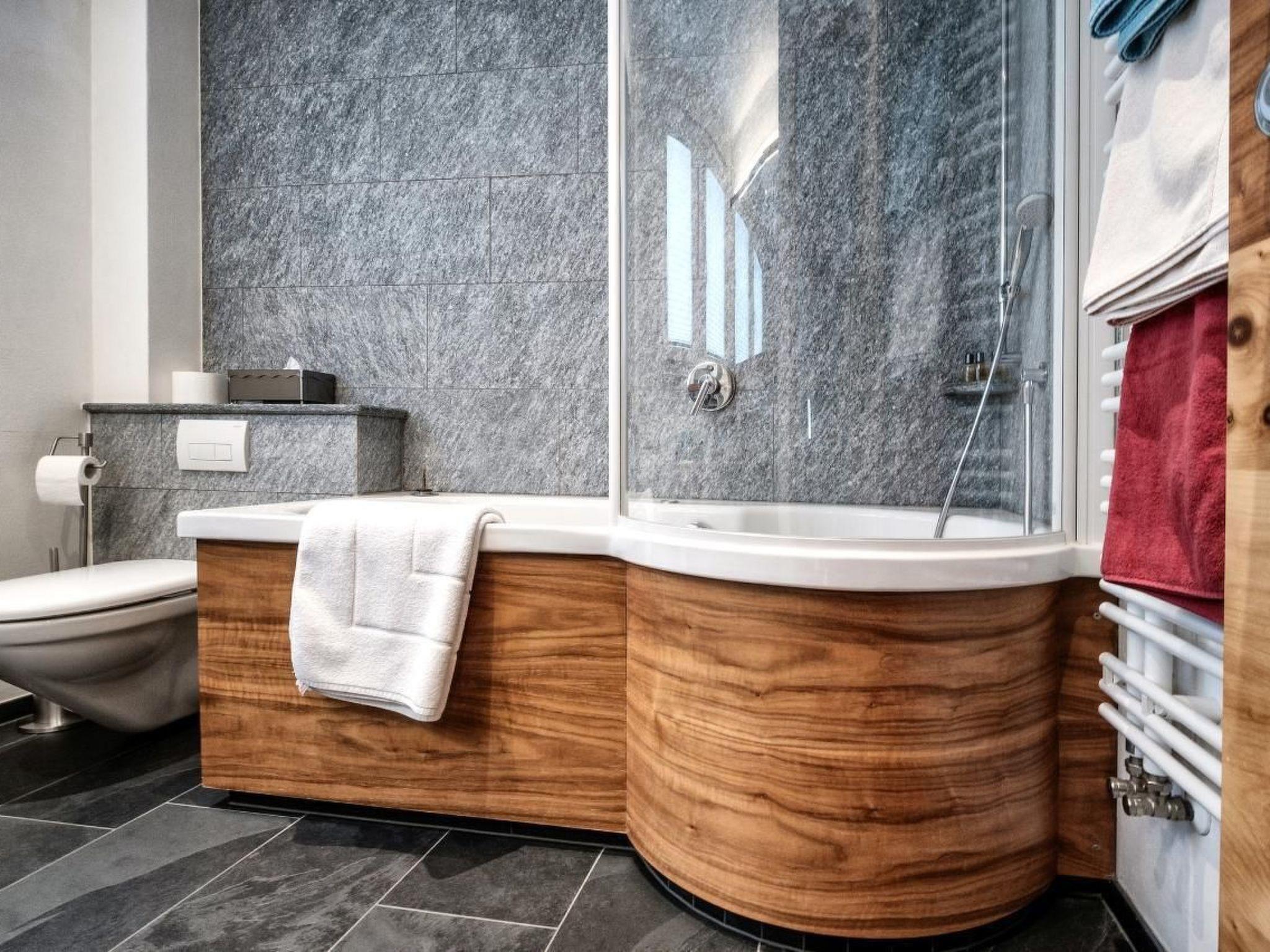 On the ground floor you will find the cozy swiss pine living room with the huge terrace, a modern and fully equipped kitchen with the separate dining room.