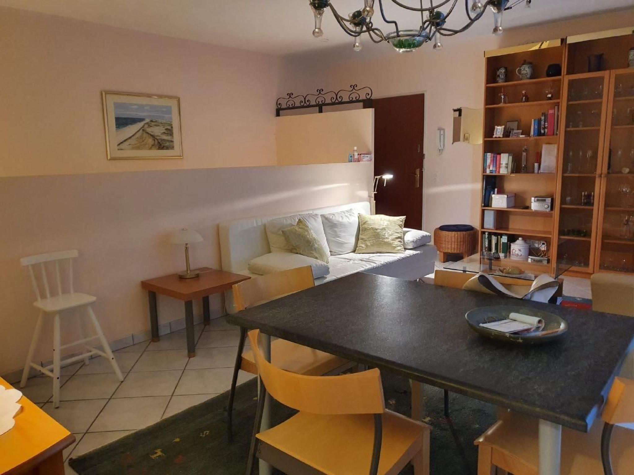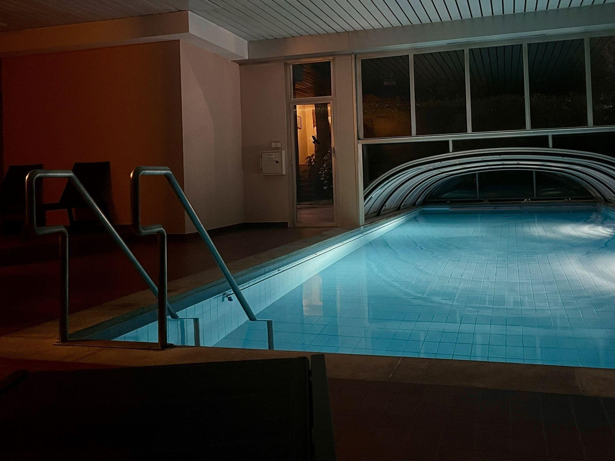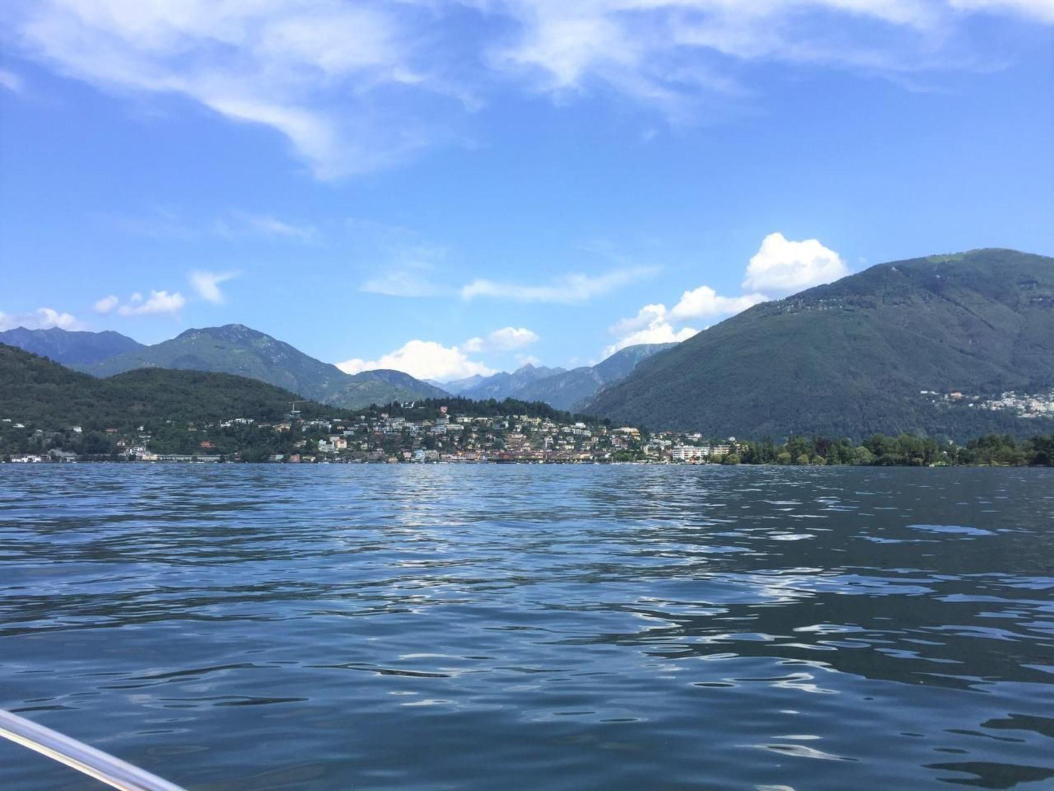 Holiday flat Casa alle Vigne with pool and sauna, centrally located, just a few minutes' walk from Lake Maggiore. The flat is on the 1st floor of an apartment block in a central location, with balcony. There is a lift in the building. The well-kept garden offers a large lawn and stone sunbathing area, as well as a heated combined indoor and outdoor swimming pool measuring 15 x 5 metres, fully covered (the convertible roof can be opened in summer) and can be used all year round, as well as a sauna, showers and WC. Non-smoking flat. Furnished 1 1/2 room flat (50m2) with separate kitchen, ceramic hob, oven, dishwasher, fridge with freezer compartment, Nespresso coffee machine. Living/dining room with upholstered furniture (convertible into sofa bed 140cm wide), sleeping area separated by a half wall with 2 single beds one behind the other, satellite TV, DVD, DAB+ radio with Bluetooth, WLAN and air conditioning. Bathroom with bathtub and WC. Balcony with table and chairs. Separate wardrobe room with wardrobes. The Piazza of Ascona is approx. 8 minutes' walk away.