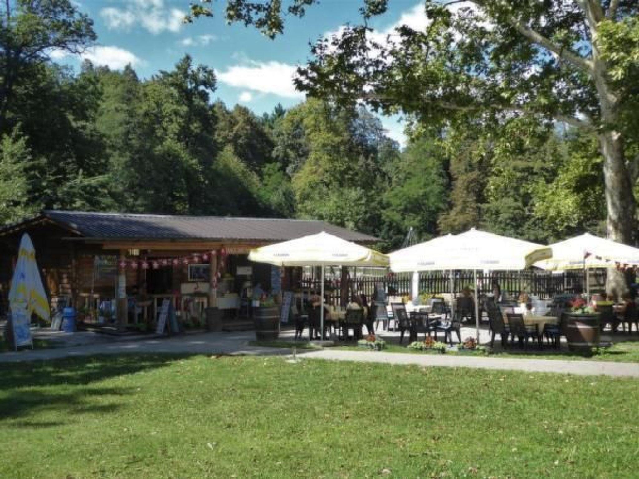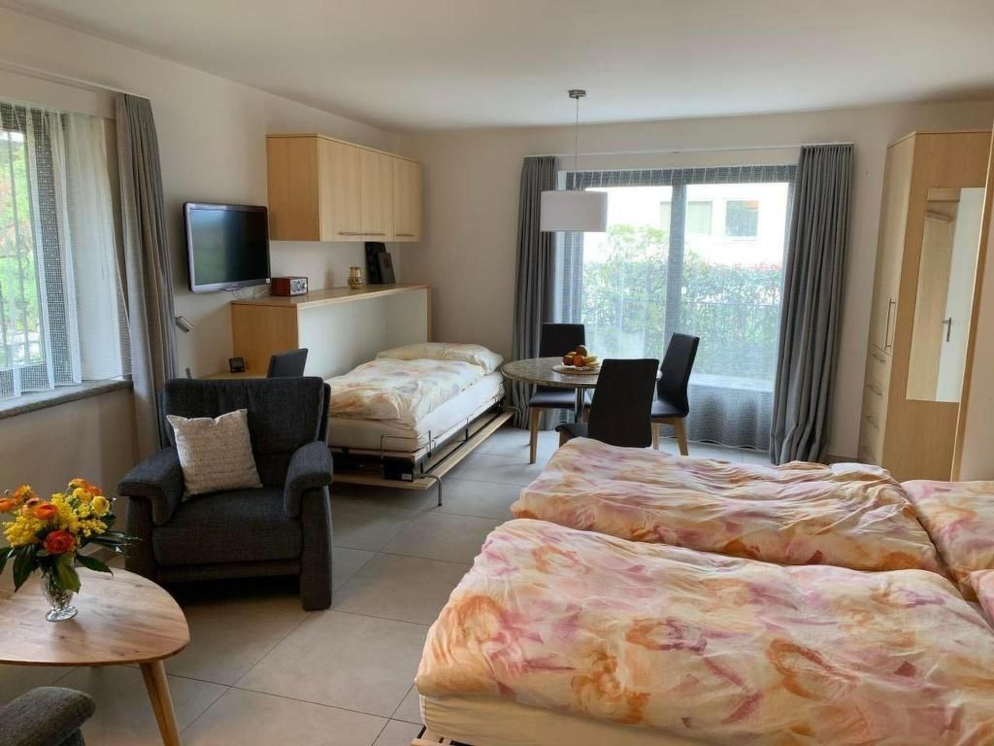 Garden flat: Cosy one-room flat with seating area (15 m2) on the east side and view of the garden. Table and deckchairs are available on the seating area. Living/bedroom with three full-size foldaway beds, a sofa, armchair and dining table. Separate kitchen, bathroom with WC, washbasin and shower. Newly designed garden in spring 2023, behind the house a large garden (800 m2), surrounded by trees and palm trees with granite table, granite bench under a pergola and barbecue area invites you to linger. This garden with table tennis table, climbing tower with slide, swing and sandpit is also an ideal playground for children. In spring 2023, we redesigned the garden (raising the terrain, reseeding the lawn, pergola). The garden is now accessible via a footpath directly from the public car park. Bicycles, trailers and pushchairs can be parked in the garden in a wooden garage with a charging socket.