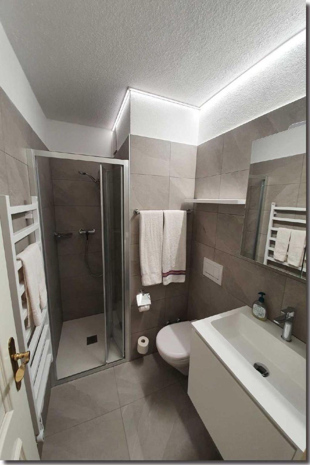 The charming flat no. 3A on the ground floor boasts a south-facing position and direct access to the communal garden. Inside, you will find an elegant living room with an open-plan kitchen that leaves nothing to be desired: Microwave oven, traditional oven, ceramic hobs, dishwasher and a large fridge with separate freezer compartment under an elegant granite top. There is a master bedroom, a children's bedroom with a double bed and an additional folding bed. Two bathrooms, equipped with built-in washbasins, toilets, a bathtub or shower tray and towel dryers, provide the necessary comfort.
