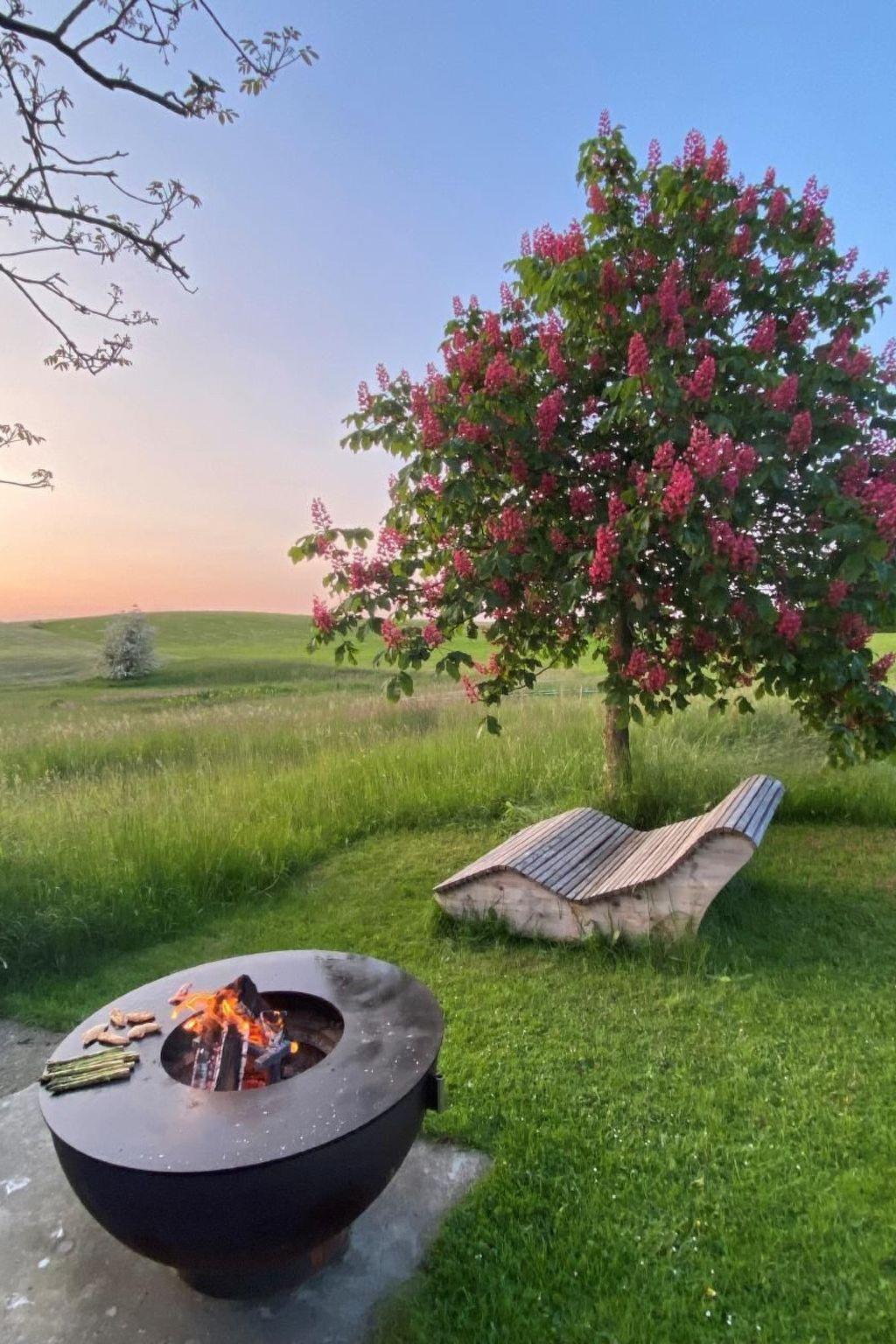 Private garden seating area, barbecue facilities in the evening sun with a view of the wonderful natural moor.