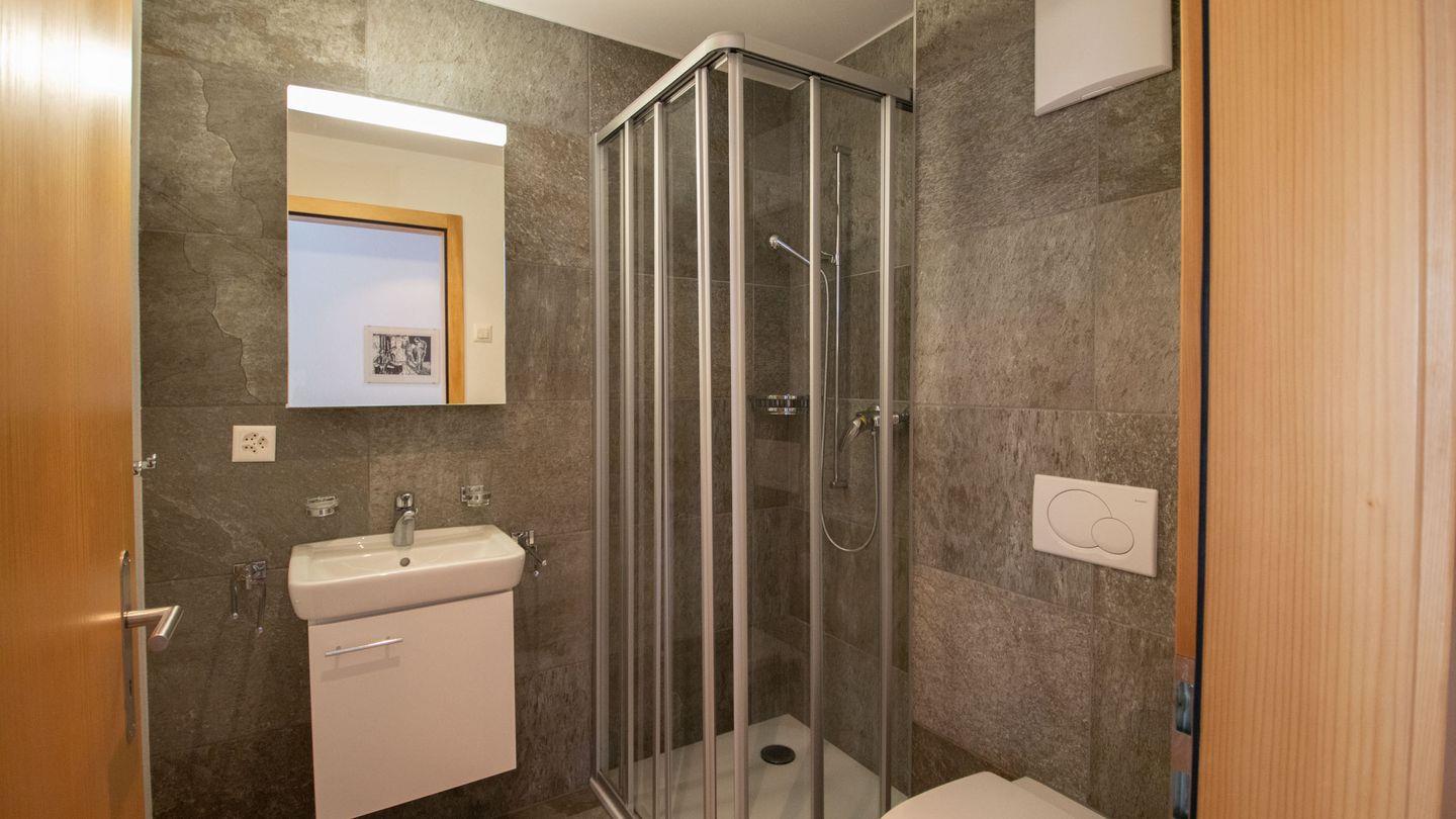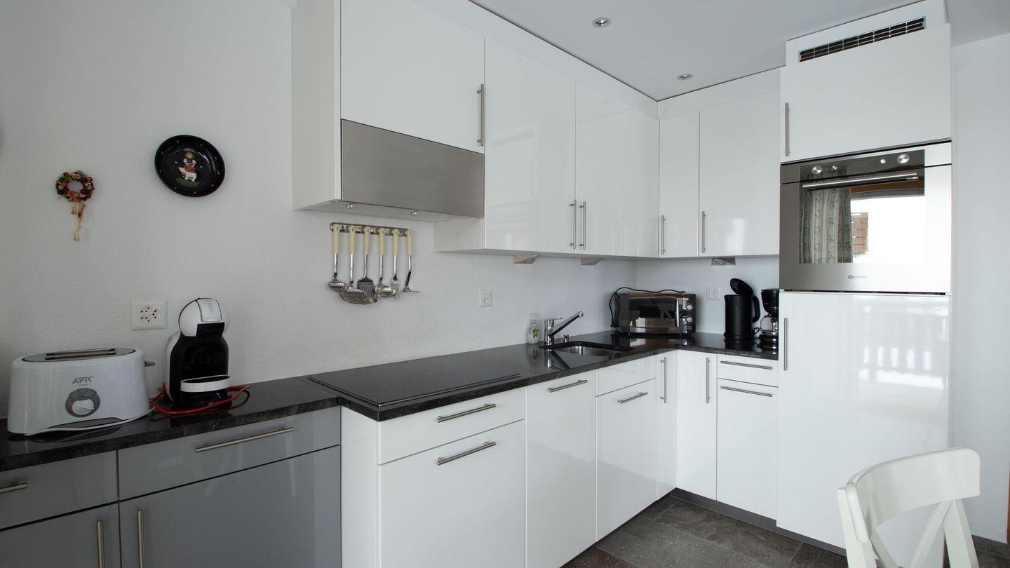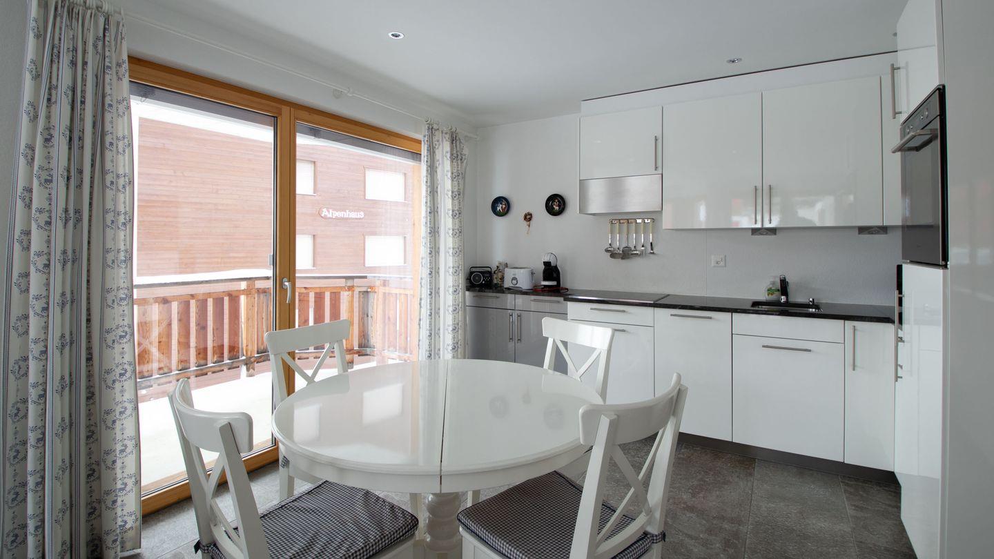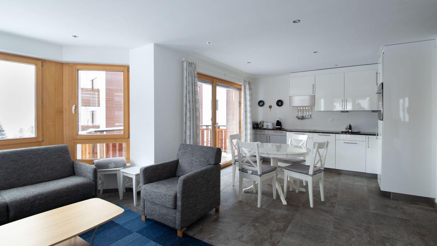 Die Wohnung hat einen sehr hohen Ausbaustandart und ist 1. Stock des Hauses. Sie unterteilt sich in 2 Schlafzimmer für je 2 Personen, 2 Badezimmer mit Dusche, WC und Lavabo. Schlafcouch in Wohnzimmer für eine Person. Garderobe, Wohn/Esszimmer mit offener Küche, der gebaute Erker gibt dem Wohnzimmer eine spezielle Note. 2 Balkone nach Osten und Süden geben grosse Möglichkeit die Berge zu bewundern. Herrliche Aussicht auf die Bergwelt.