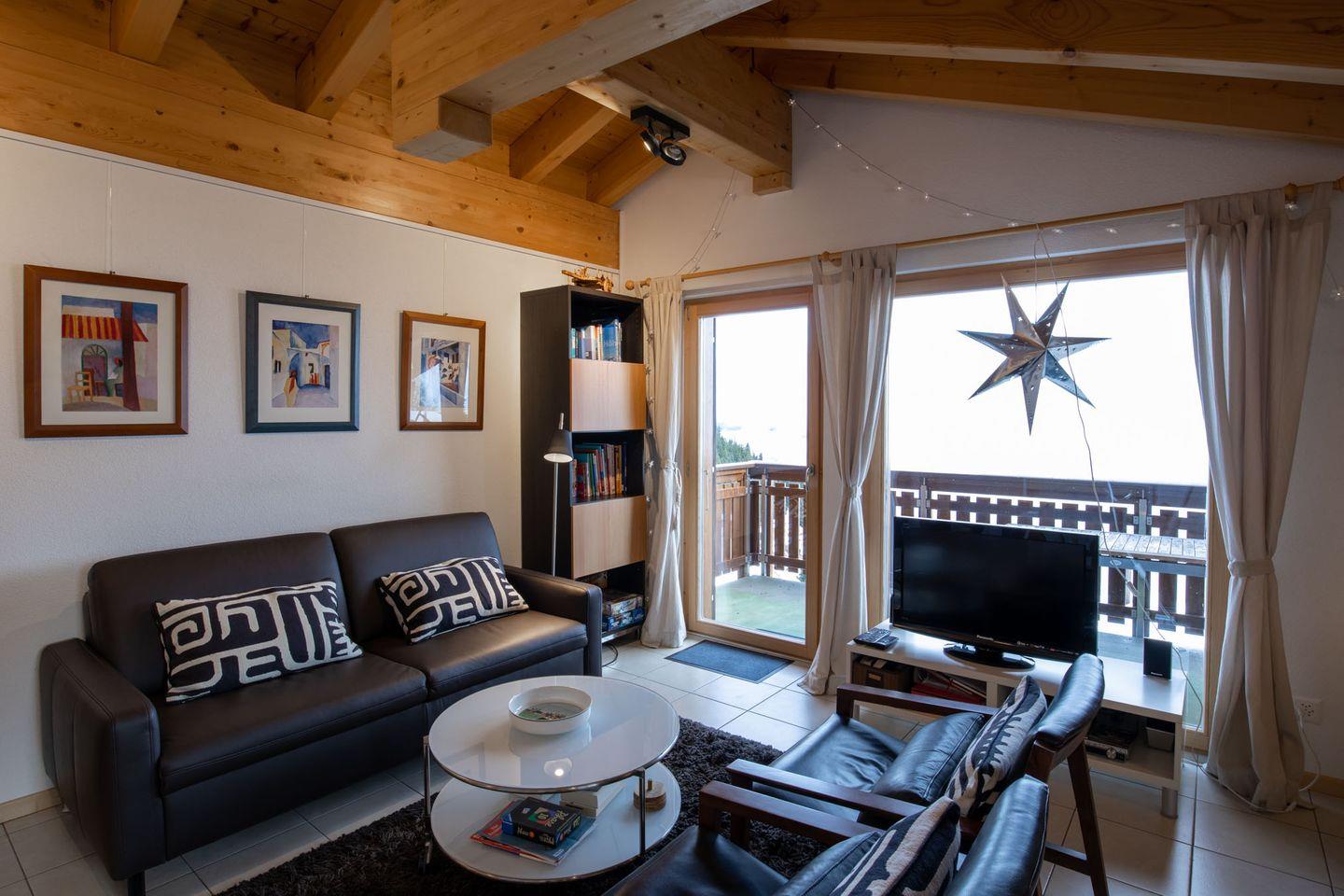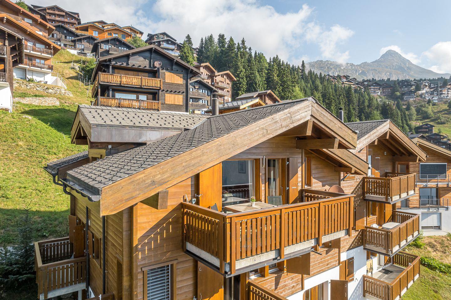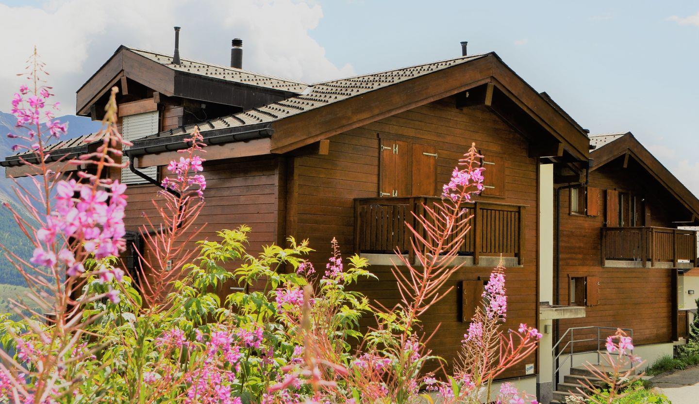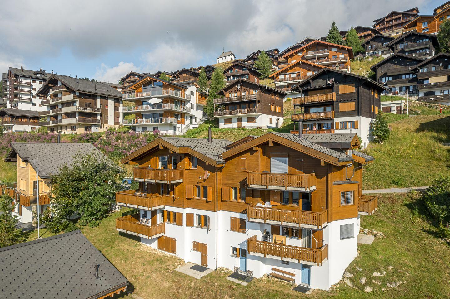 Das Haus ist nach Süden ausgerichtet und bietet einen freien Blick auf die gegenüberliegenden Gomser Berge bis hin zu den beeindruckenden Walliser Alpen (Mischabel-Gruppe mit dem Dom, 4.545 m). Die Wohnung umfasst 3,5 Zimmer und verfügt über sowohl einen Süd- als auch einen Nordbalkon.
