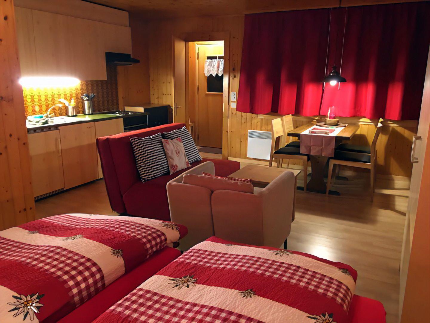 Chalet Abendglöckli, zentrale, ruhige Lage, Mitte in Dorfzentrum, direkt gegenüber Supermarkt Coop und 5 Minuten von der Luftseilbahn. 35m2 grosses Studio für 2 - 3 Personen, Aussensitzplatz, Skiraum, fantastische Aussicht auf Berge und auf die berühmte Kapelle "Maria zum Schnee", Südseite, sonnige Lage. 3 Minuten zur Sesselbahn ins wunderschöne Ski- und Wandergebiet. 2 Minuten zum Bäcker, 3 Minuten bis zum Lebensmittelgeschäft. Satellit TV, W-lan Babybett vorhanden