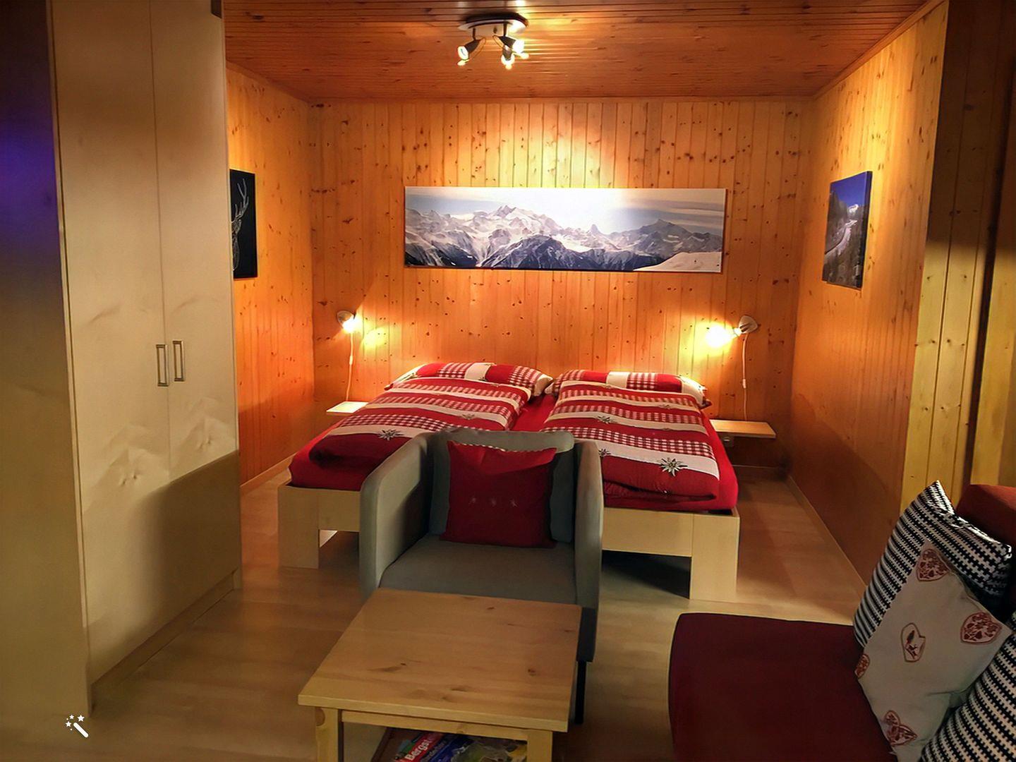 Chalet Abendglöckli, zentrale, ruhige Lage, Mitte in Dorfzentrum 5 Minuten von der Luftseilbahn und direkt gegenüber Supermarkt Coop. 35m2 grosses Studio für 2 - 3 Personen, Aussensitzplatz, Skiraum, fantastische Aussicht auf Berge und auf die berühmte Kapelle "Maria zum Schnee", Südseite, sonnige Lage. 3 Minuten zur Sesselbahn ins wunderschöne Ski- und Wandergebiet. 2 Minuten zum Bäcker, 3 Minuten bis zum Lebensmittelgeschäft. Satellit TV, W-lan Babybett vorhanden