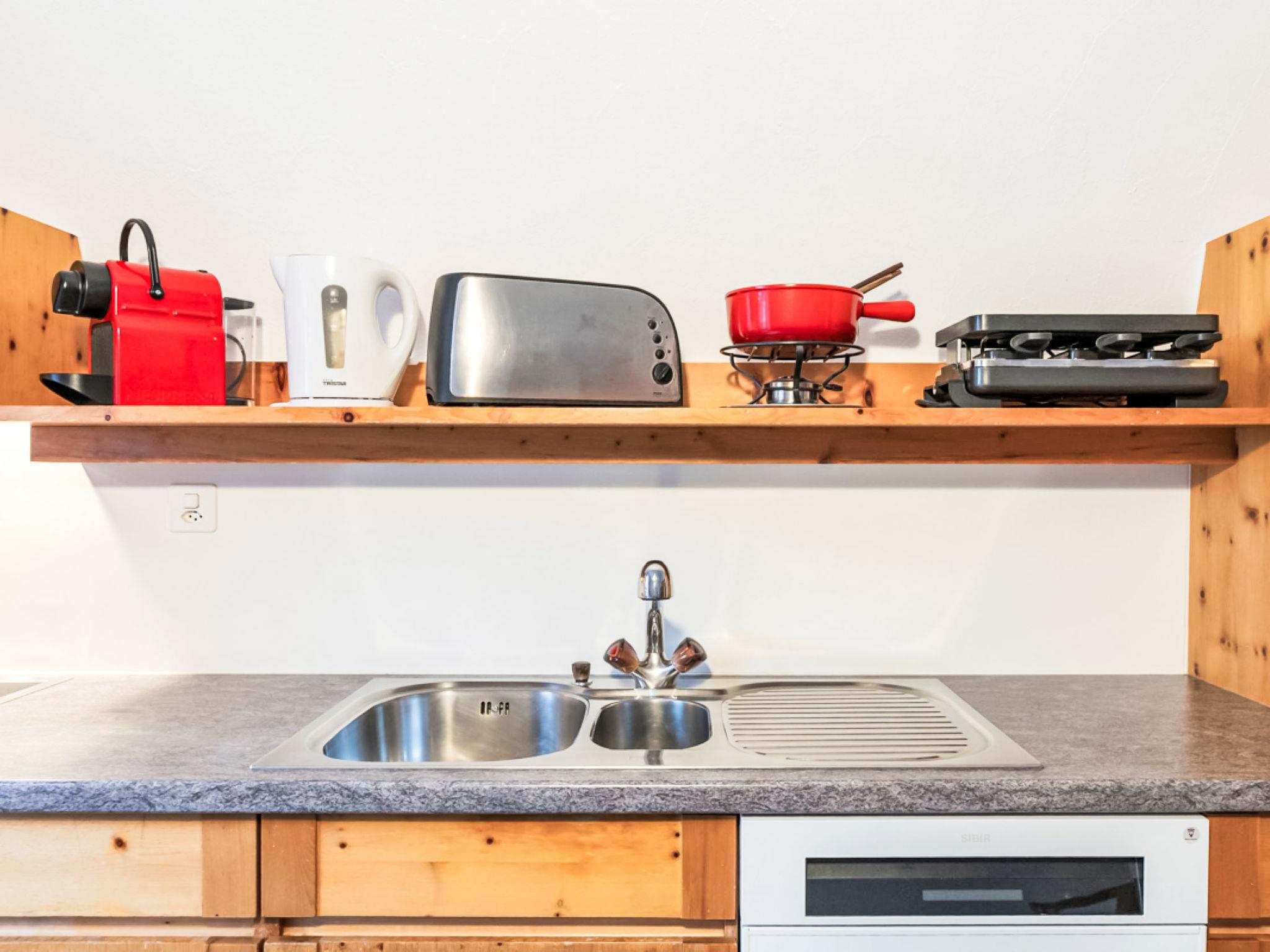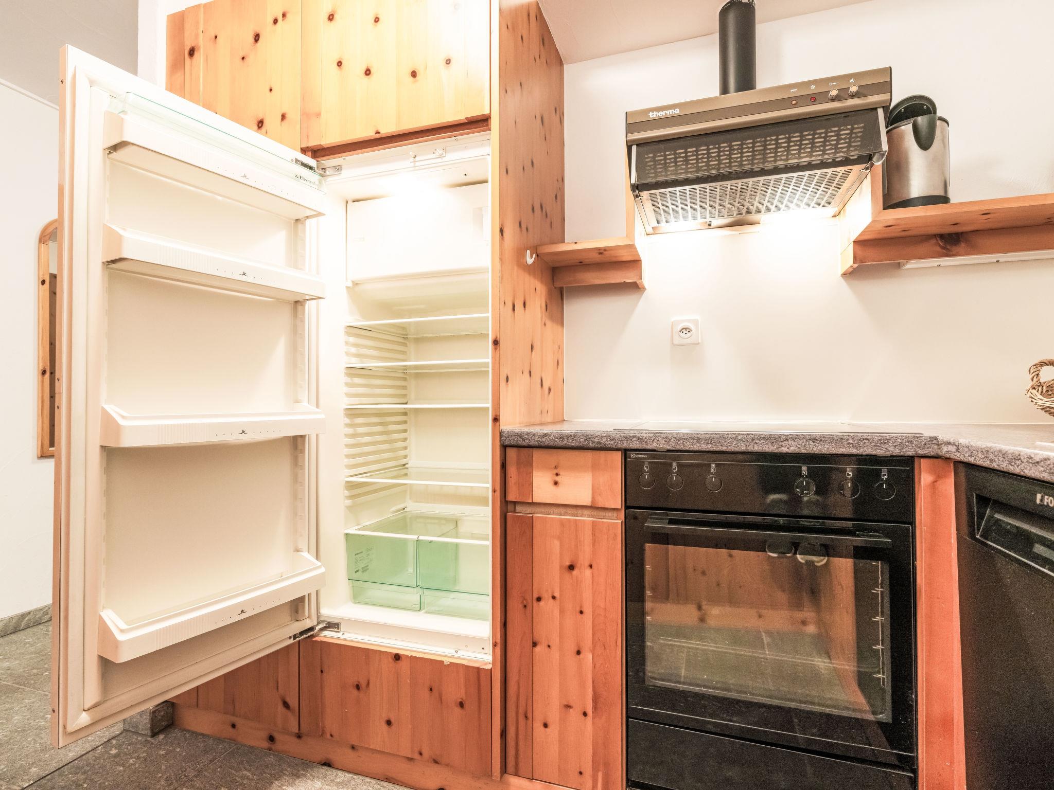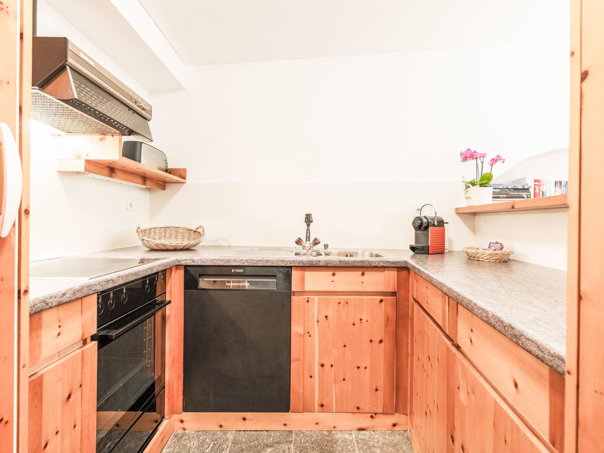 The open-plan living and dining area has a Swiss stone pine kitchen with a stove, oven, dishwasher, large fridge and Nespresso machine. A Swedish stove provides cozy warmth. Two additional beds are available in the living area.
