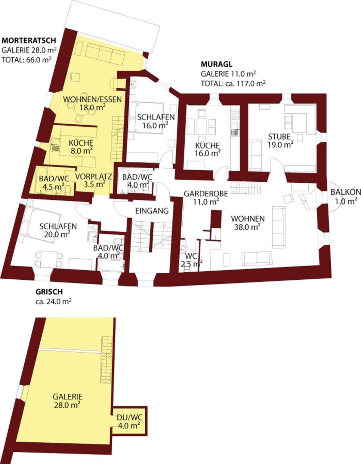 Die Wohnung Morteratsch bietet auf zwei Ebenen und 66 m² ein authentisches Engadiner Wohnerlebnis mit modernem Komfort. Der helle Wohn- und Essbereich mit Schwedenofen, Esstisch und Arvenmöbeln schafft eine gemütliche, alpine Atmosphäre. Die offene Arvenholzküche ist vollständig ausgestattet – mit Kochherd, Backofen, Geschirrspüler, Kühlschrank, Nespresso-Maschine, Wasserkocher und Fonduegeschirr. Auf der Galerie befinden sich vier Schlafplätze mit antiken Möbeln – ideal für Familien oder Freunde. Zwei Badezimmer, eines mit Badewanne und eines mit Dusche, bieten zusätzlichen Komfort. WLAN, ein Flachbild-TV mit Netflix und Bodenheizung runden das Angebot ab. Die Wohnung kann bei Bedarf direkt mit dem Studio Grisch kombiniert werden – perfekt für gemeinsame Ferien mit Privatsphäre.