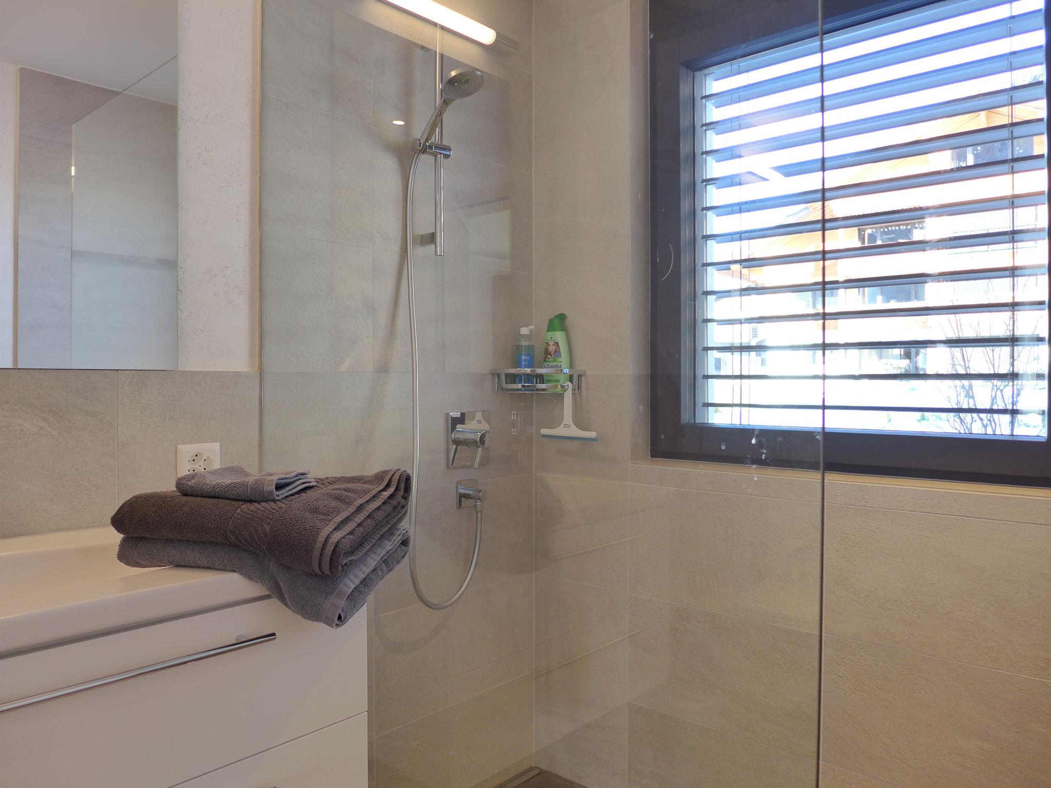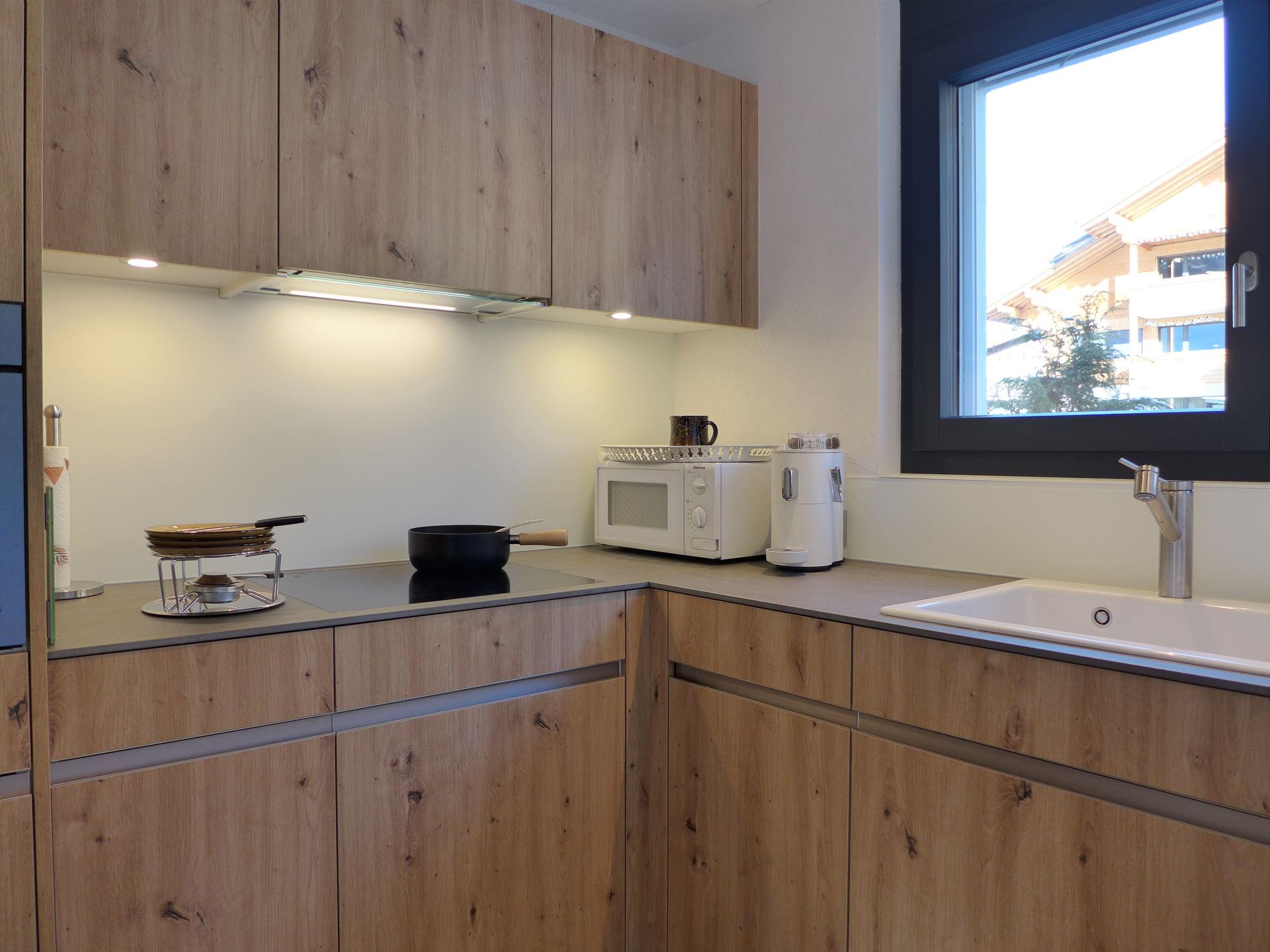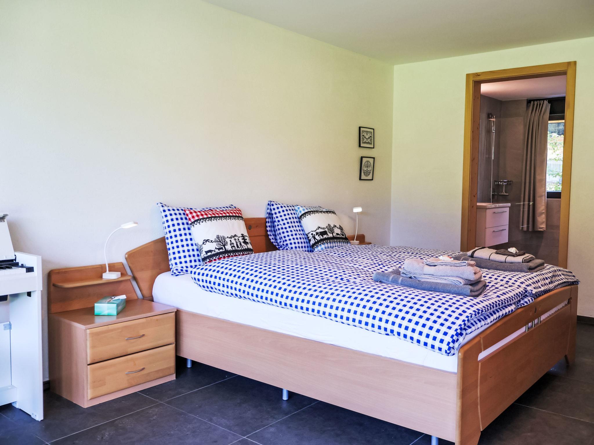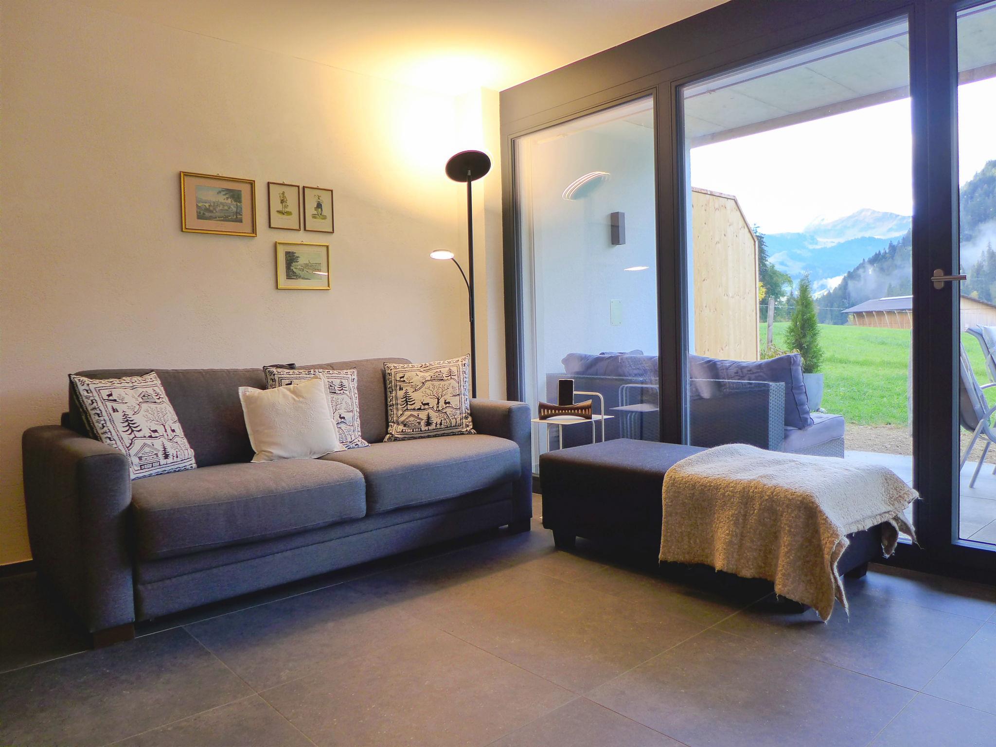 "Greenview", 2-room apartment 62 m2, on the ground floor, south-west facing position. Spacious and bright, very comfortable and cosy furnishings: open living/sleeping room with 1 sofabed, dining table and cable TV. Exit to the terrace. 1 room with 1 double bed (2 x 90 cm, length 200 cm), shower/WC. Exit to the terrace. Open kitchen (oven, dishwasher, 4 induction hot plates, toaster, kettle, microwave, electric coffee machine, Capsules for coffee machine (Nespresso) extra, raclette grill, fondue Set (cheese)). Shower/WC. Solar energy heating, underfloor heating. Solar power. Large terrace. Terrace furniture. Marvellous view of the mountains and the countryside. Facilities: Internet (WiFi, free). Parking (roofed, 1 car). E-charging station. Please note: non-smokers only. Maximum 1 small pet/ dog allowed.