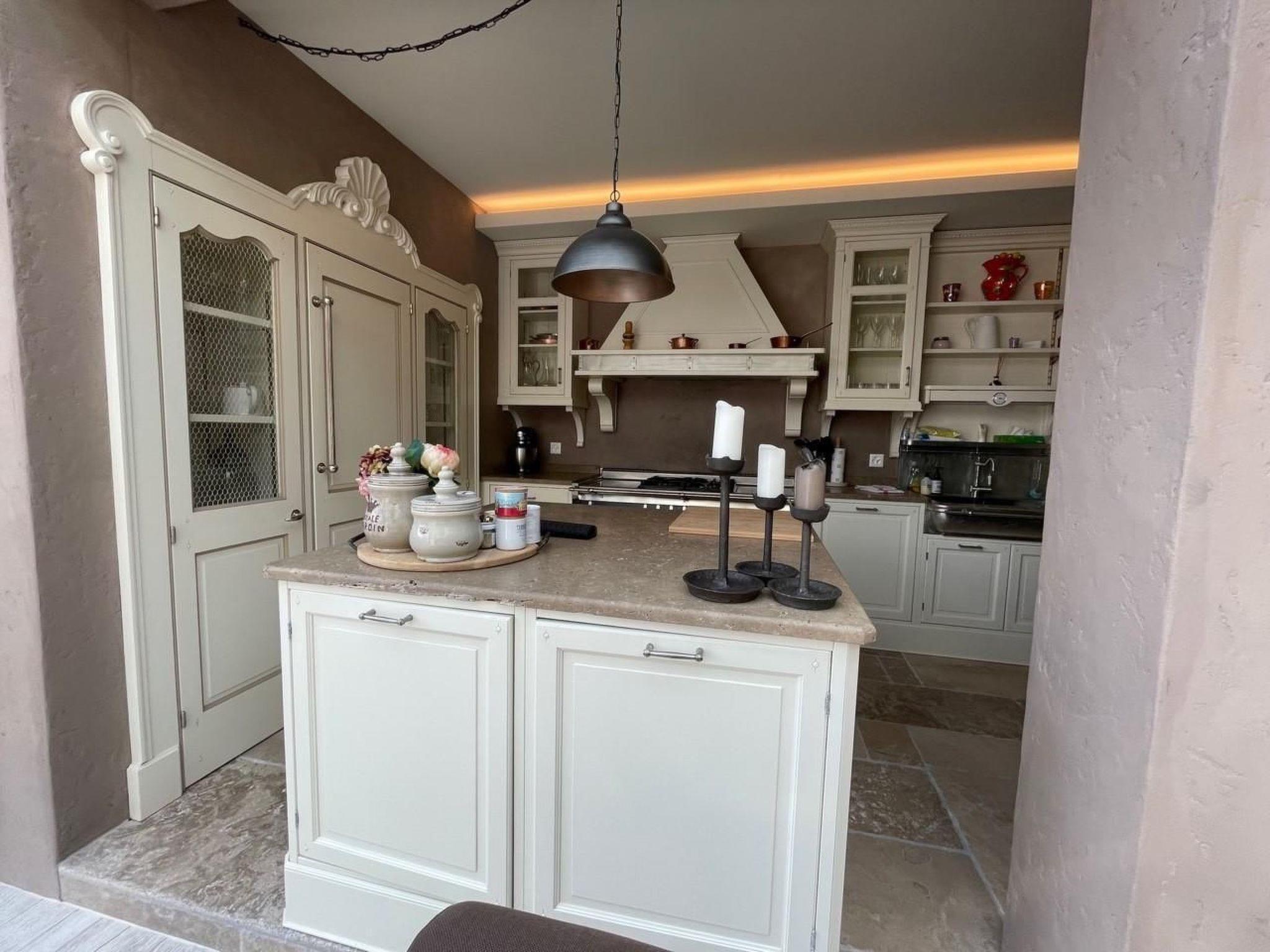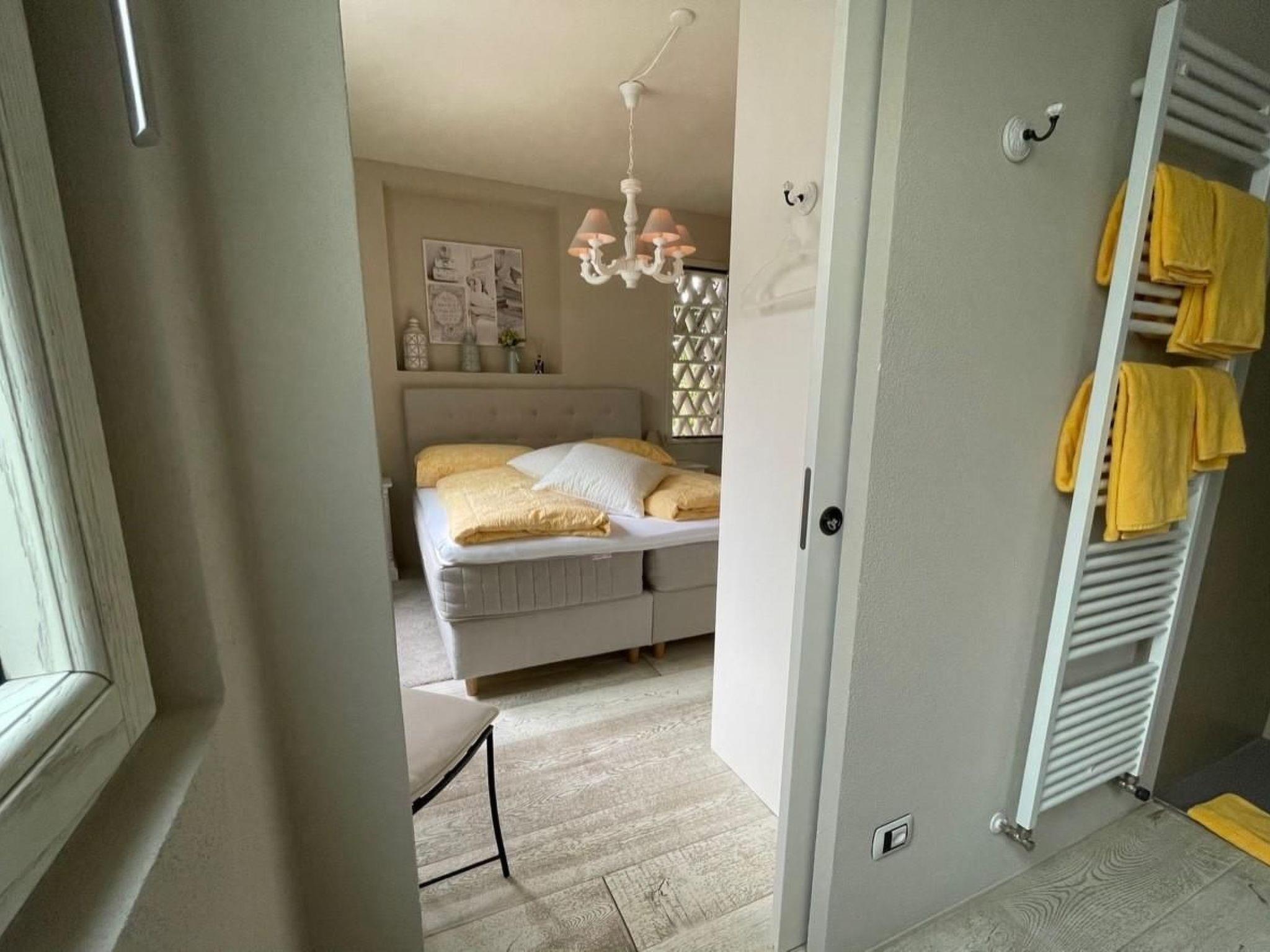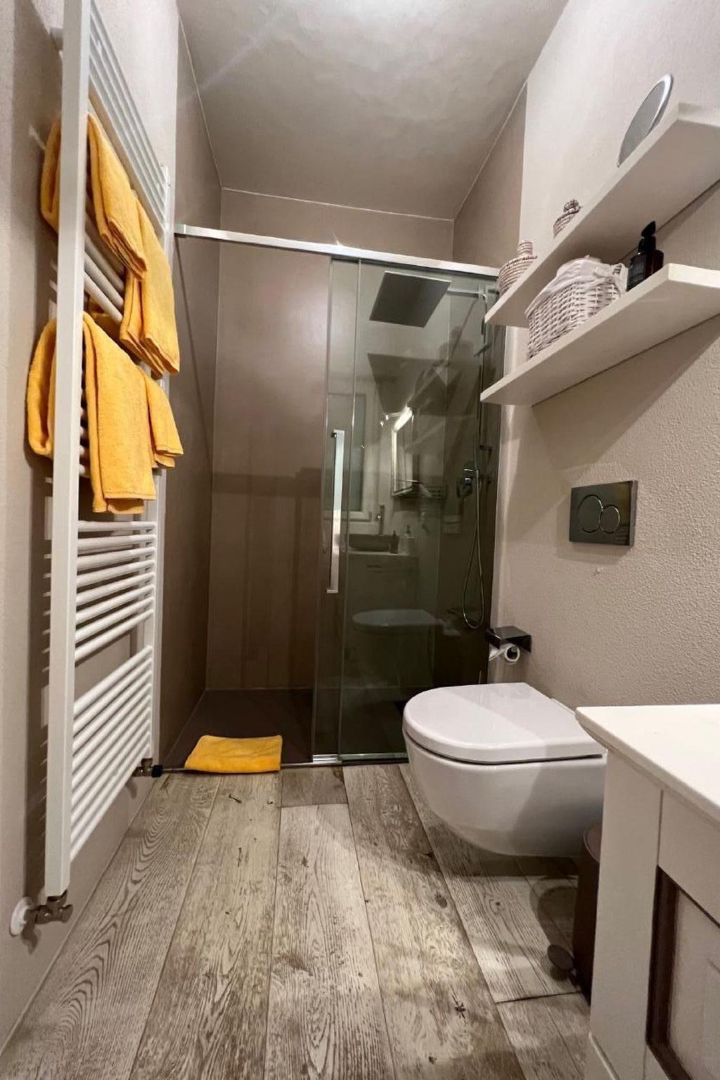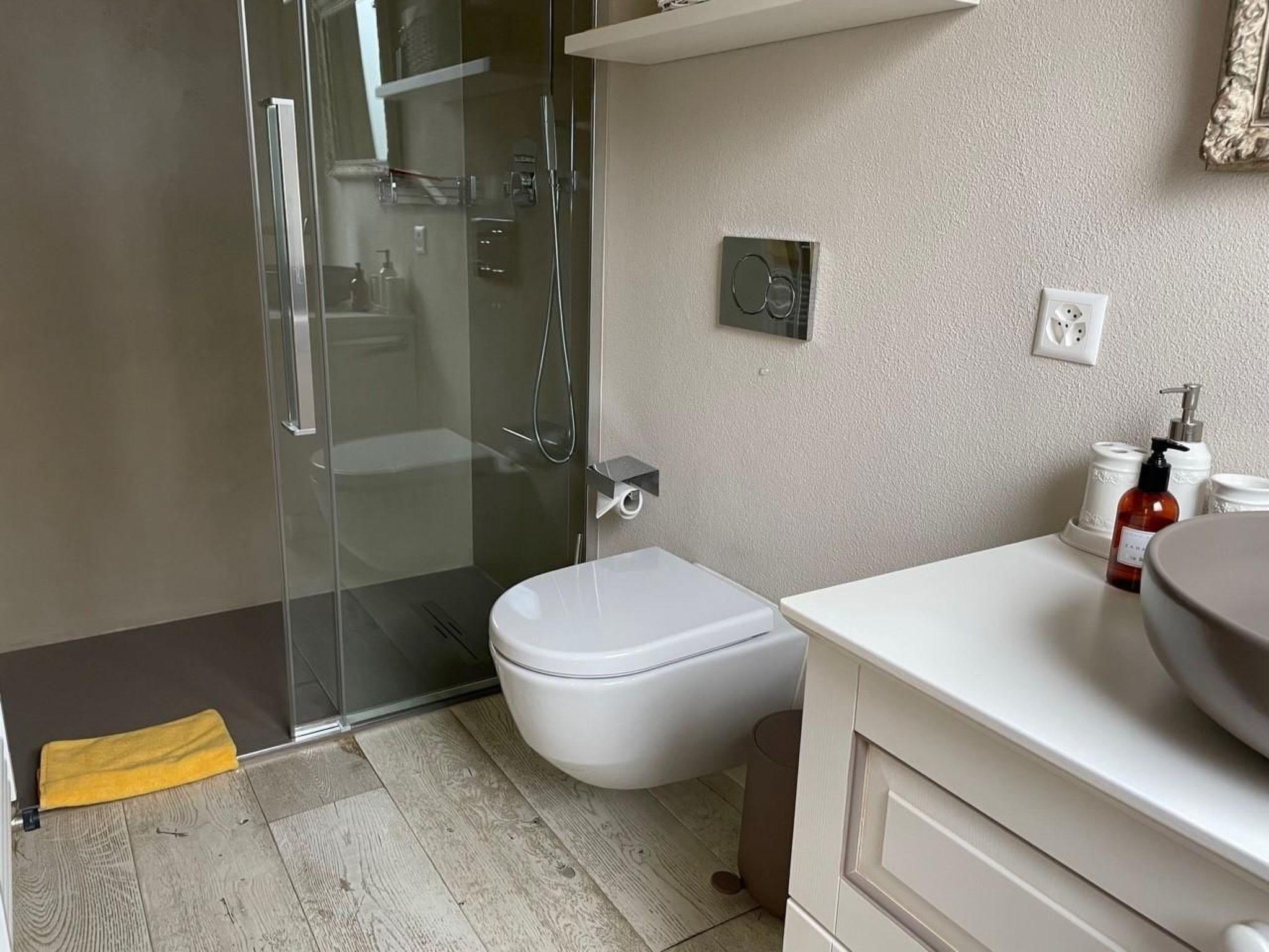 The interior leaves nothing to be desired: A spacious, bright living area with an open-plan kitchen in conservatory style, equipped with glass fronts that can be opened and a direct exit to the terrace. A Ticino-style fireplace ensures cosiness whatever the weather. In addition, all three bedrooms have comfortable box-spring beds, each with its own bathroom and direct access, which emphasises privacy. A guest toilet and a laundry room with washing machine and tumble dryer in the entrance area round off the offer.