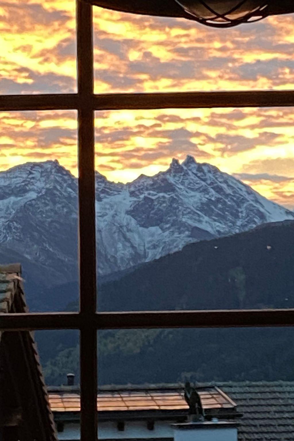 The outdoor area of the holiday flat with its balcony with wind protection offers views over the roofs to the mountains and the ski slopes.
