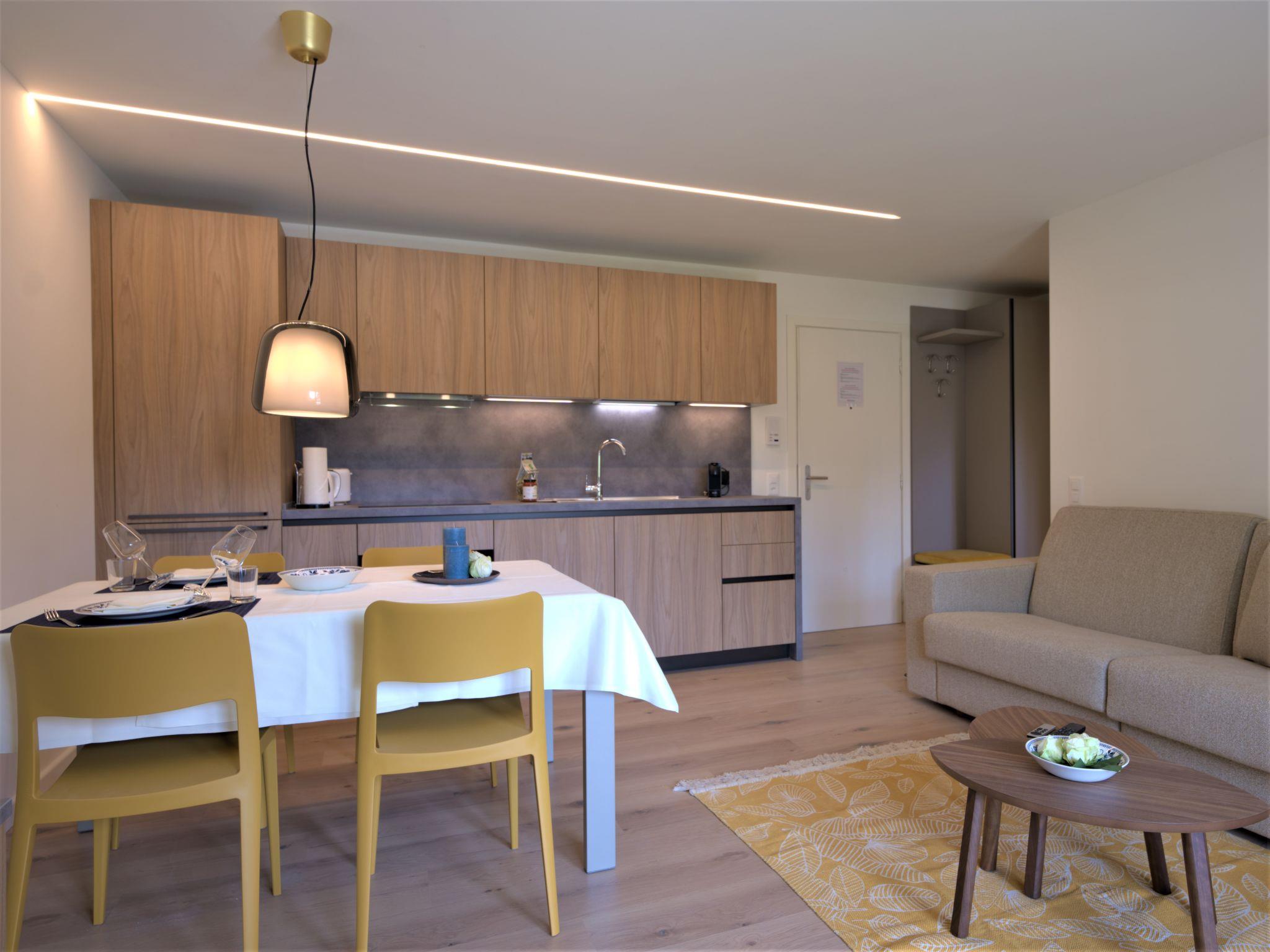 "Chesa Stè 8", 2-room apartment 40 m2 on 2nd floor. Spacious and bright, fully renovated in 2021, modern and tasteful furnishings: living/dining room with dining table and TV (flat screen). Exit to the balcony. 1 double bedroom with 1 french bed (1 x 160 cm, length 200 cm). Open kitchen (oven, dishwasher, 4 induction hot plates, toaster, kettle, freezer, electric coffee machine, Capsules for coffee machine (Nespresso) extra, fondue Set (cheese)). Shower/bidet/WC. Heating. Small balcony. Balcony furniture. Very beautiful view of the mountains and the countryside. Facilities: hair dryer. Internet (WiFi, free). Garage space n Apt. 8 (1 car), height 200 cm, width 210 cm. Please note: non-smokers only, non-smoking house. Maximum 1 pet/ dog allowed. No lift.