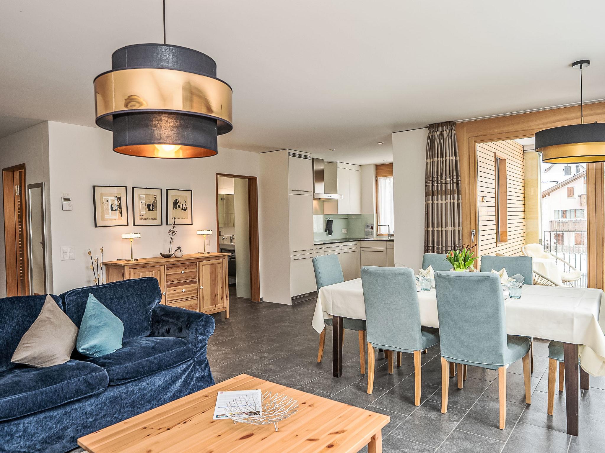 "Chesa Chalcherin 3", 3-room apartment 98 m2 on 1st floor. Spacious and bright, comfortable and modern furnishings: open large living/dining room with dining table and TV (flat screen). Exit to the loggia. 1 double bedroom with 1 french bed (1 x 160 cm, length 200 cm). 1 double bedroom with 1 french bed (1 x 160 cm, length 200 cm). Open kitchen (oven, dishwasher, 4 ceramic glass hob hotplates, toaster, kettle, freezer, electric coffee machine, Capsules for coffee machine (Nespresso) extra, raclette grill, fondue Set (chinoise, cheese)). Shower/WC, bath/shower/WC. Heating. Balcony. Balcony furniture. Beautiful view of the mountains and the resort. Facilities: washing machine, dryer, hair dryer. Internet (WiFi, extra). Garage space n 3 (1 car) at the house, height 200 cm, width 230 cm. Please note: suitable for families. Non-smokers only, non-smoking house. Maximum 2 pets/ dogs allowed.