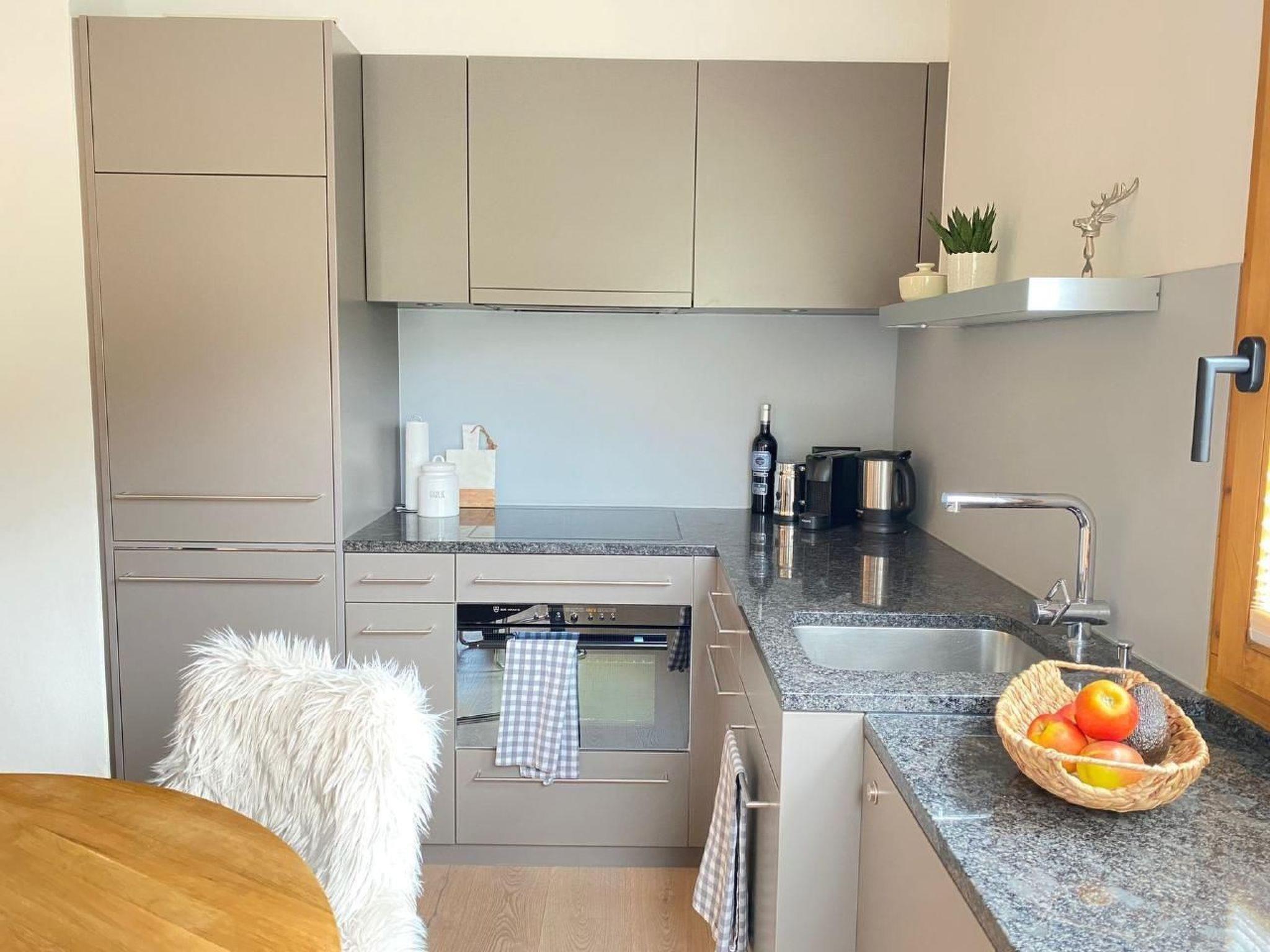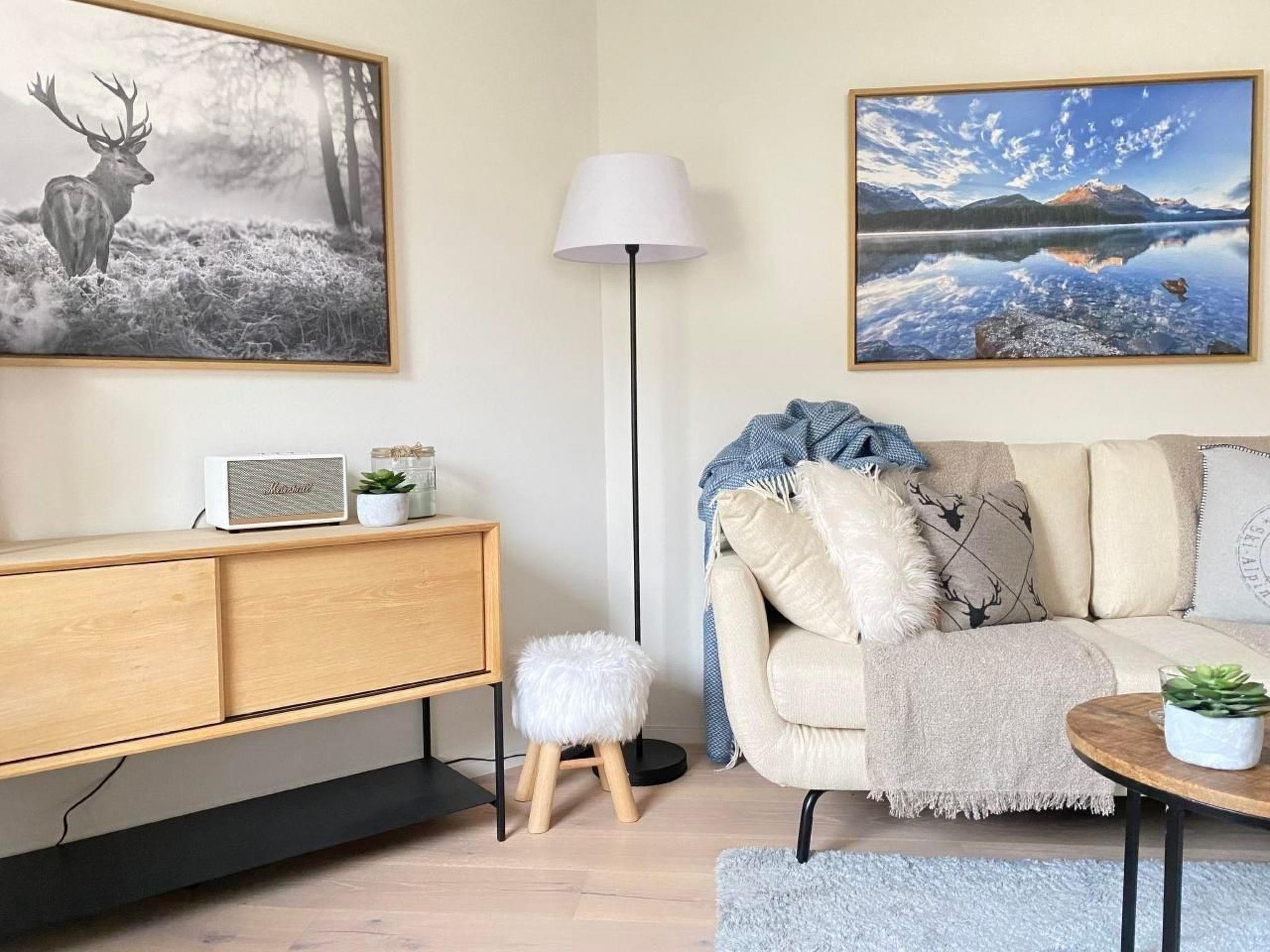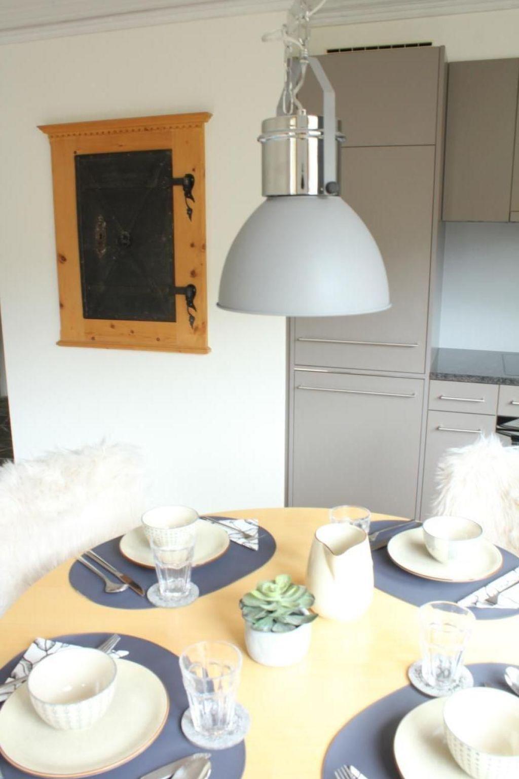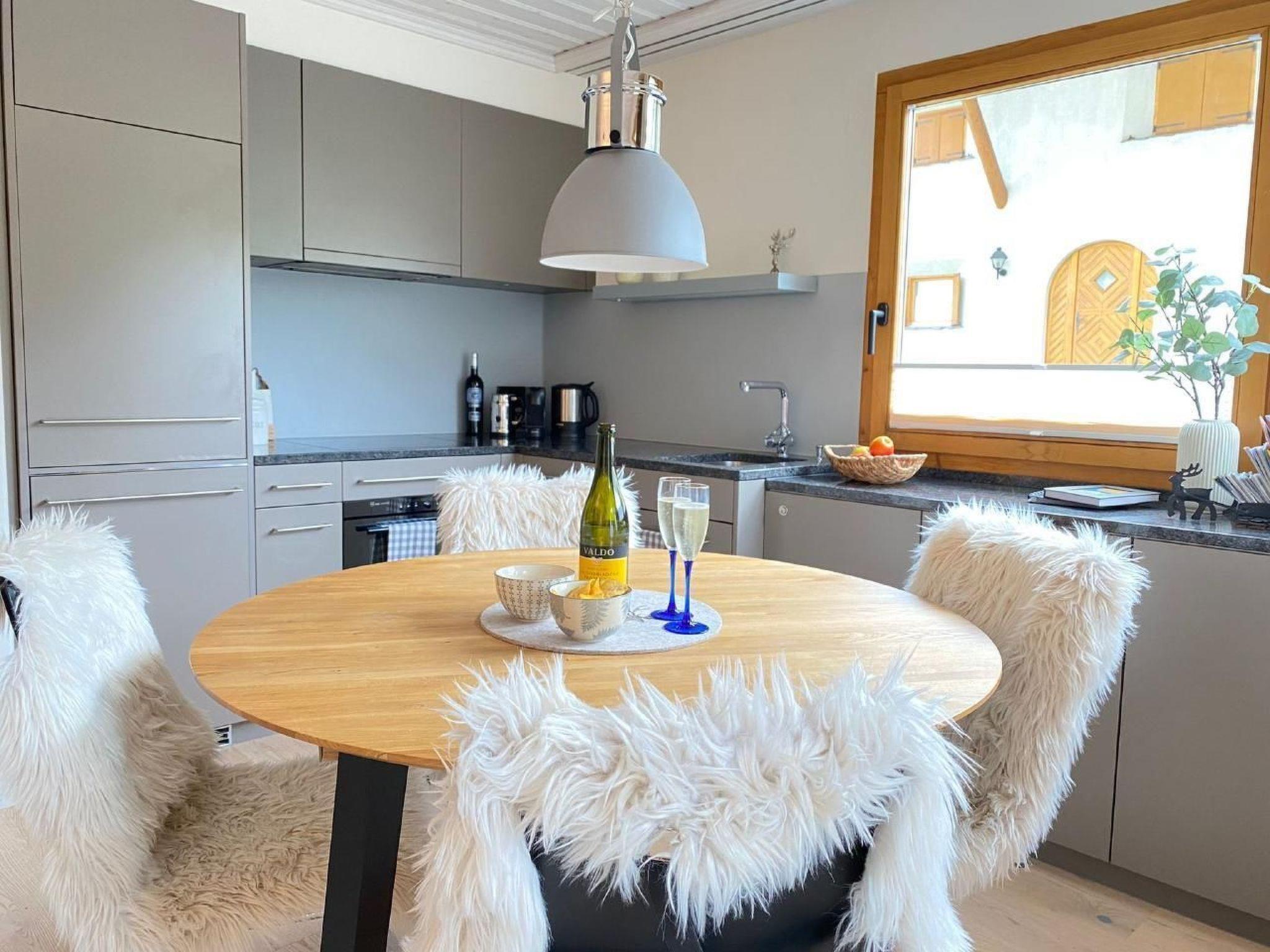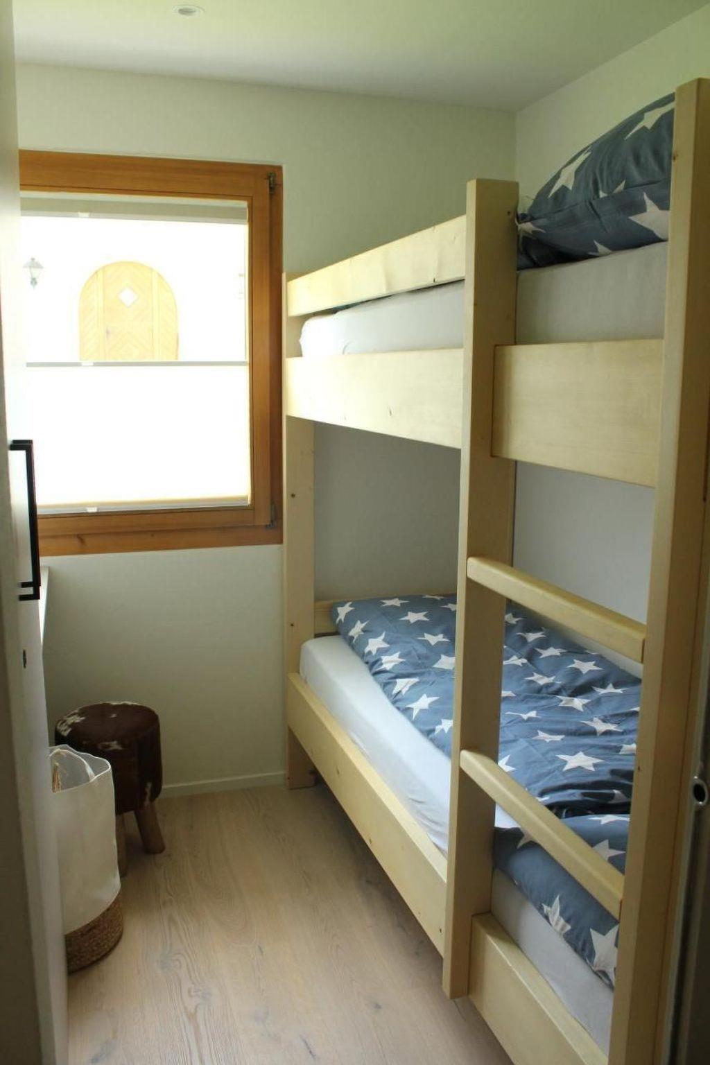Inside, modern comfort awaits you with two small but cosy bedrooms, furnished with a comfortable double bed (160x200cm) and a bunk bed (2x 80x200cm). The generously sized built-in wardrobes and bed drawers offer plenty of space for clothes, sports equipment and luggage. A bright living/dining room with a table for four and a contemporary fitted kitchen with high-quality equipment - including Nespresso machine, milk frother, toaster, raclette oven and fondue set - makes your stay particularly pleasant. A bathroom with bathtub, WC, washbasin, towel warmer, hairdryer and window rounds off the interior.