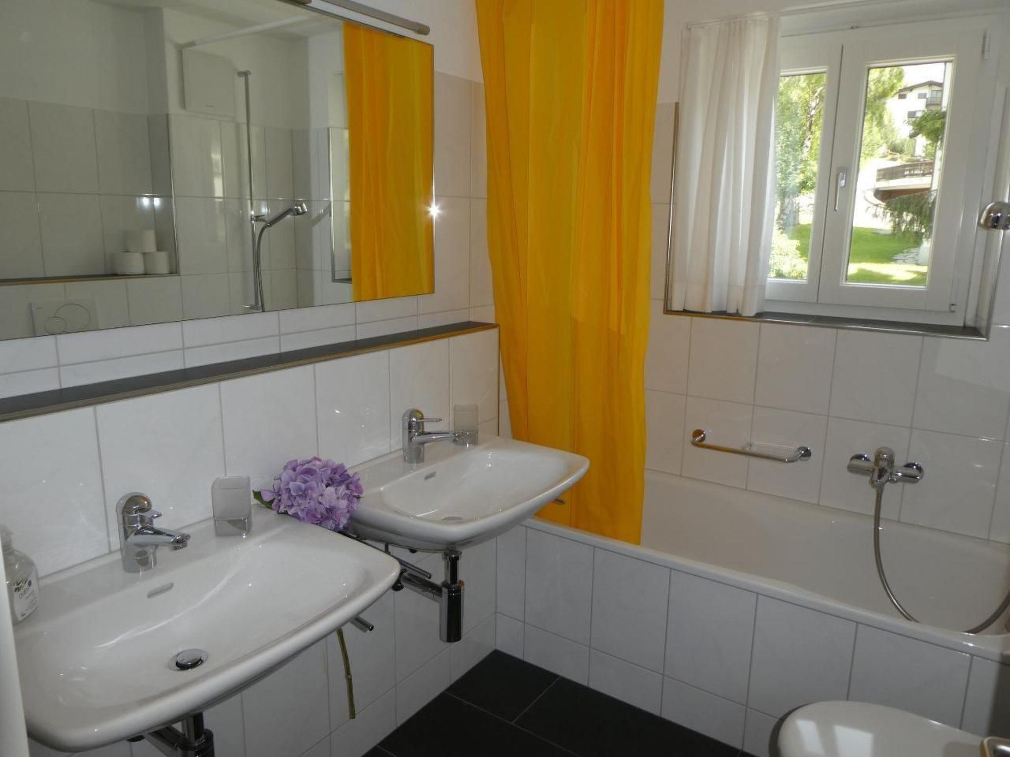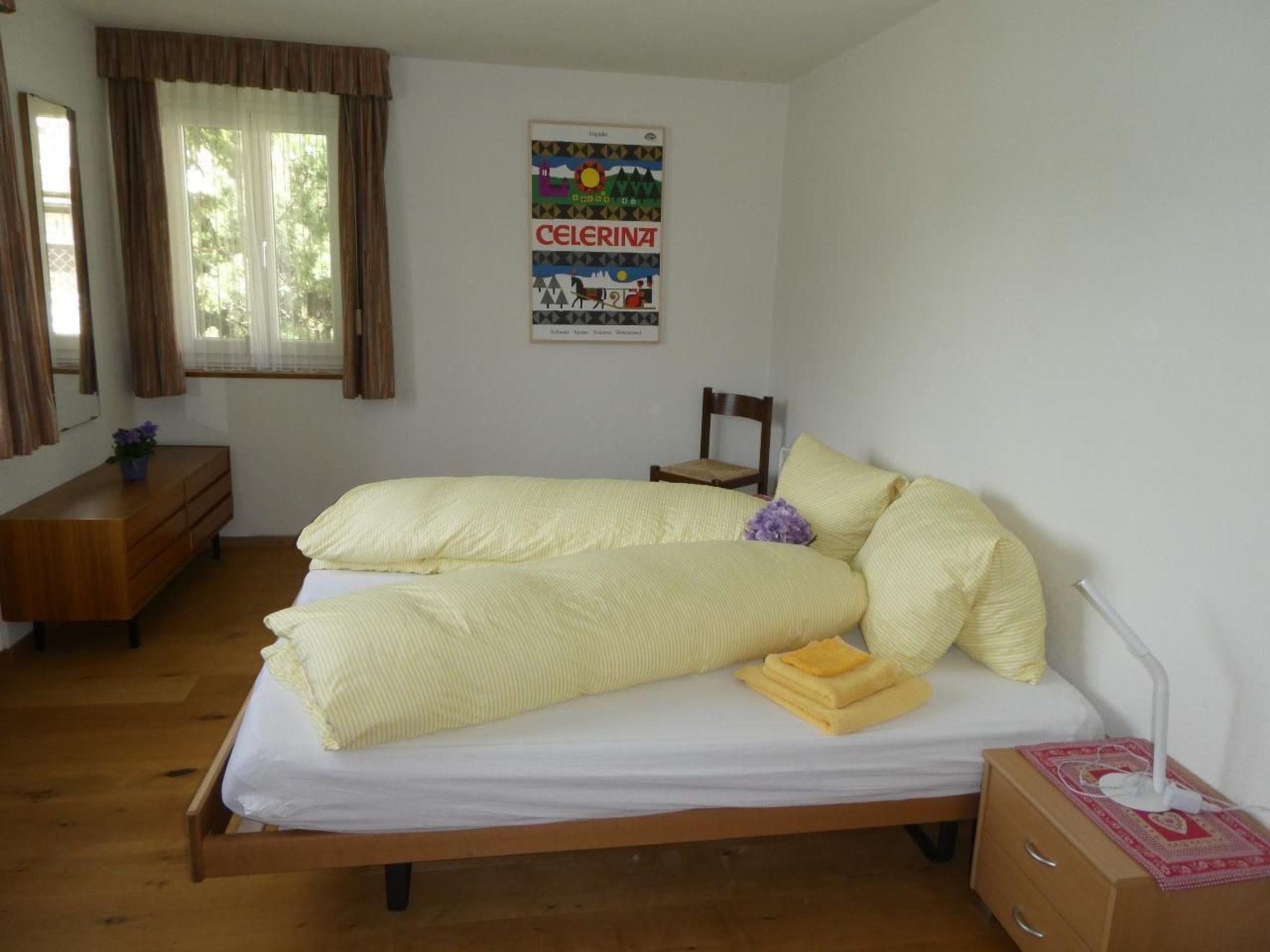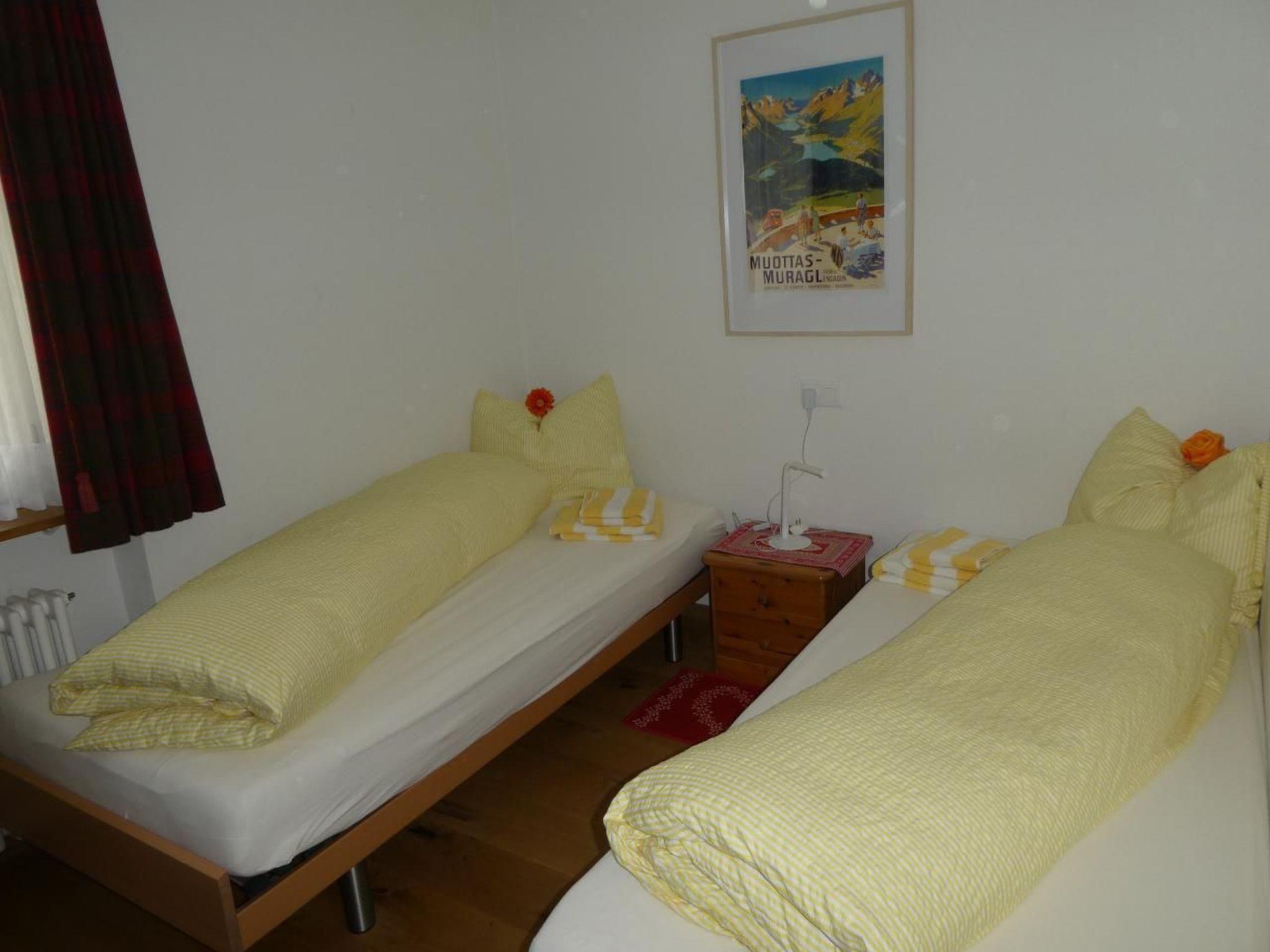 4-room apartment on the 1st floor 3 x 2 beds in 3 bedrooms. In 2 rooms 2 beds put together as a double bed, in one room 2 single beds. All Nordic equipment. A travel cot can also be provided on request. The living room has a balcony with beautiful views, over the village of Celerina. Likewise, in the apartment it has telephone Wi-Fi, satellite TV and radio. The seating-dining area invites you to a cozy get-together.It has a bathroom with toilet, 2 washbasins and a bathtub, a small bathroom with toilet and washbasin, and a bathroom with shower and washbasin. The apartment has a wooden floor as well as laminate flooring. In the entrance area it has a stone floor. The kitchen is equipped with steam extractor and dishwasher, Nespresso coffee machine and kettle are available.