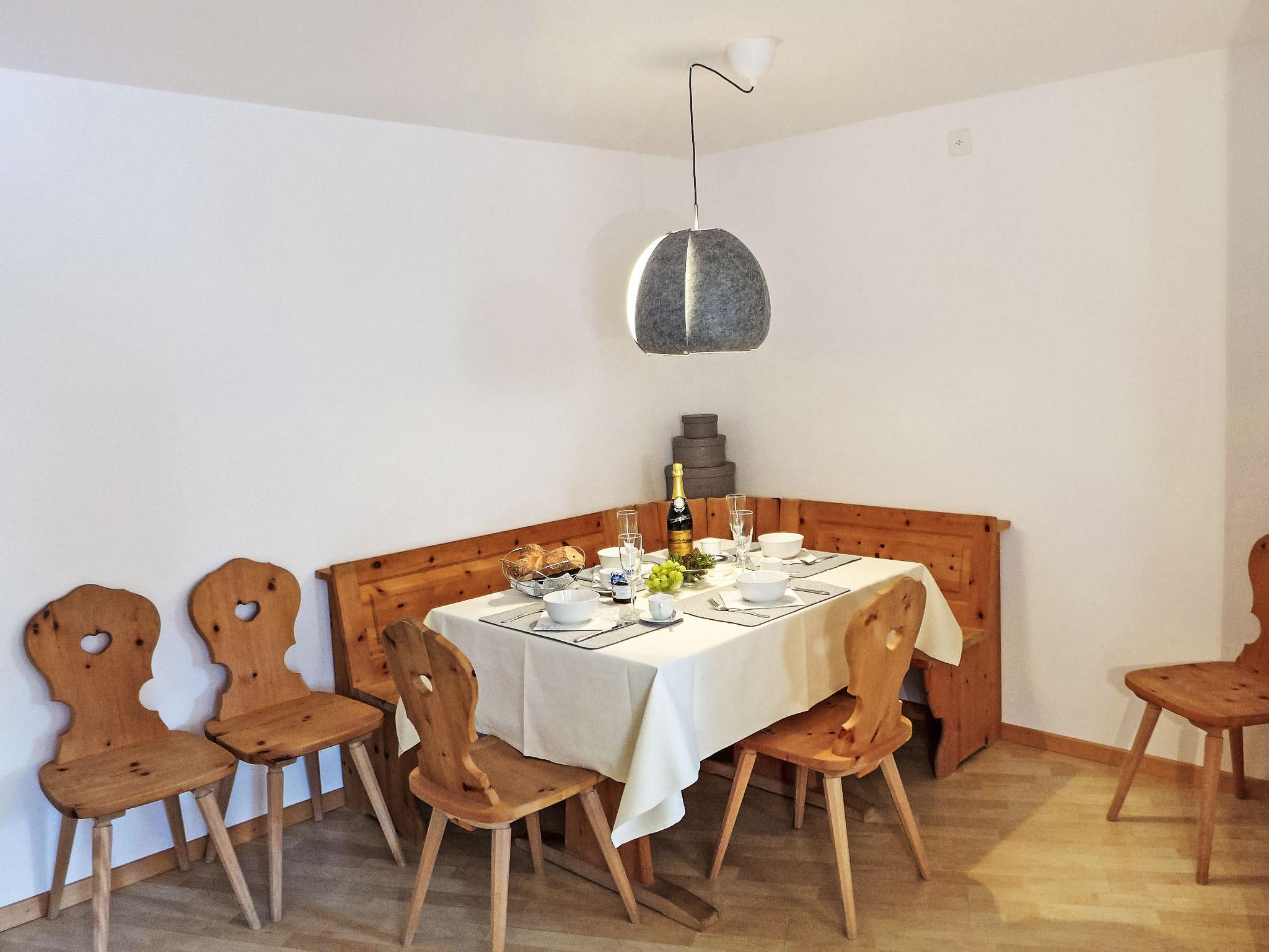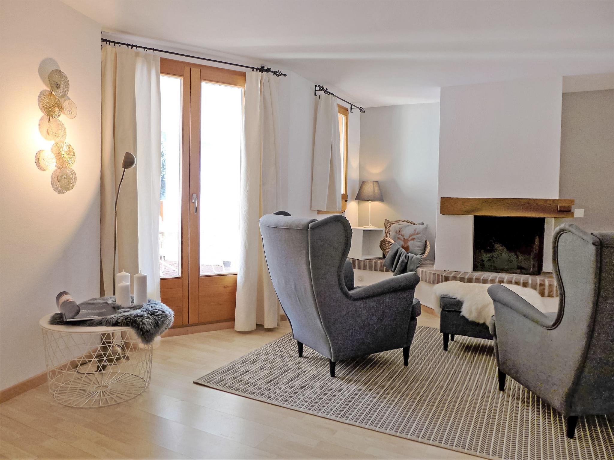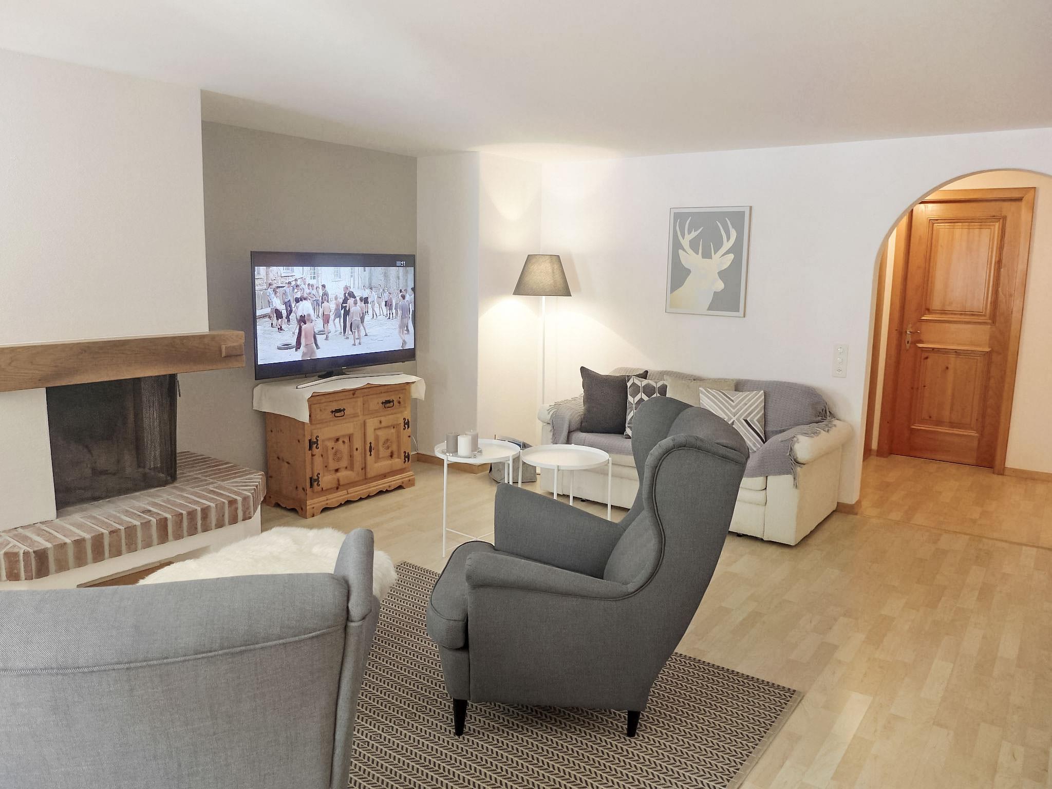 "Chesa Fuolla Verda A8", 4-room apartment 100 m2 on 1st floor. Spacious and bright, comfortable and cosy furnishings: living/dining room with open-hearth fireplace and TV (flat screen). Exit to the balcony, south facing position. 1 large double bedroom, window onto the courtyard with 1 french bed (2 x 80 cm, length 200 cm). 1 room, window onto the courtyard with 2 beds (90 cm, length 200 cm). 1 children's room, window onto the courtyard with 1 x 2 bunk beds (90 cm, length 190 cm). Open kitchen (oven, dishwasher, 4 ceramic glass hob hotplates, toaster, kettle, electric coffee machine, Capsules for coffee machine (Nespresso) extra, fondue Set (cheese)). Bath/WC, shower/WC. Balcony furniture. Beautiful view of the mountains and the countryside. Facilities: iron, hair dryer. Internet (WiFi, free). Garage space n 13/A8, height 220 cm, width 210 cm. Please note: suitable for families. Non-smokers only, non-smoking house. Maximum 1 pet/ dog allowed.